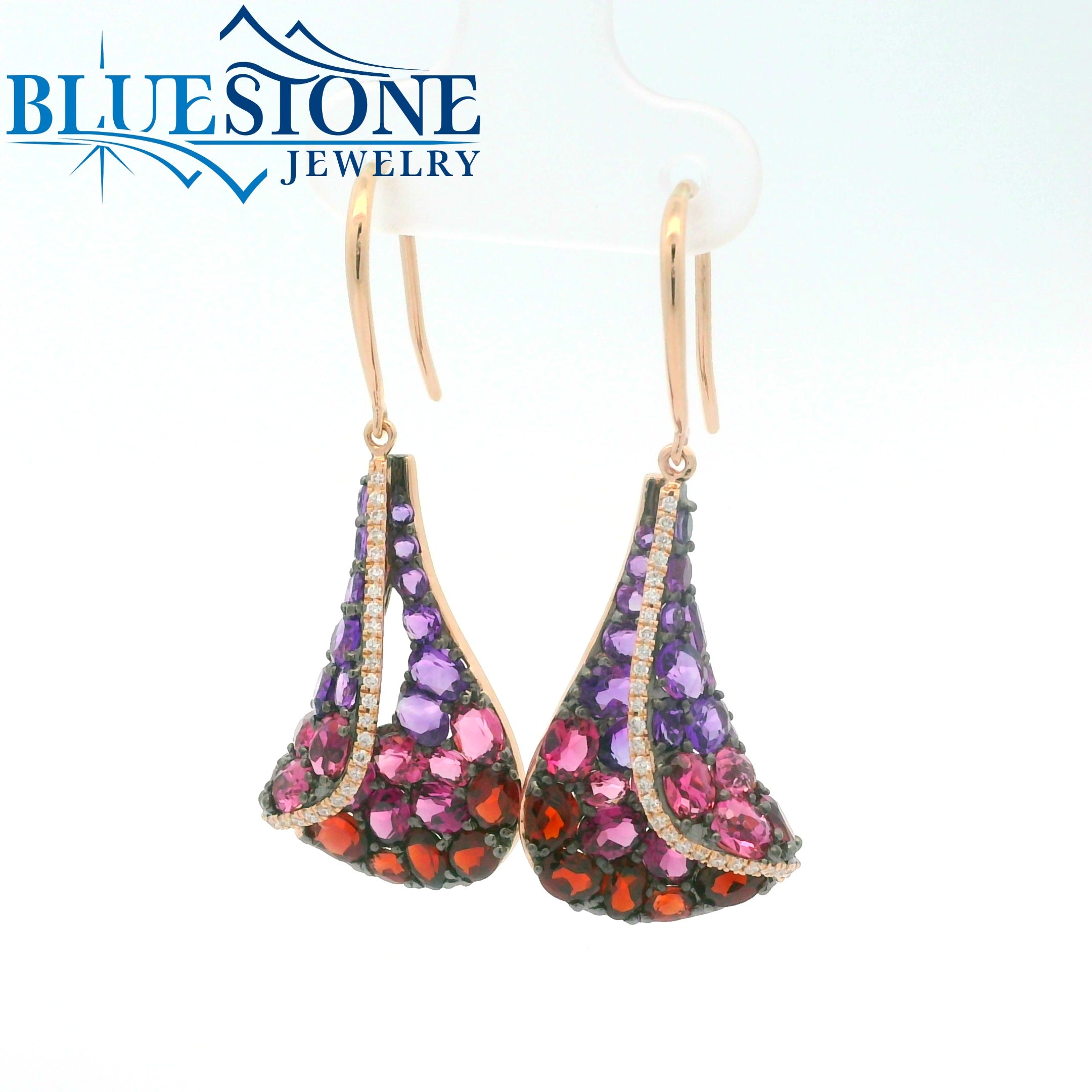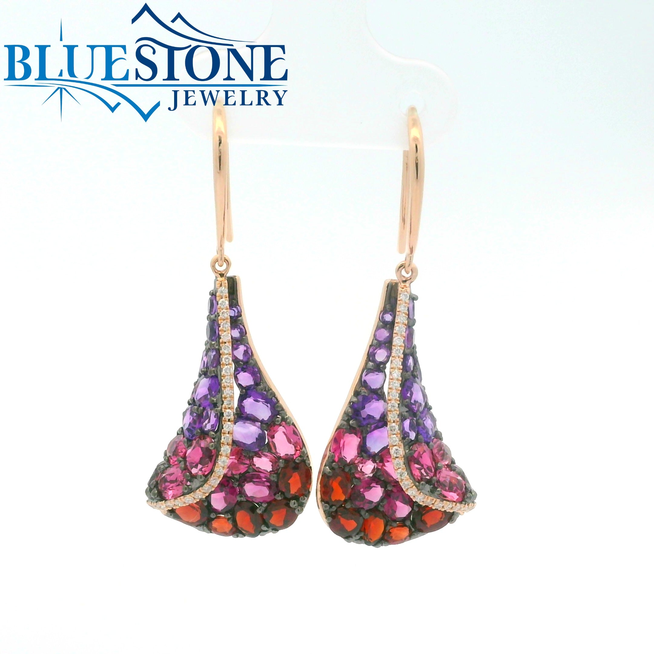 14 Karat Rose Gold Earrings with 30 Amethyst at 2.02 Carats Total Weight, 10 Garnets at 1.94 Carats Total Weight,14 Pink Tourmalines at 2.18 Carats Total Weight, 6 Rhodolite Garnets at 1.45 Carats Total Weight and 58 Round Diamonds at 0.19 Carats Total Weight of G SI1 Quality Diamonds. Measure 1.5 Inches Long.