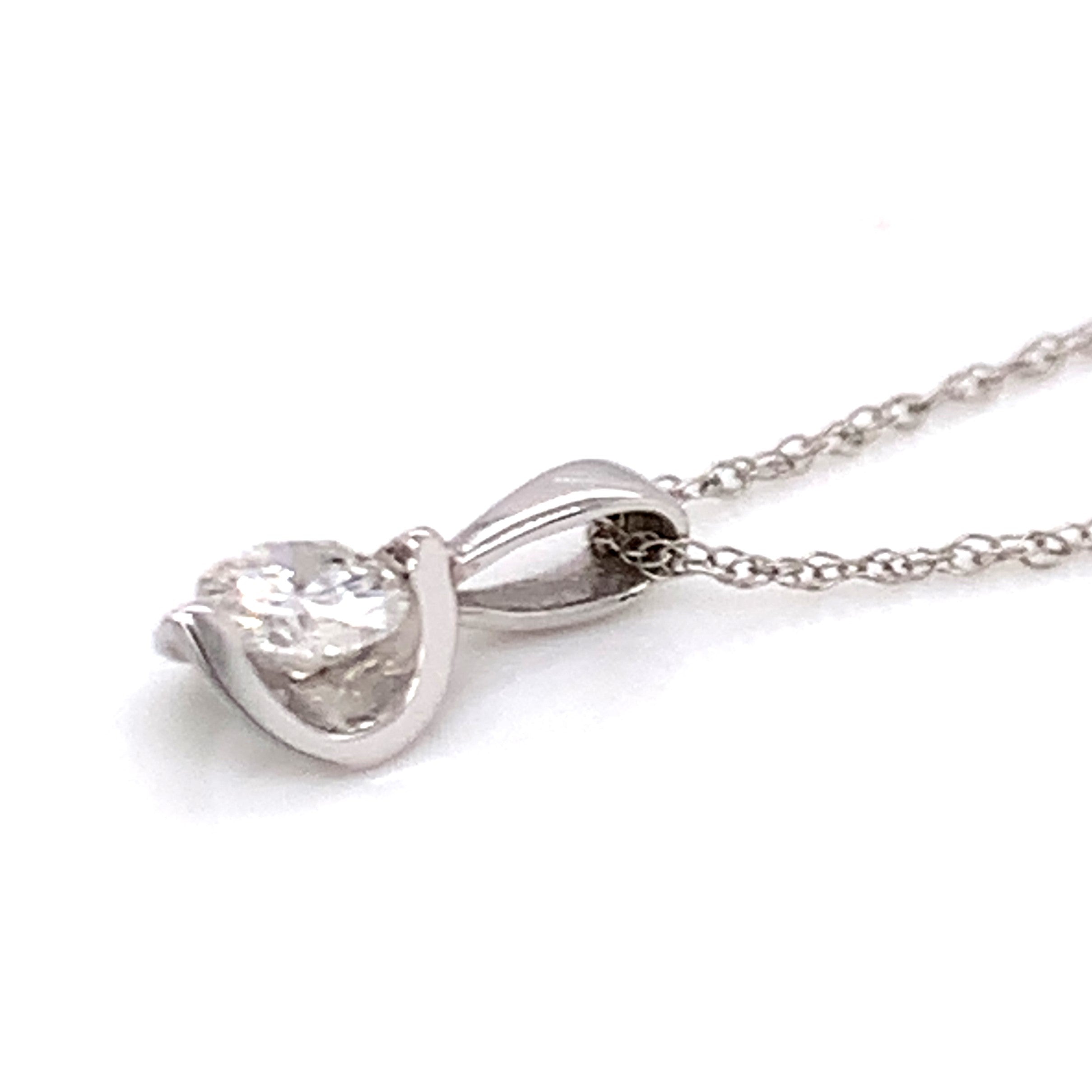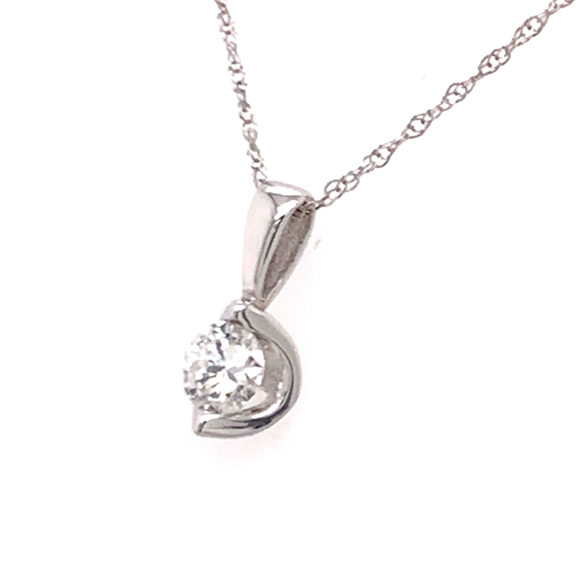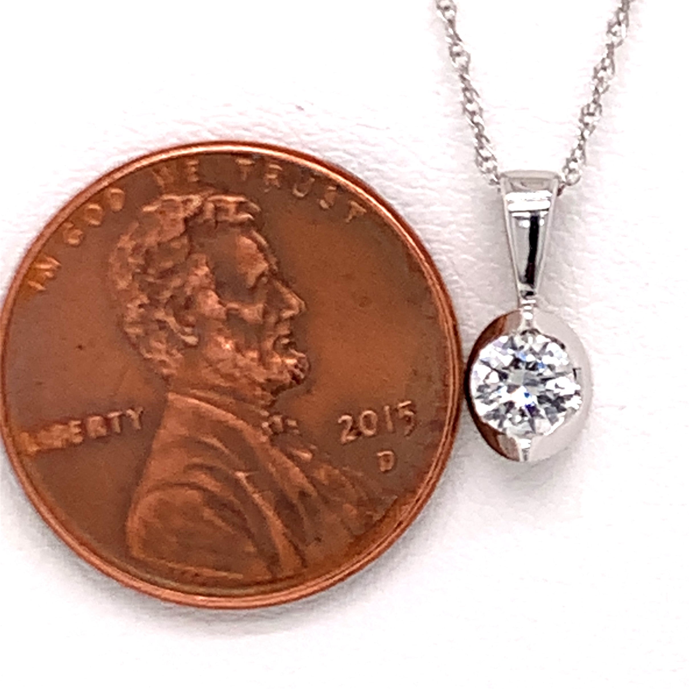 14 Karat White Gold Half Moon Pendant with a 0.25 Carat Round Diamond H Si1 Quality Diamond on a 14 Karat White Gold Rolo Chain measuring 18 inches.