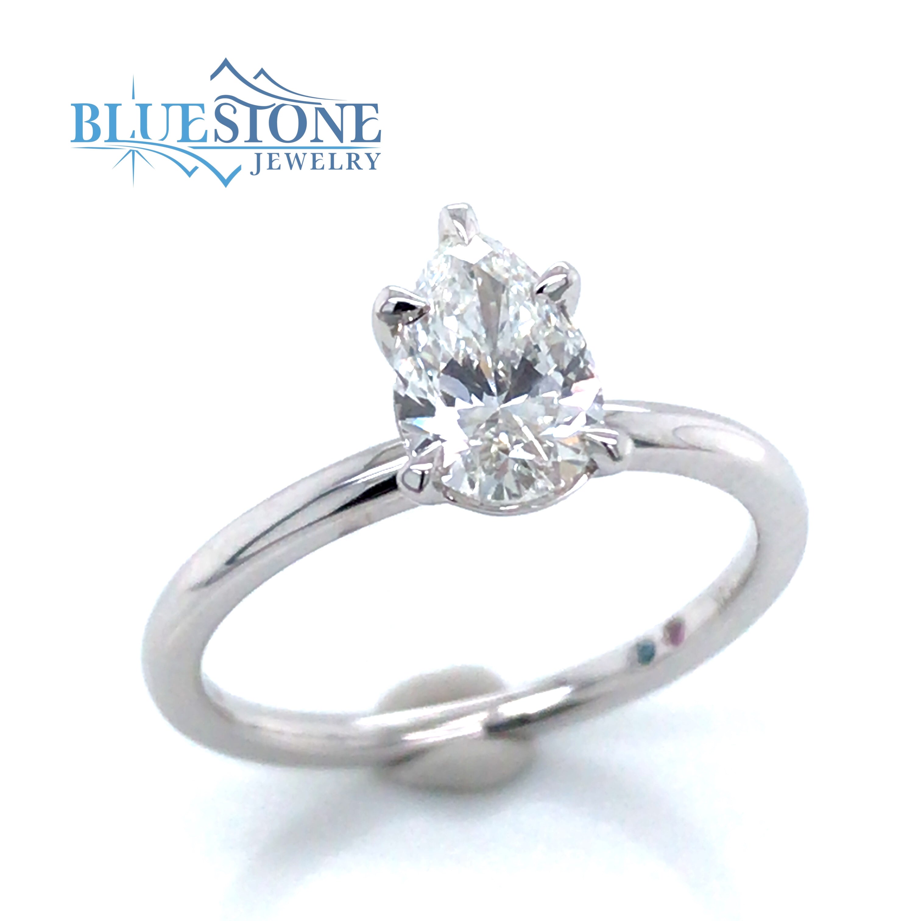 14 Karat White Gold Ring with One 5.6mm x 8.5mm 1.03 Carats Pear Cut Lab Created Diamond SI1 Quality and 2 Hidden Colored Lab Created Diamonds (Pink and Blue) at 0.01 Total Carat Weight. 2.8 Grams Total Weight.Ring Size 7.