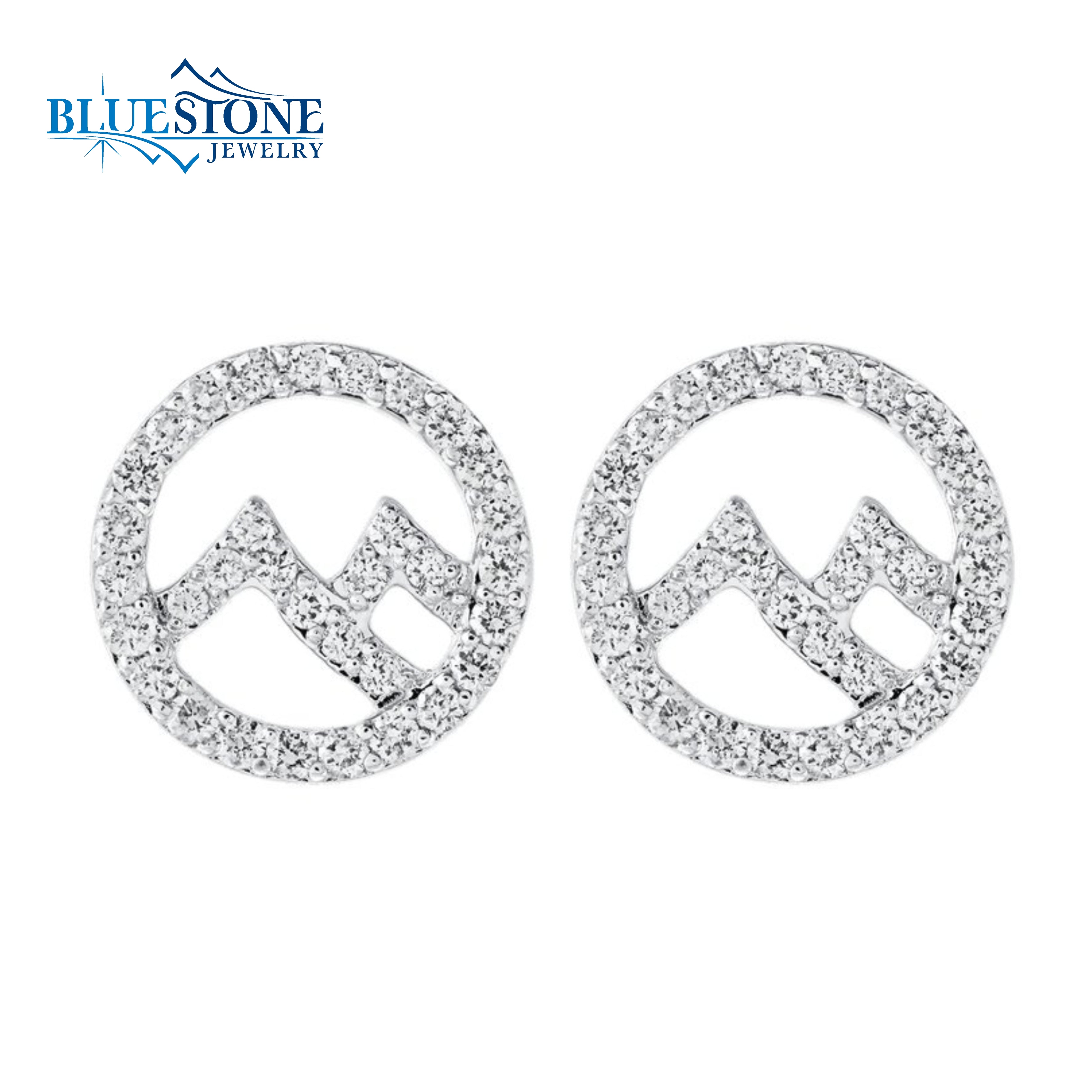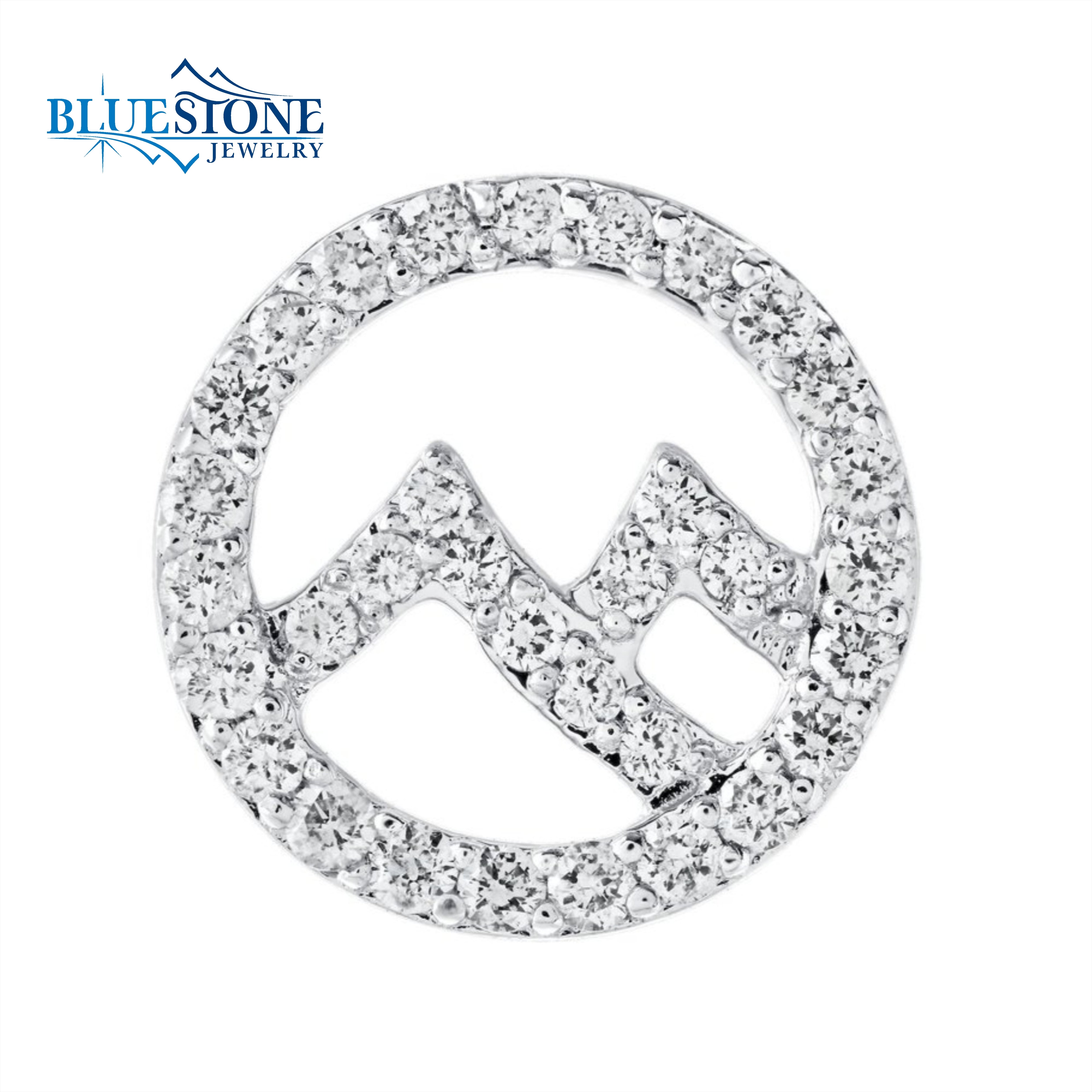 14 Karat White Gold Round Mountain Stud Earrings with 66 Round Cut G SI1 Natural Diamonds at 0.25 Total Carat Weight. Measure 9mm Wide. Chain is sold separately. Comes on a metal alloy DISPLAY chain. It is recommended to swap pendant to true chain before wear.