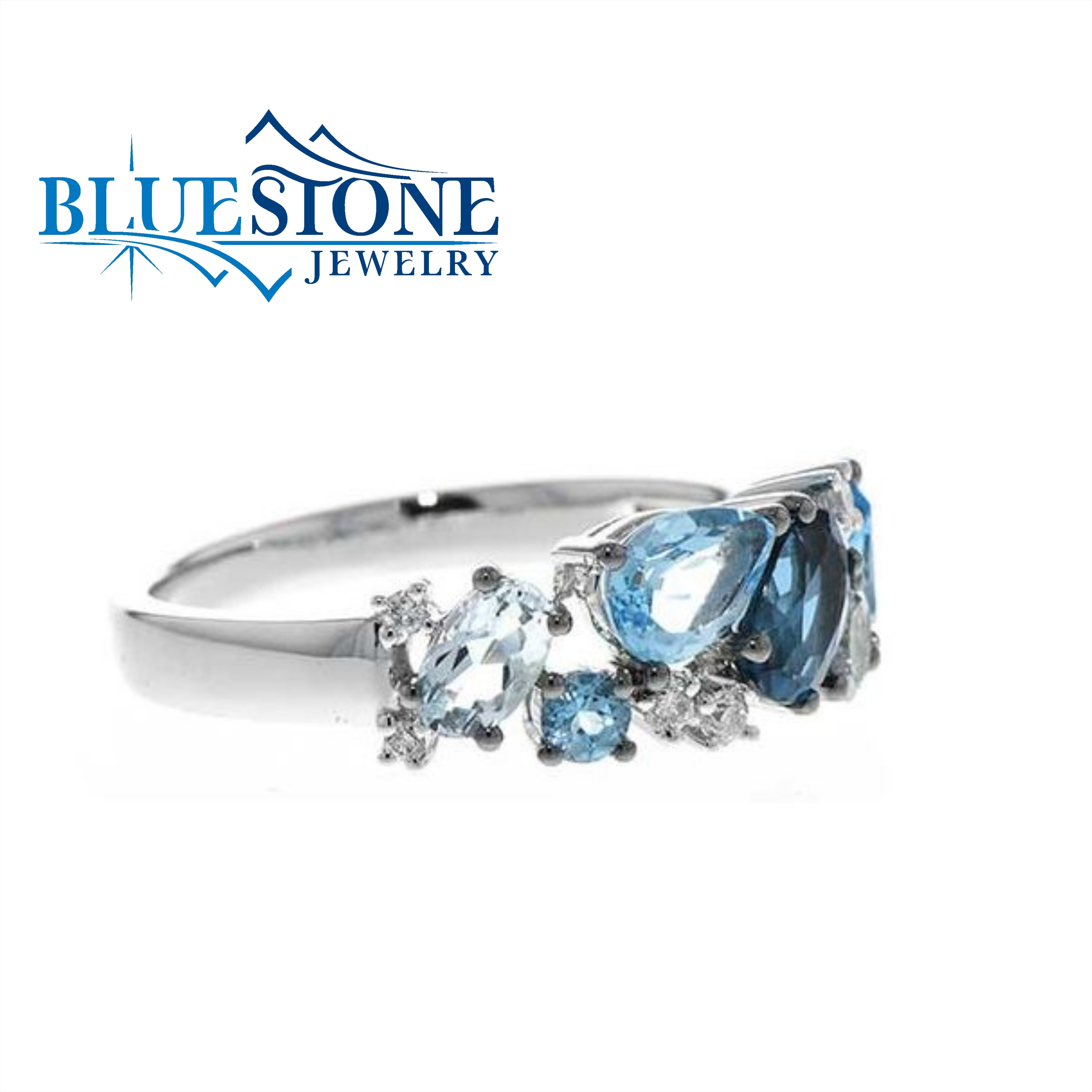 14 Karat White Gold Fashion Ring with Sky, London & Swiss Blue Topaz at 2.05 carats total weight & 7 Round Diamonds at 0.11 Carats Total Weight of G/H SI Diamonds. Ring Size 7*****Bluestone Signature Collection*****