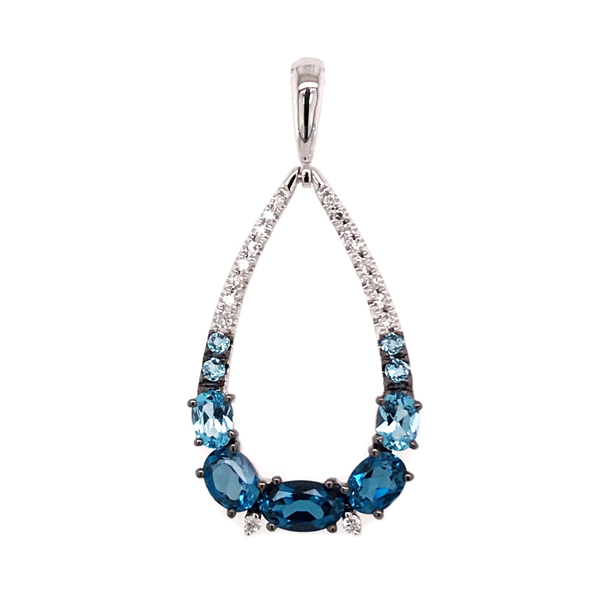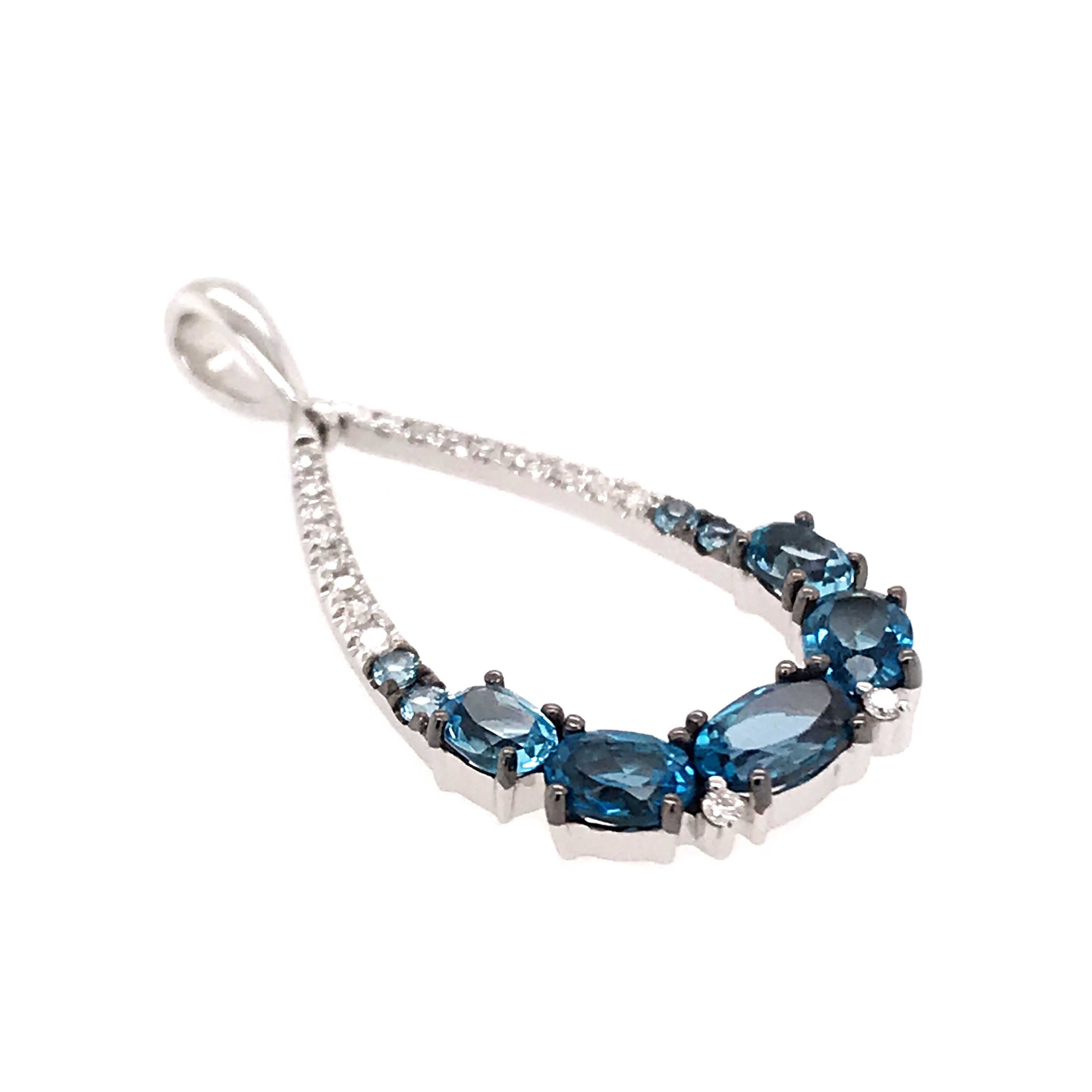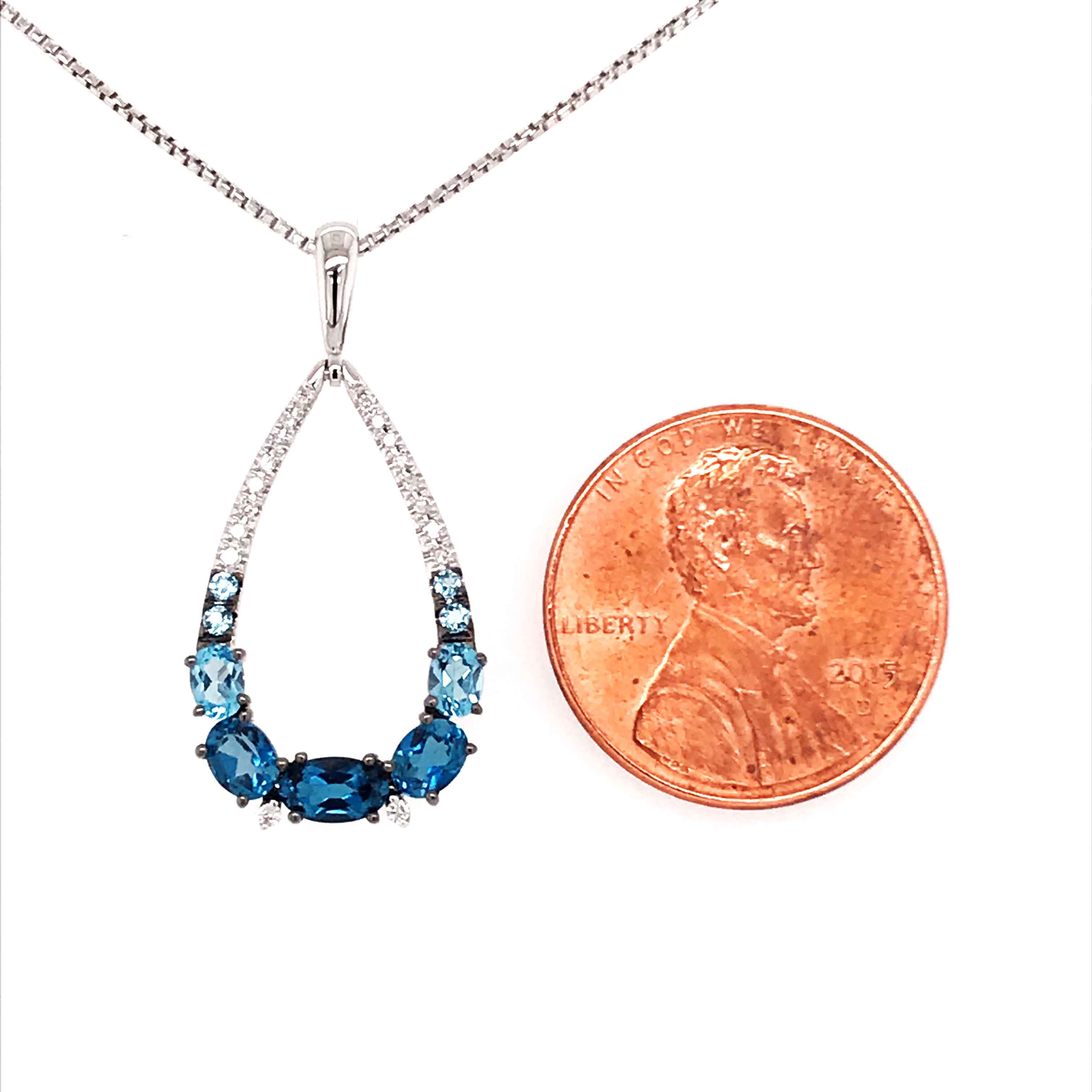 14 Karat White Gold Pendant with 3 Oval London Blue Topaz at 0.73 Carats Total Weight, 2 Oval and 4 Round Swiss Blue Topaz at 0.31 Carats Total Weight & 18 Round Diamonds at 0.06 Carats Total Weight G SI1 Quality Diamonds.Chain is sold separately. Pendant Comes on an 18 Inch Metal Alloy DISPLAY Chain. Bluestone Collection.