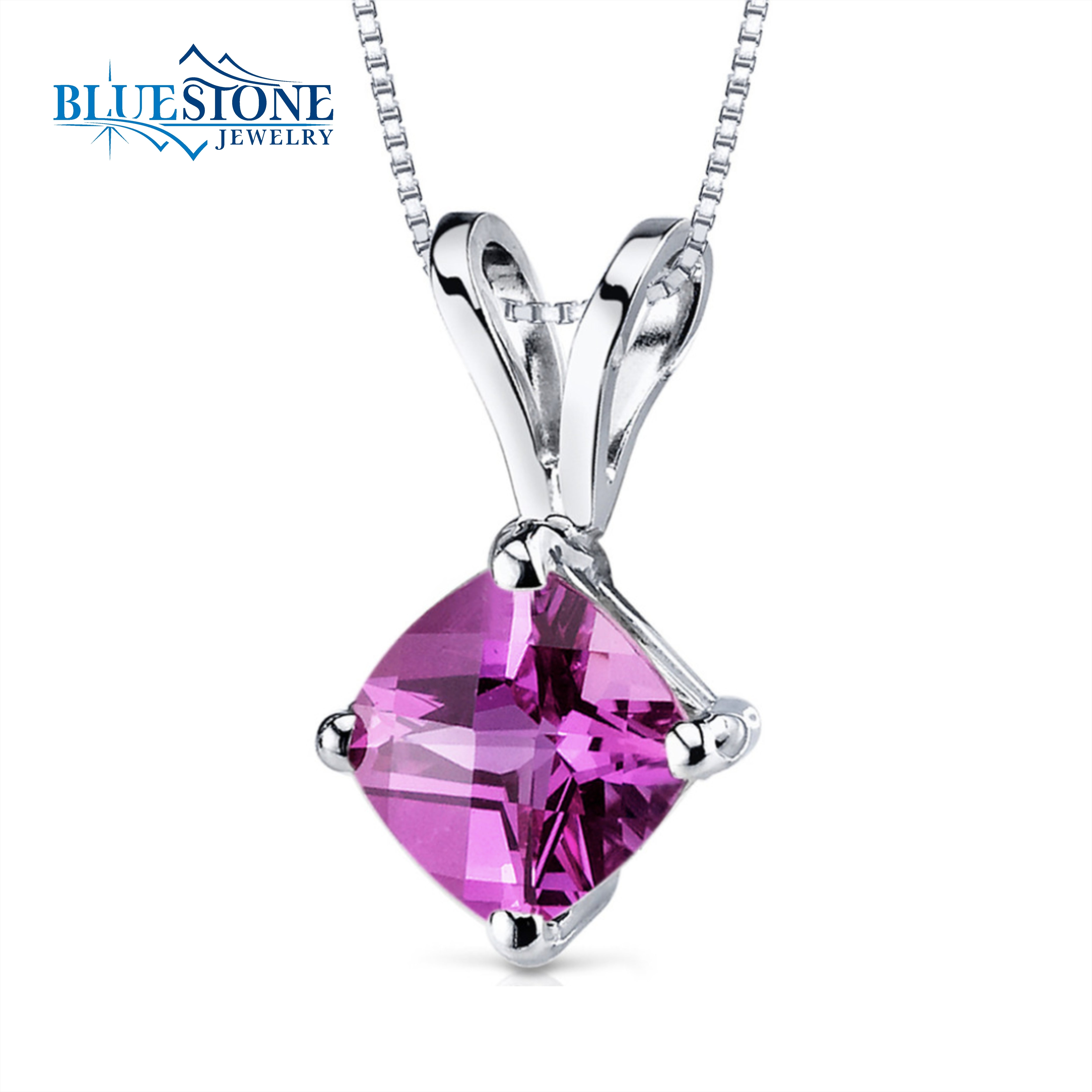 14 Karat White Gold Pendant with One 6mm Square Cushion Cut 1.00 Carat Lab Created Pink Sapphire. Chain in Sold Separately. Comes on a metal alloy DISPLAY chain.