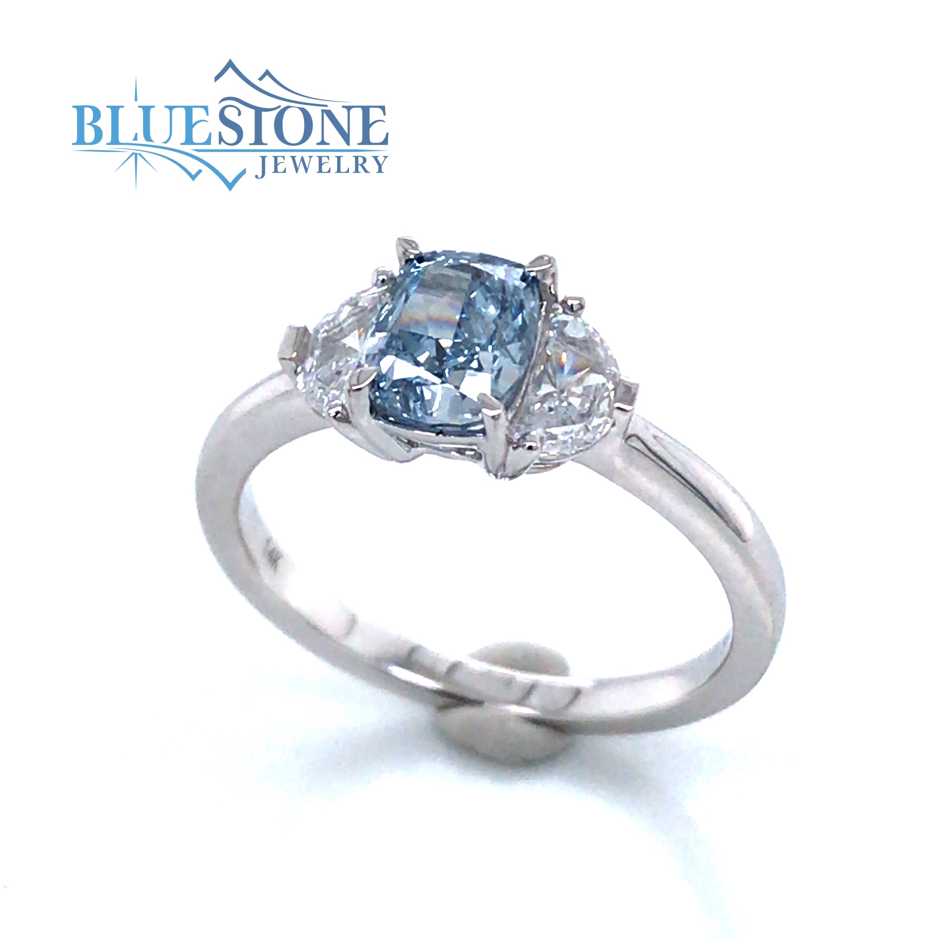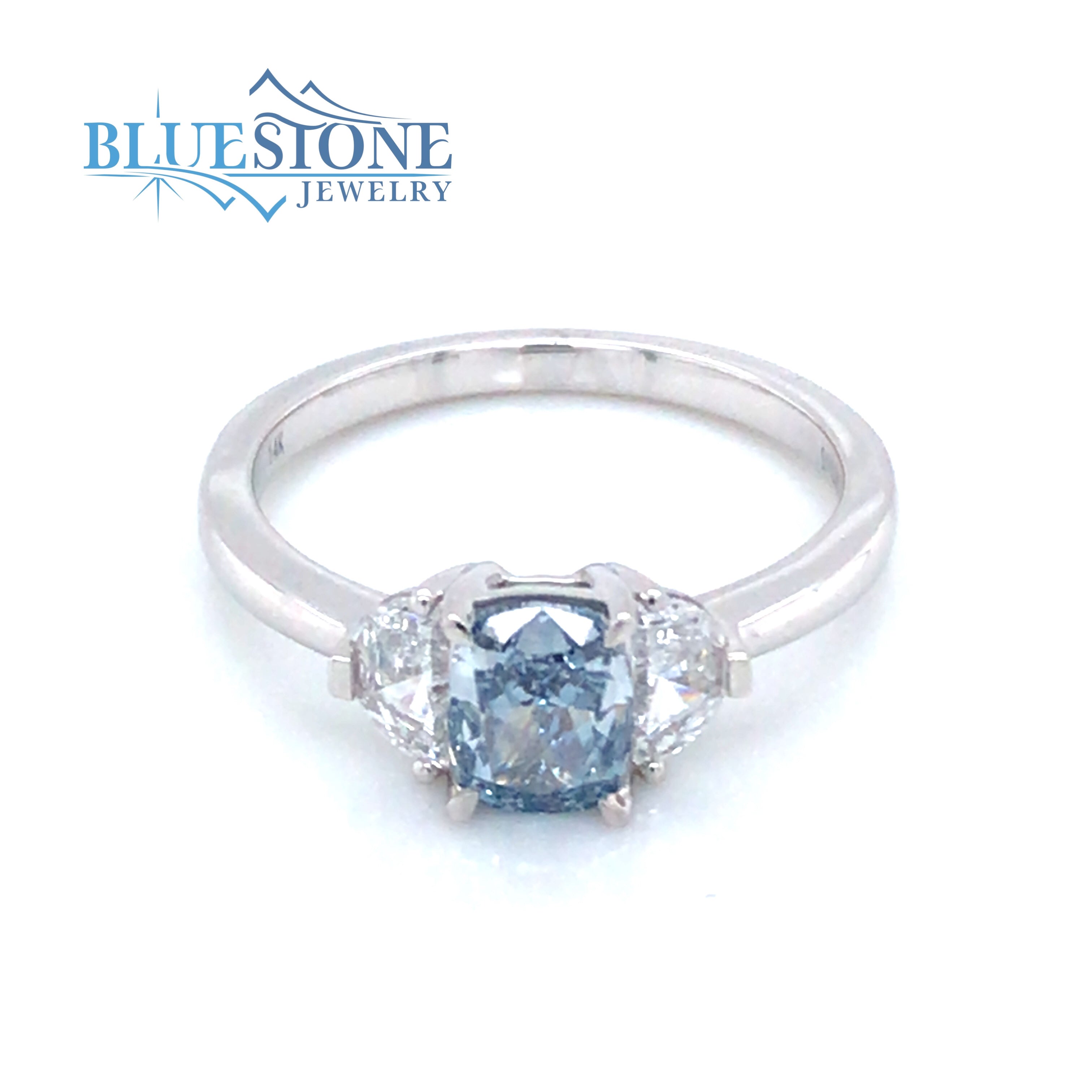 14 Karat White Gold Ring with One 5mm x 6.4mm 1.01 Carat Oval Blue Lab Created Diamond and Two Half-Moon Cut Accent Lab Created Diamonds at 0.52 Total Carat Weight.Ring Size 7.