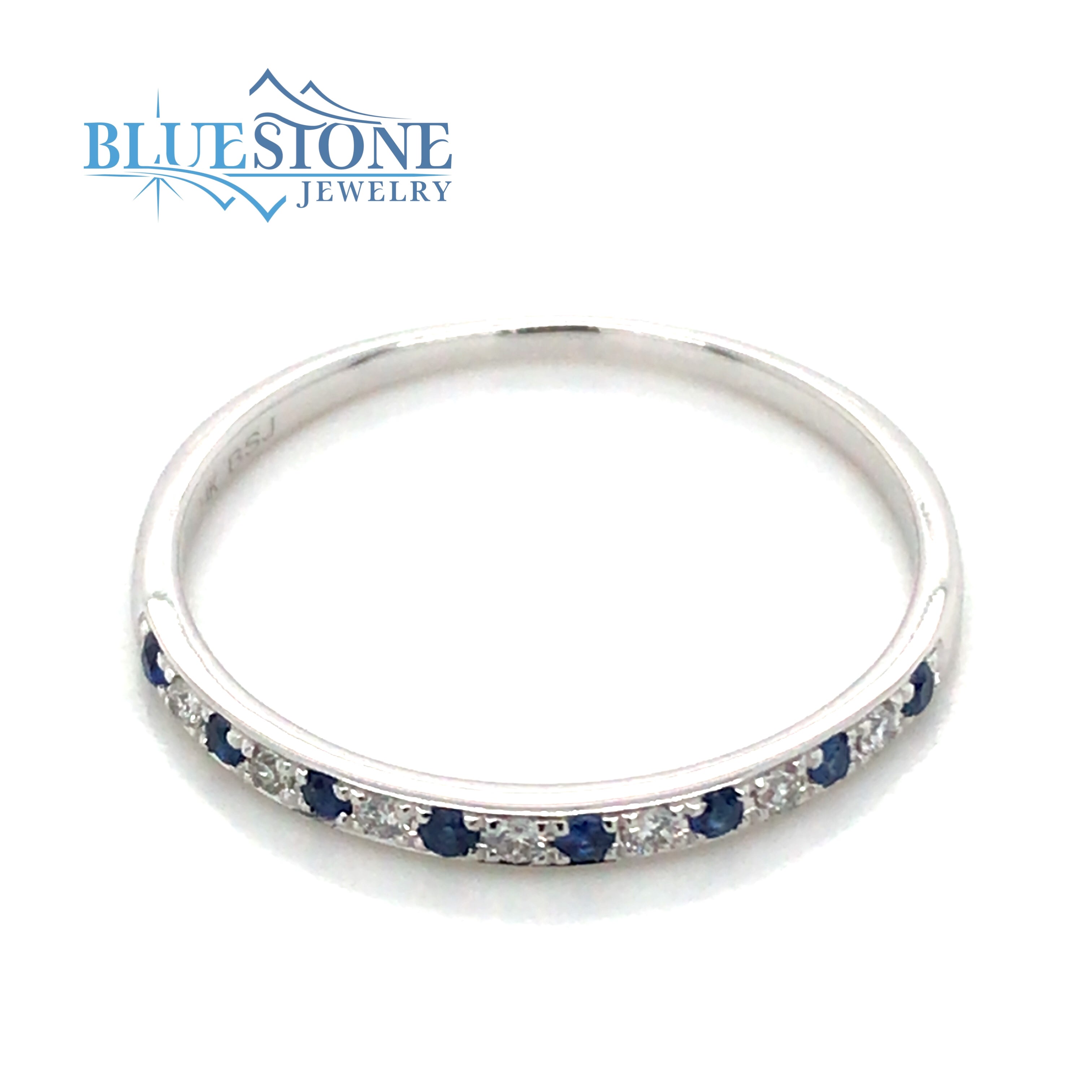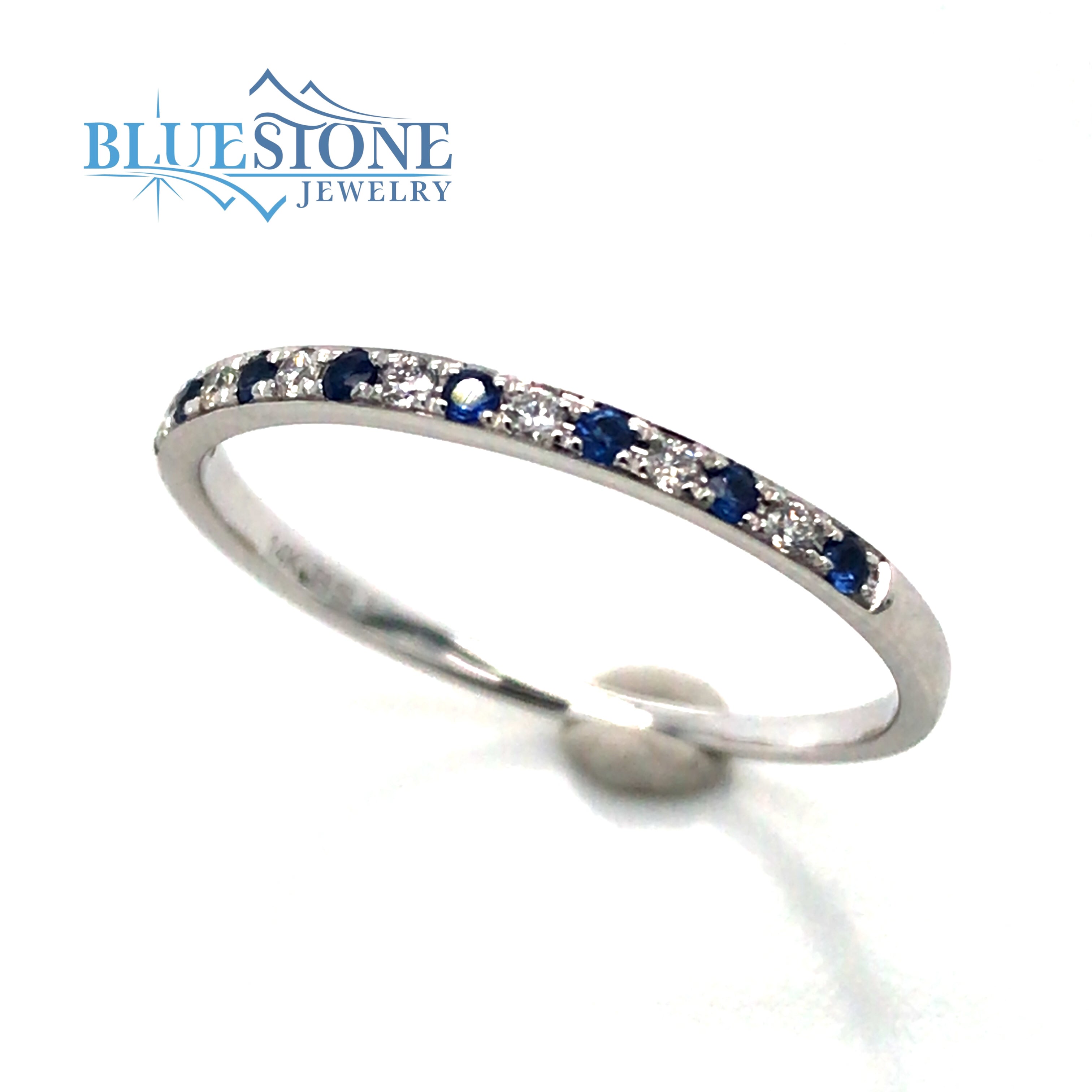 14 Karat White Gold Ring with 8 Round Blue Sapphires at 0.10 Total Carat Weight and 7 Round Diamonds at 0.06 Carats Total Weight. 2mm Wide. Overall Total Finished Weight of 1.20 Grams.Ring Size 7.5Can be special ordered or re-sized per request. Please contact for details.
