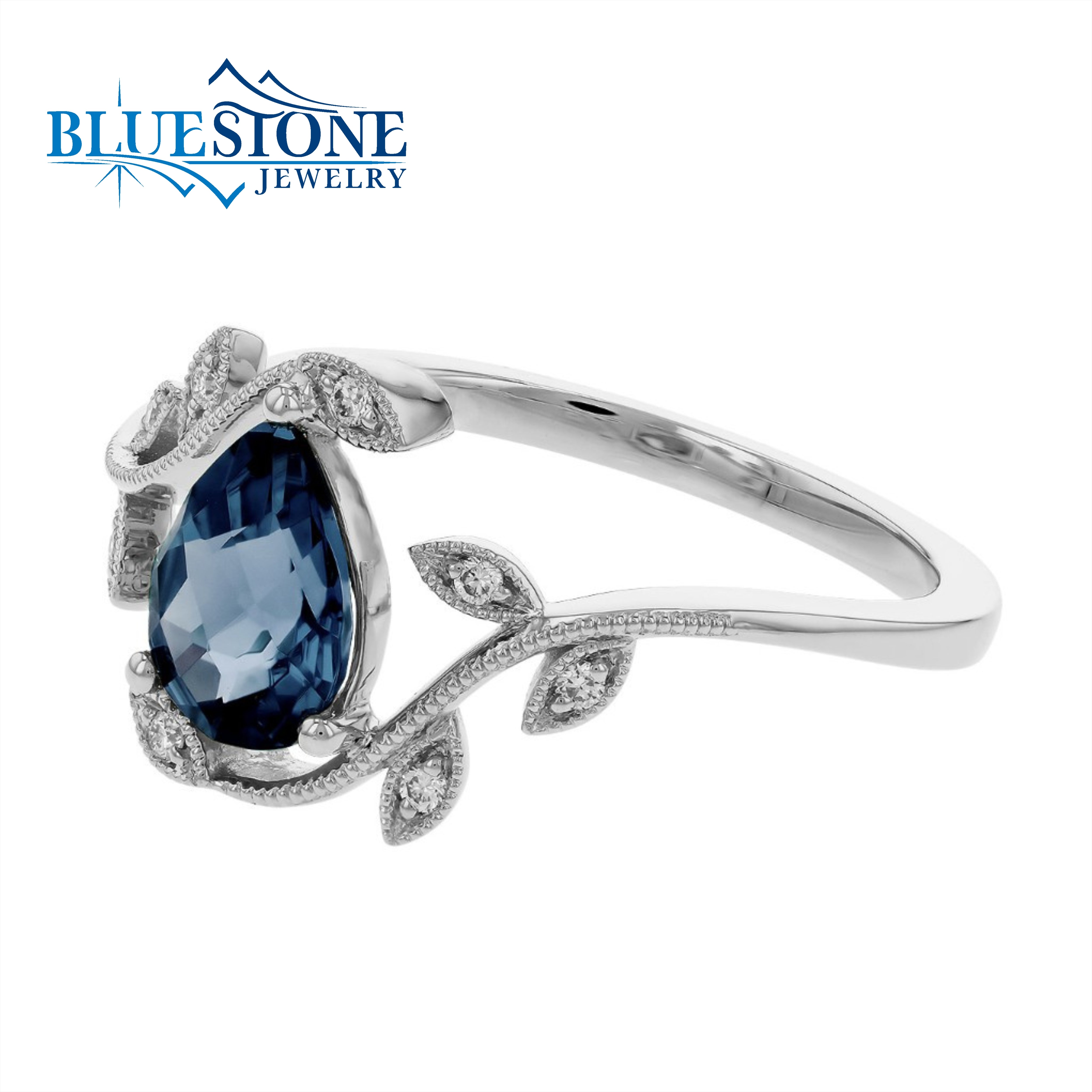 14 Karat White Gold Fashion Ring with One 6mm x 8mm Pear Cut 1.20 Carat London Blue Topaz and 8 Round Cut Diamonds at G SI1/2 Quality. 0.06 Total Diamond Carat Weight. Ring Size 7. Available in other ring sizes and metal options.