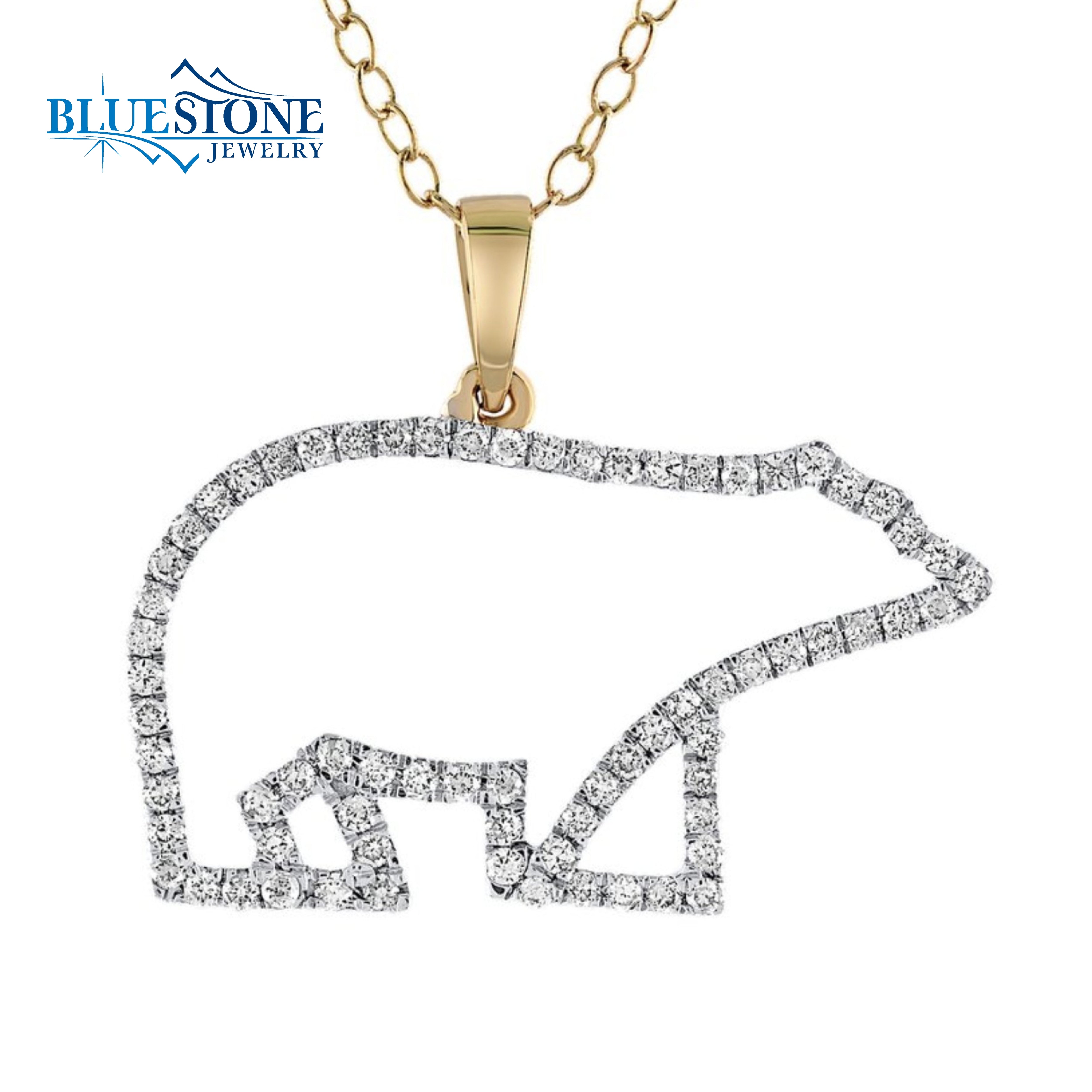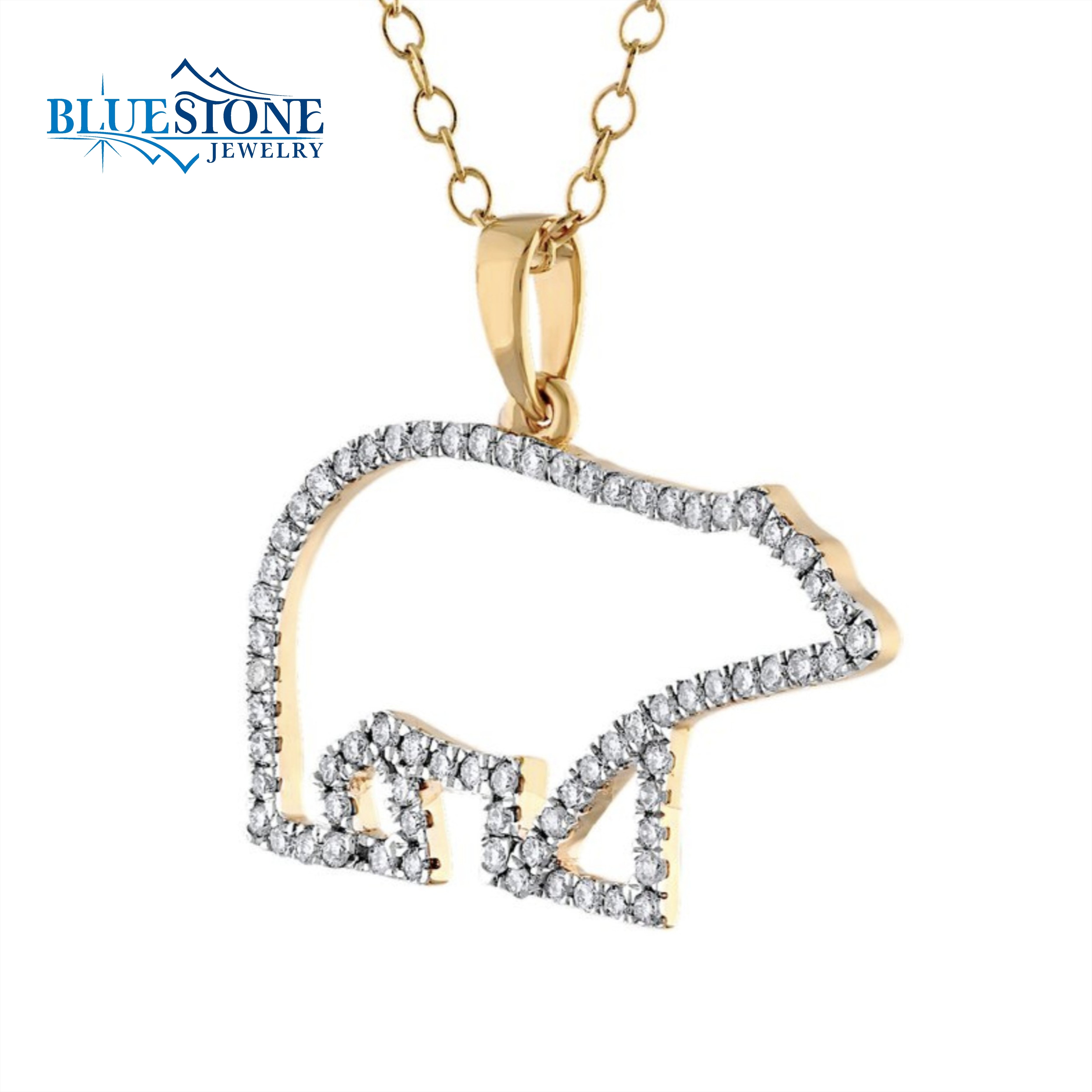 14 Karat Yellow Gold Bear Pendant with 71 Round Cut G SI1 Natural Diamonds at 0.28 Total Carat Weight. Measures 7/8" Wide. Chain is sold separately. Comes on a metal alloy DISPLAY chain. It is recommended to swap pendant to true chain before wear.