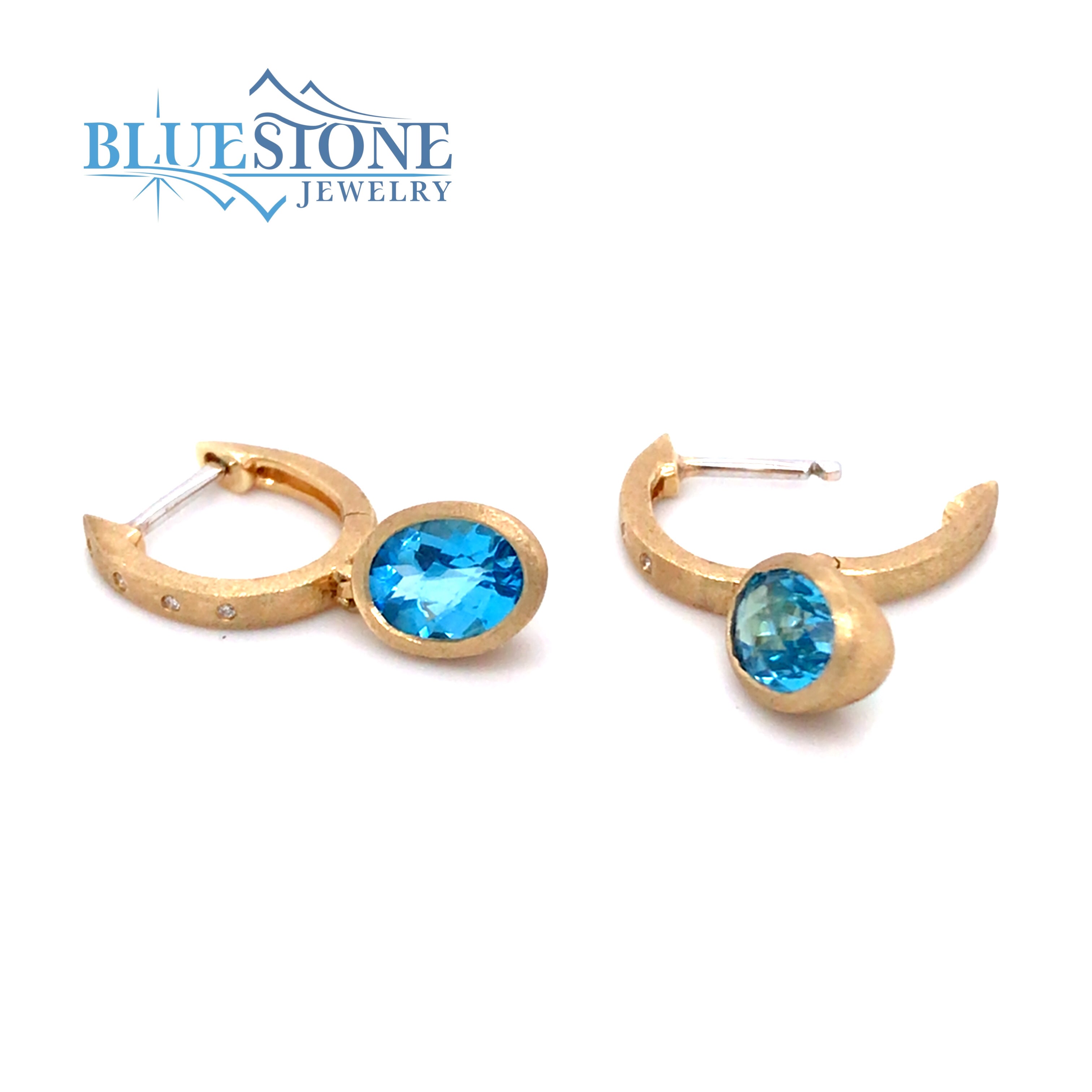 14 Karat Yellow Gold Huggy Hoop Earrings with Two 5mm x 7mm Swiss Blue Topazes at 1.72 Total Carat Weight and 8 Round Diamonds at 0.02 Total Carat Weight. Features a Satin Metal Finish. Measure 7/8 Inch Long.