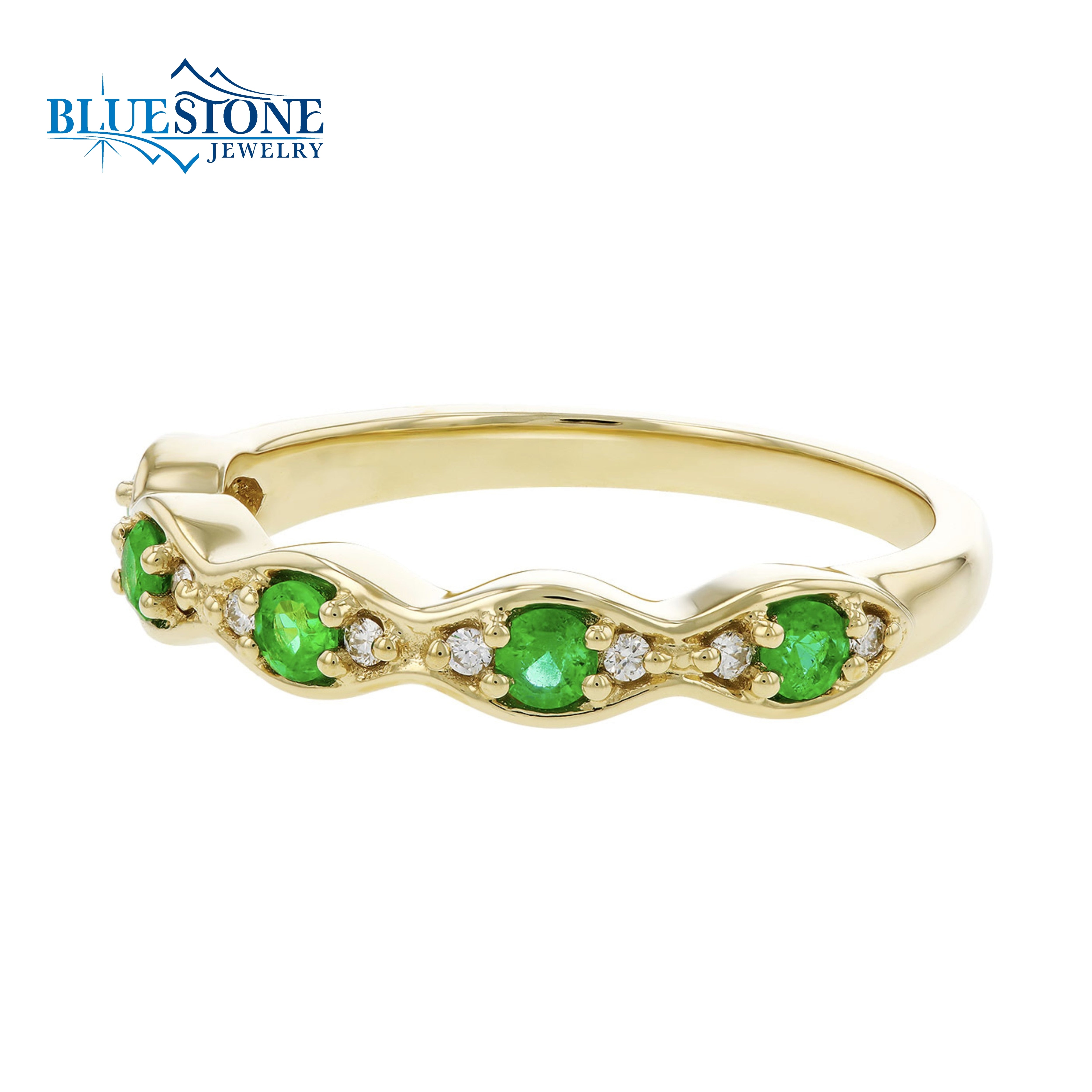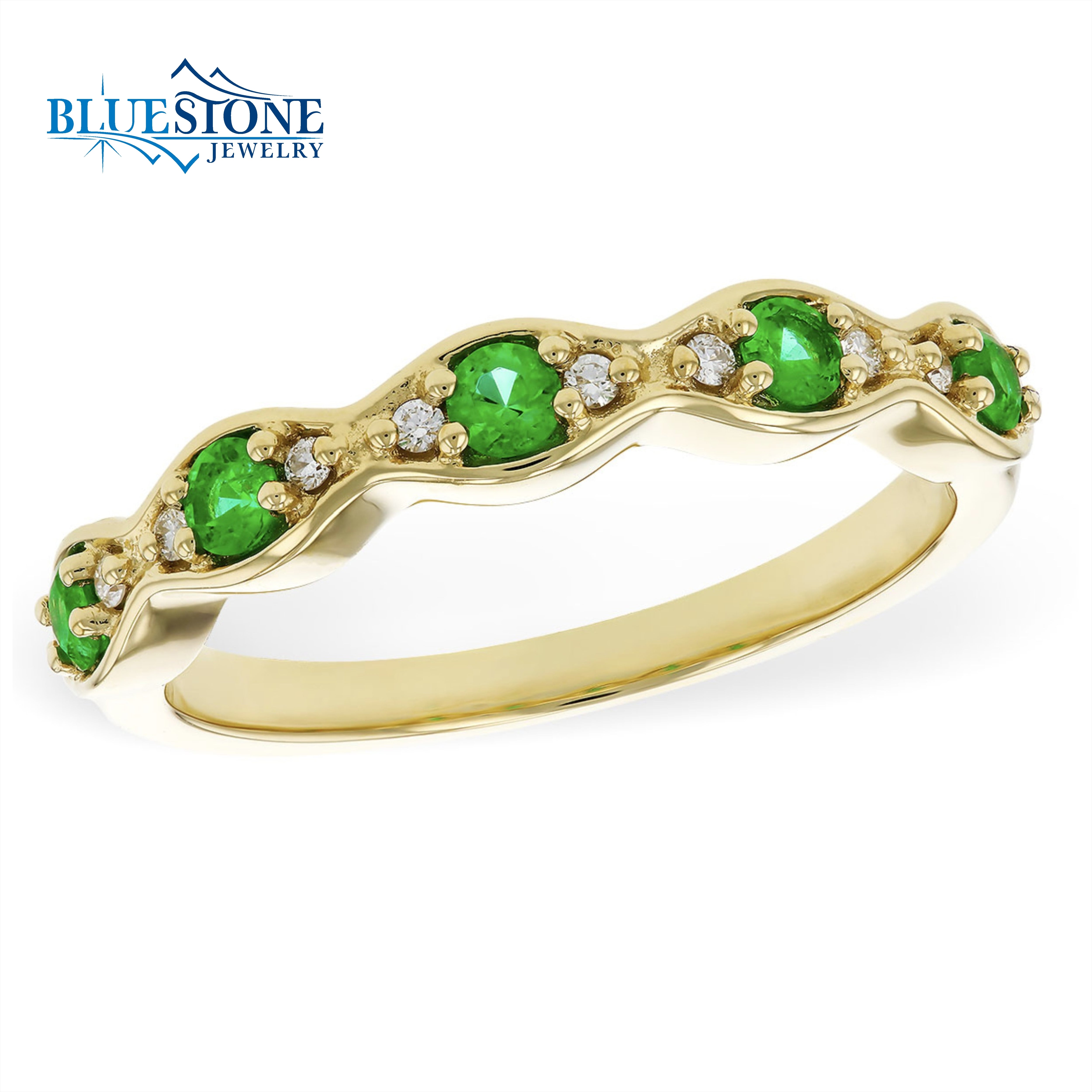 14 Karat Yellow Gold Fashion Ring with Five 2mm Round Cut Emeralds at a Total Carat Weight of 0.21 Carats with 10 Round Cut Accent G SI1/2 Diamonds at 0.06 Total Carat Weight. Ring Size 7. Can be ordered in other ring sizes and metal types.