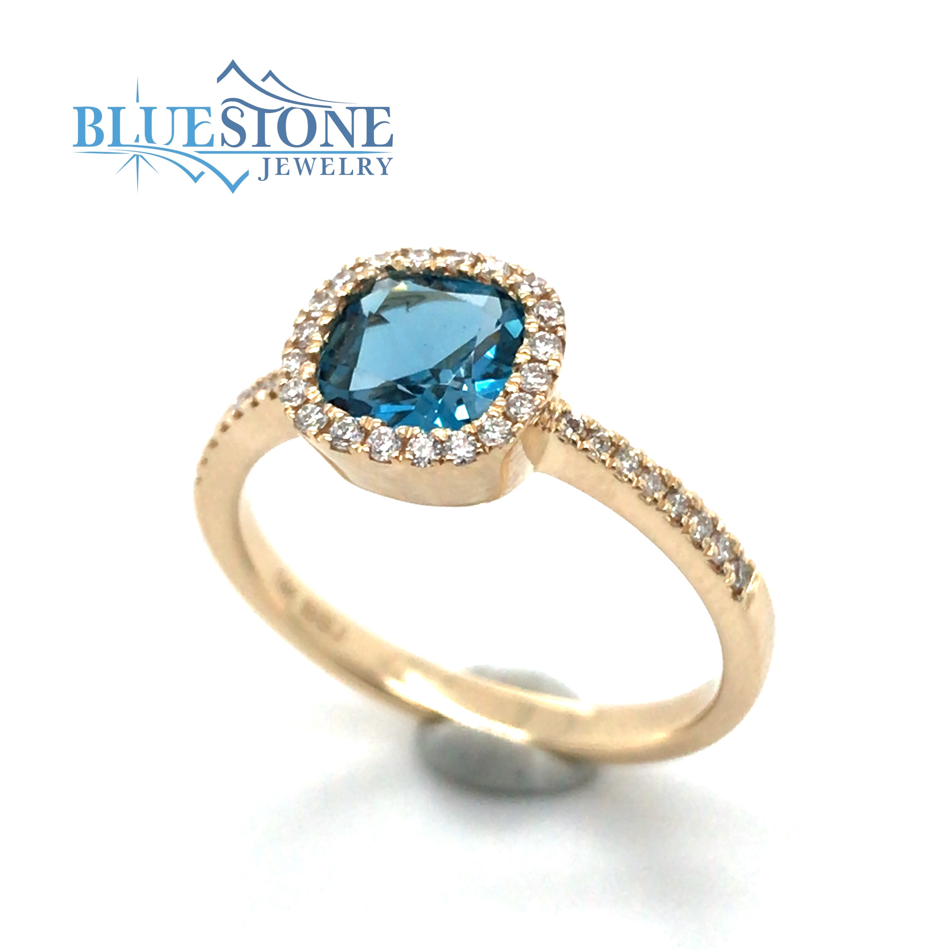 14 Karat Yellow Gold Ring with One 6mm 0.92 Carat Square Cushion Cut London Blue Topaz and 0.16 Total carat Weight in Accent Diamonds.Ring Size 6.5.Can be ordered in other ring sizes and metal options.