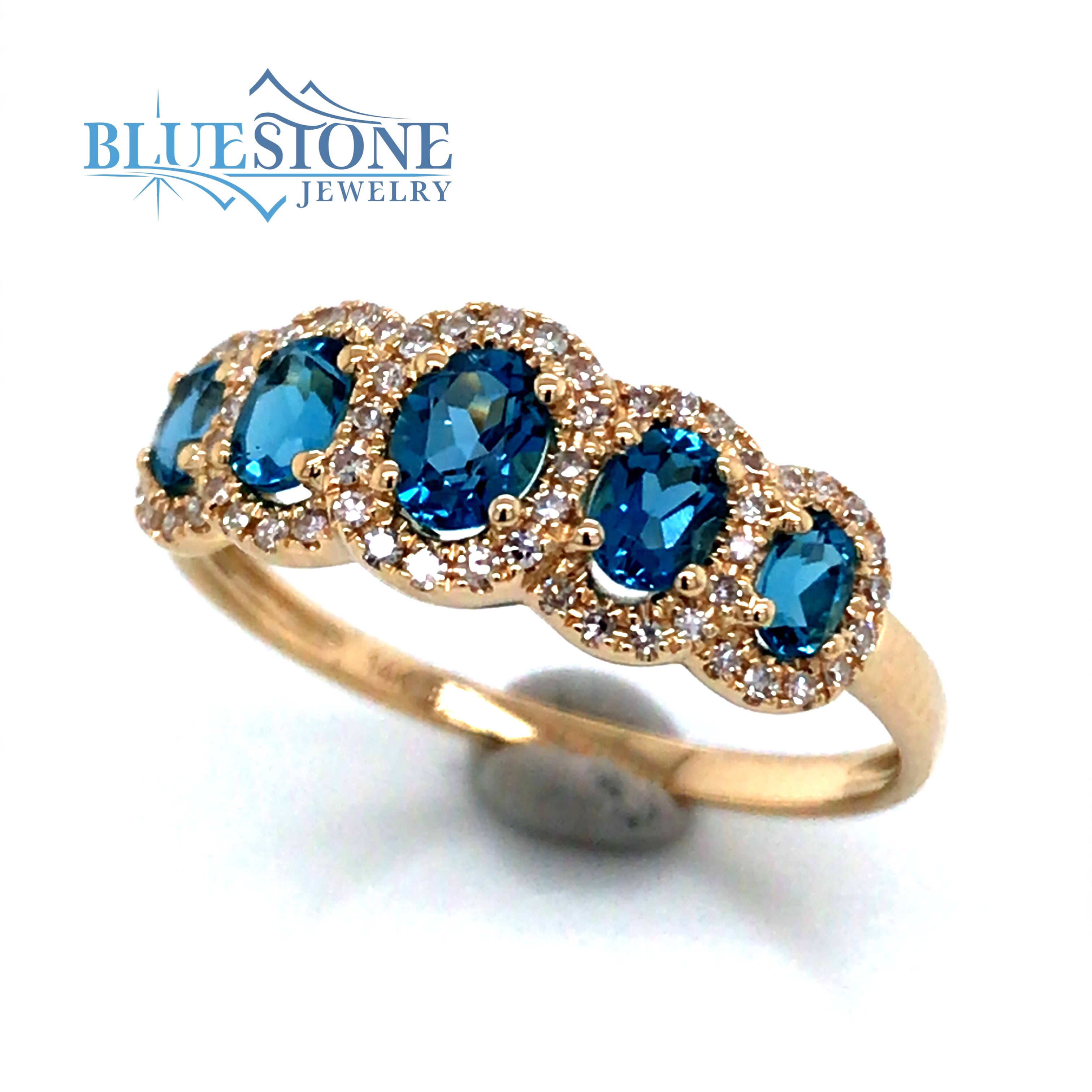14 Karat Yellow Gold Ring with 5 Oval Cut London Blue Topaz at 0.66 Carats Total Weight & Round Diamonds at 0.12 Carats Total Weight G SI1 Quality Diamonds.Ring Size 7.75