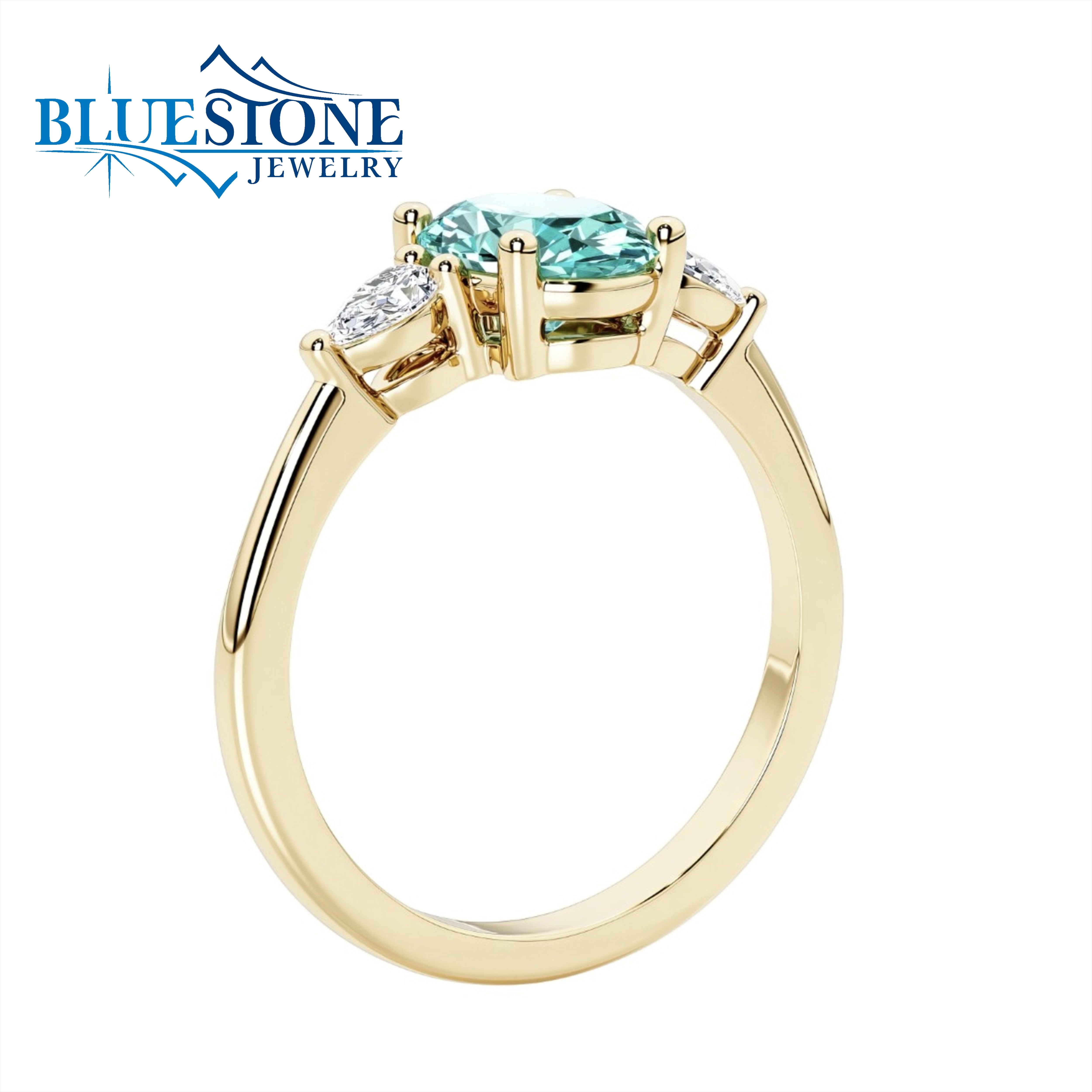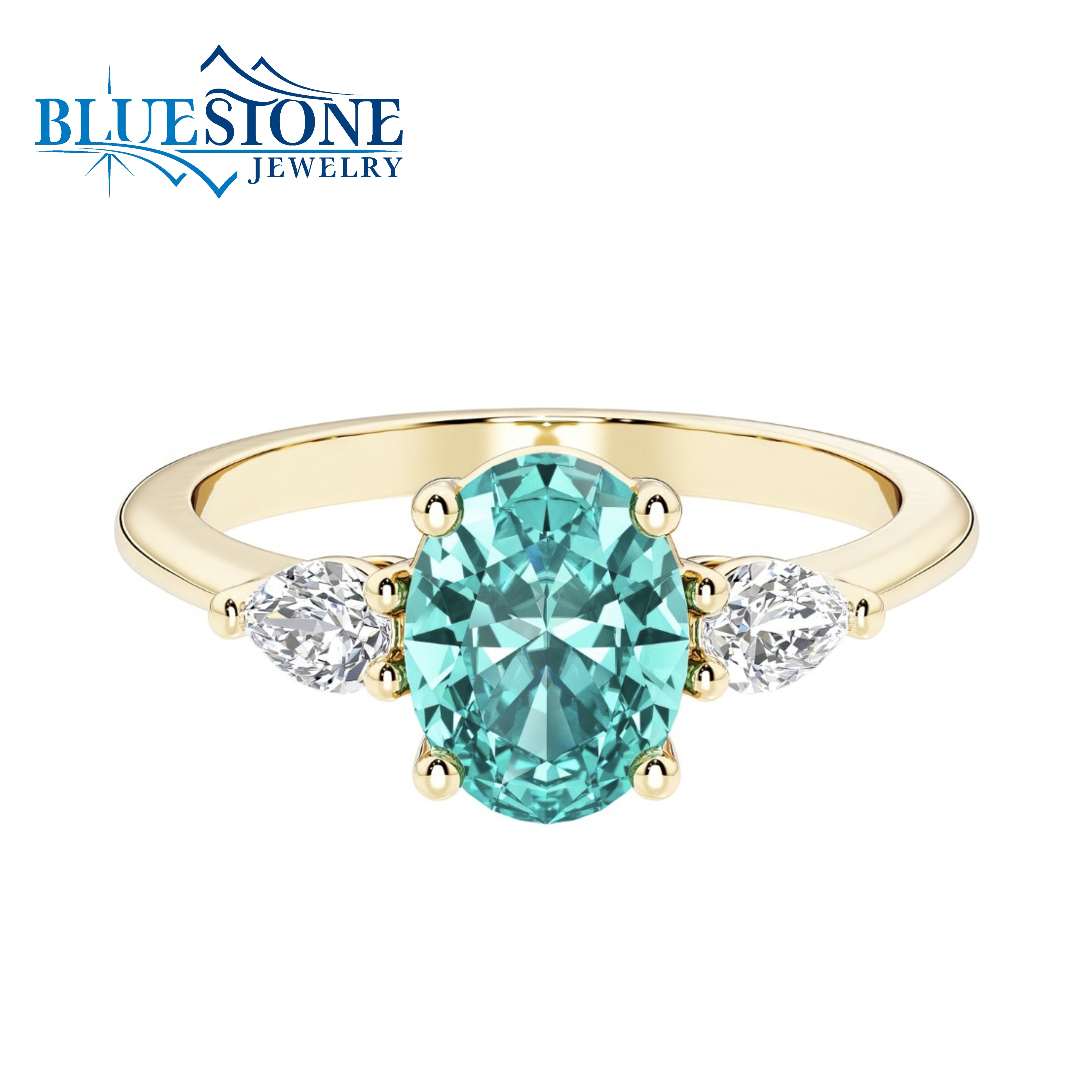 14 Karat Yellow Gold Ring with One 9mm x 8mm 1.75 Carat Oval Cut Lab Created Paraiba Tourmaline and Two 4mm x 3mm Pear Cut Lab Created Diamonds at 0.42 Total Carat Weight. Ring Size 7.Can be ordered in other ring sizes.