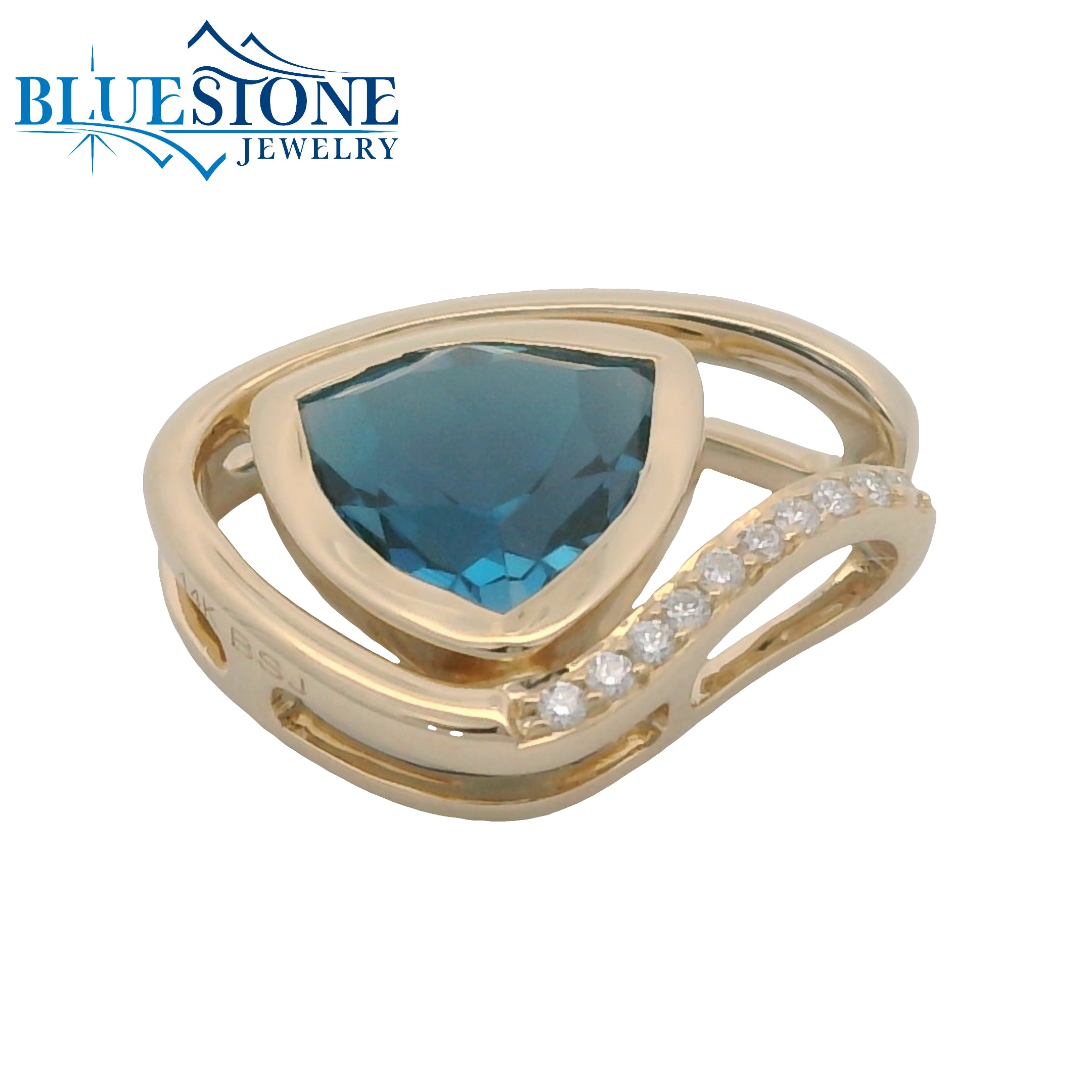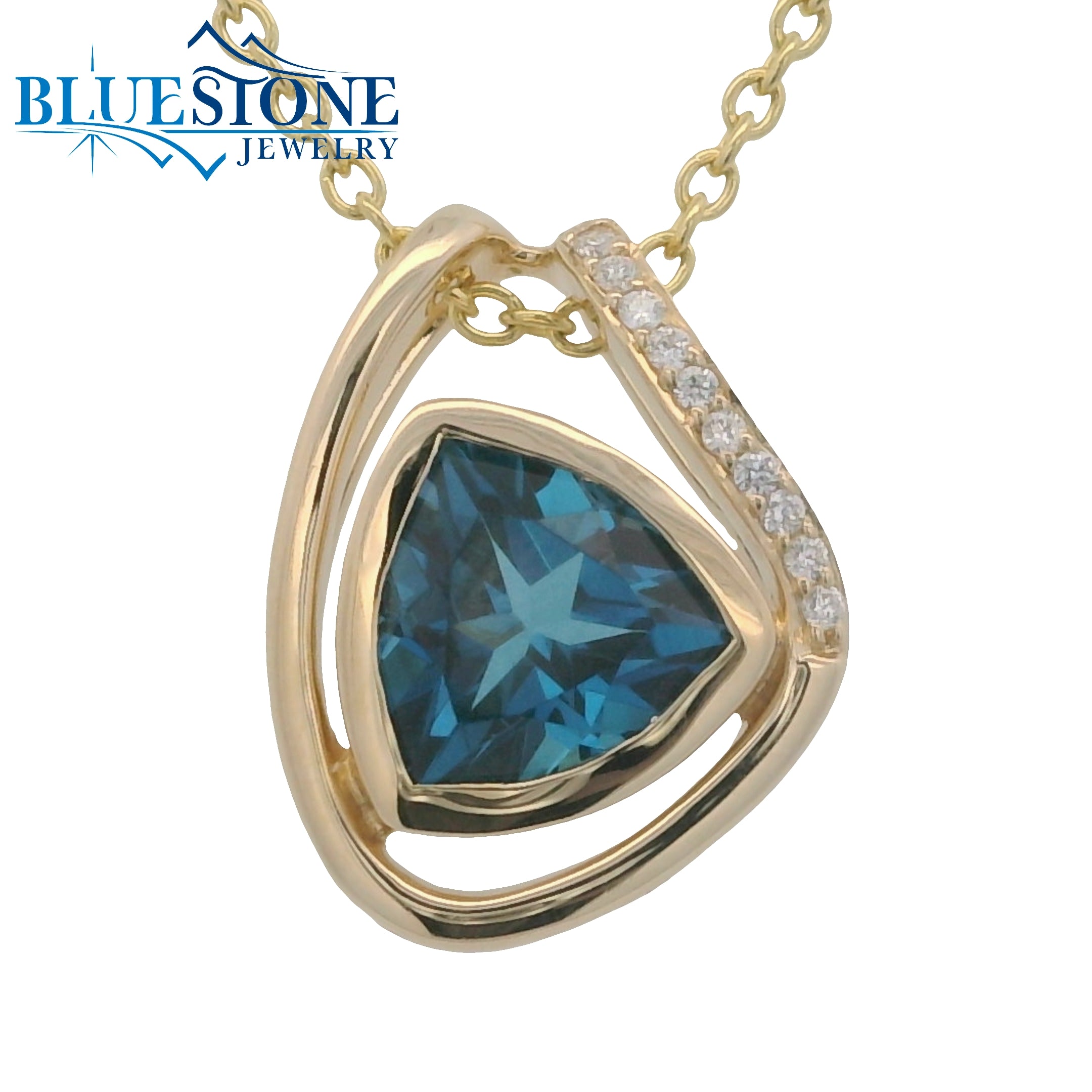 14 Karat Yellow Gold Pendant with One 7mm 1.34 Carat Trillion Cut Blue Topaz and 10 Round Diamonds at 0.03 Carats Total Weight of G SI1 Quality Diamonds. Pendant Measures 11.5mm x 15mm. Chain is sold separately. Comes on an 18" metal alloy DISPLAY chain.