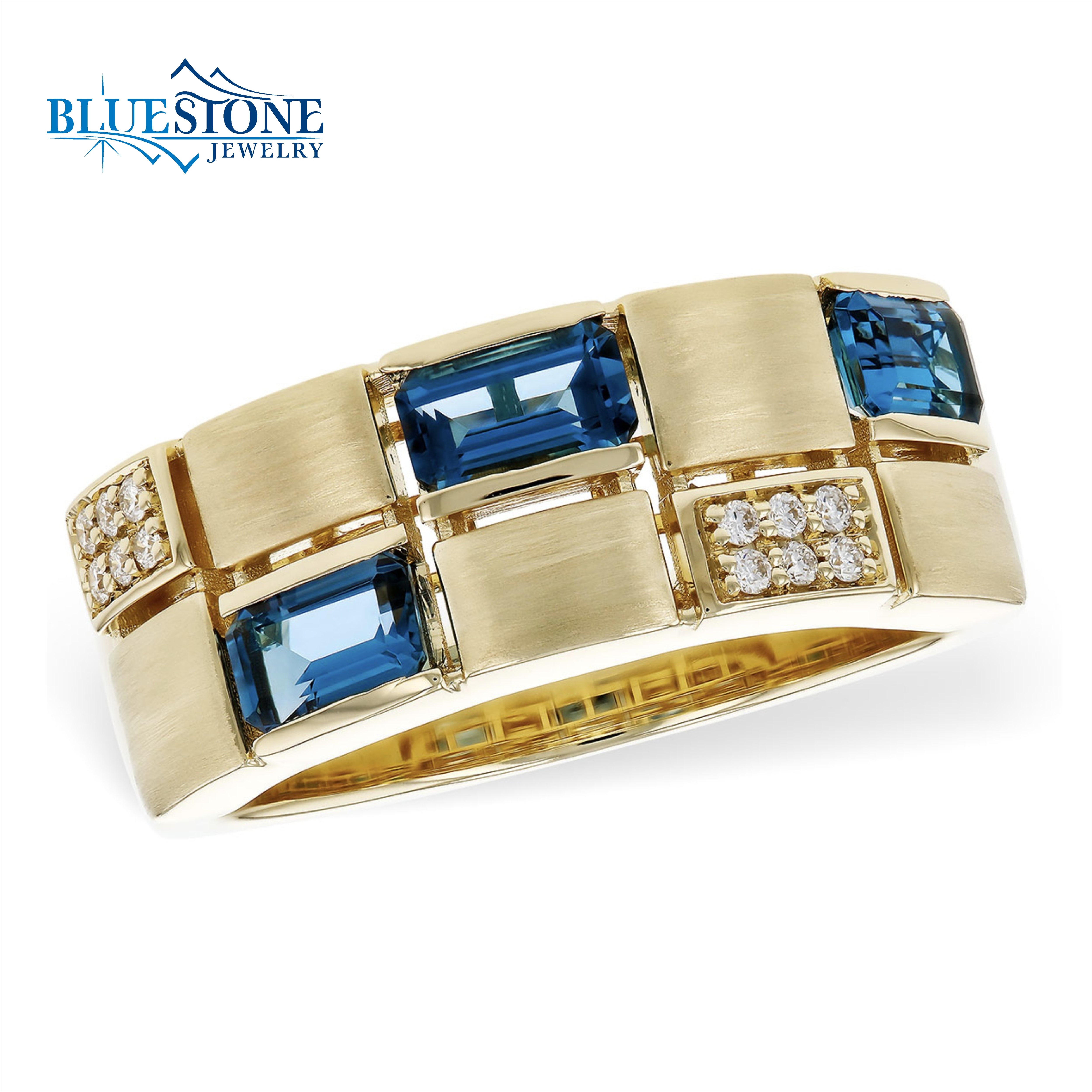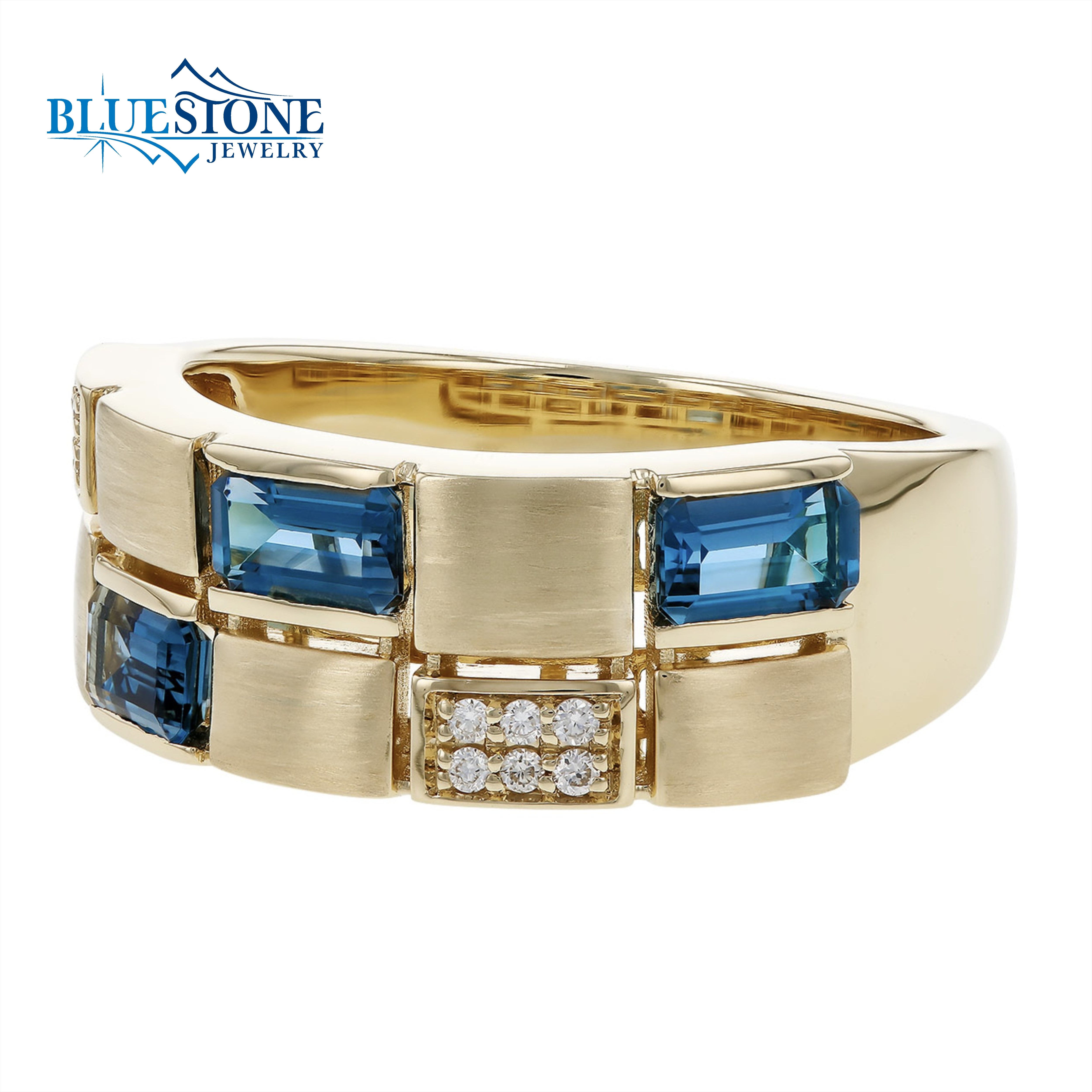 14 Karat Yellow Gold Fashion Ring with 3 5mm x 3mm Rectangular Cut London Blue Topaz Gemstones at a Total Carat Weight of 0.94 Carats with 0.06 Total Carat Weight in Round Cut Accent G SI1/2 Diamonds. 8mm Wide. Ring Size 7.25. Can be ordered in other ring sizes and metal types.