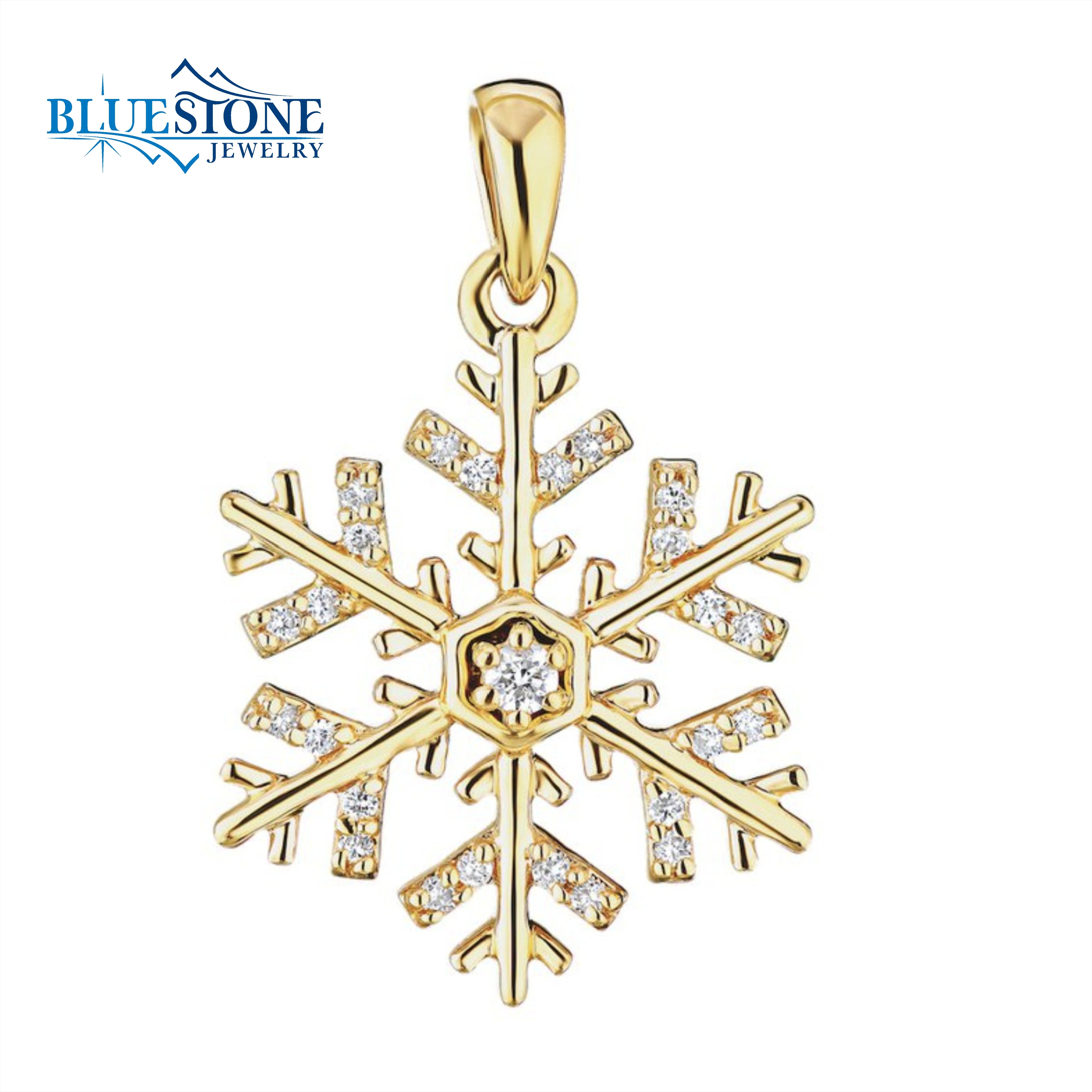 14 Karat Yellow Gold Snowflake Pendant with 25 Round Cut G SI1 Natural Diamonds at 0.10 Total Carat Weigh. Measures 5/8" Wide. Chain is sold separately. Comes on a metal alloy DISPLAY chain. It is recommended to swap pendant to true chain before wear.
