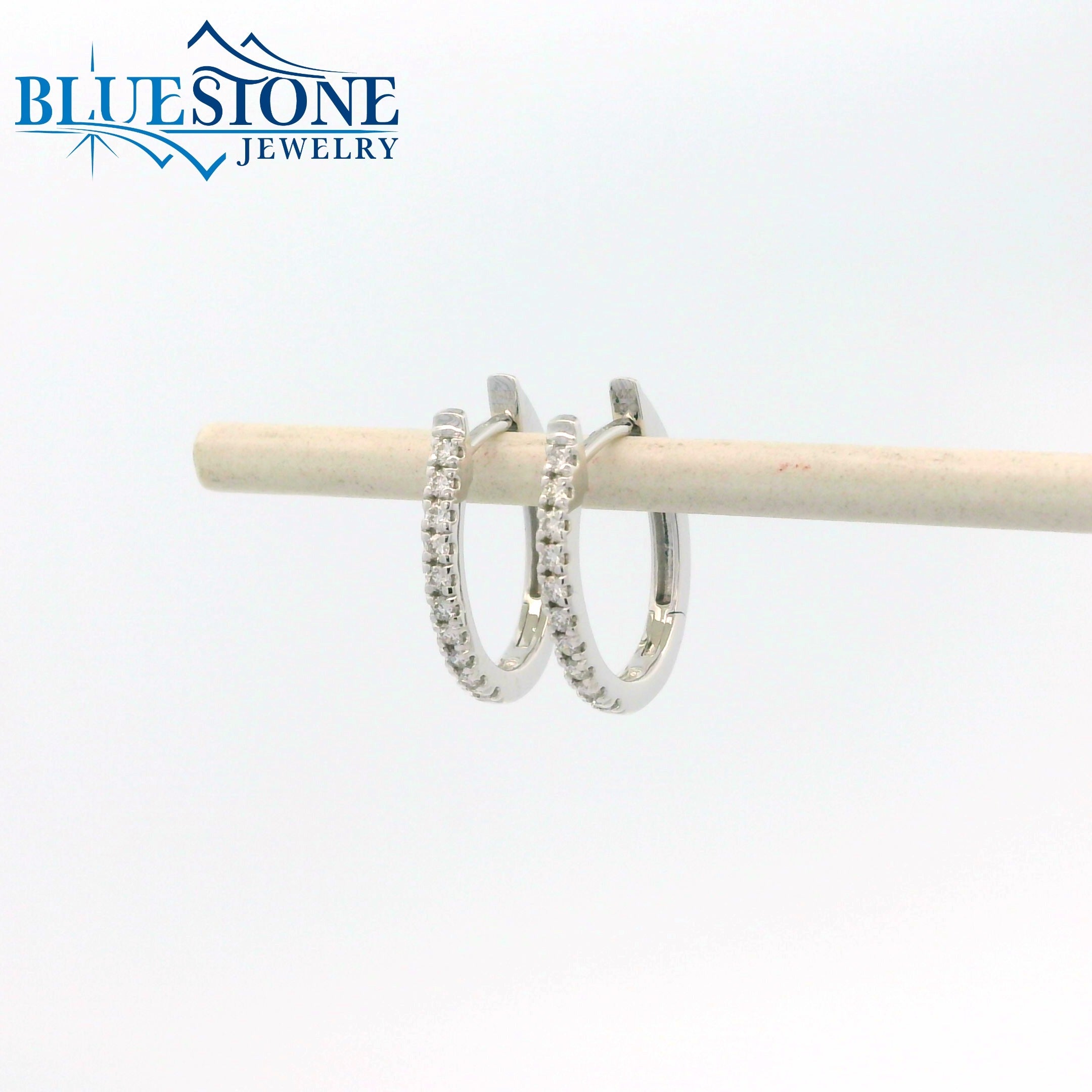 14 Karat White Gold Dainty Oval Huggie Hoop Earring with 20 Natural Diamonds at 0.14 Carat Total Weight. Earrings Width Measure 1.6mm and 14.1mm Tall.Earrings Weight 1.4 Grams.