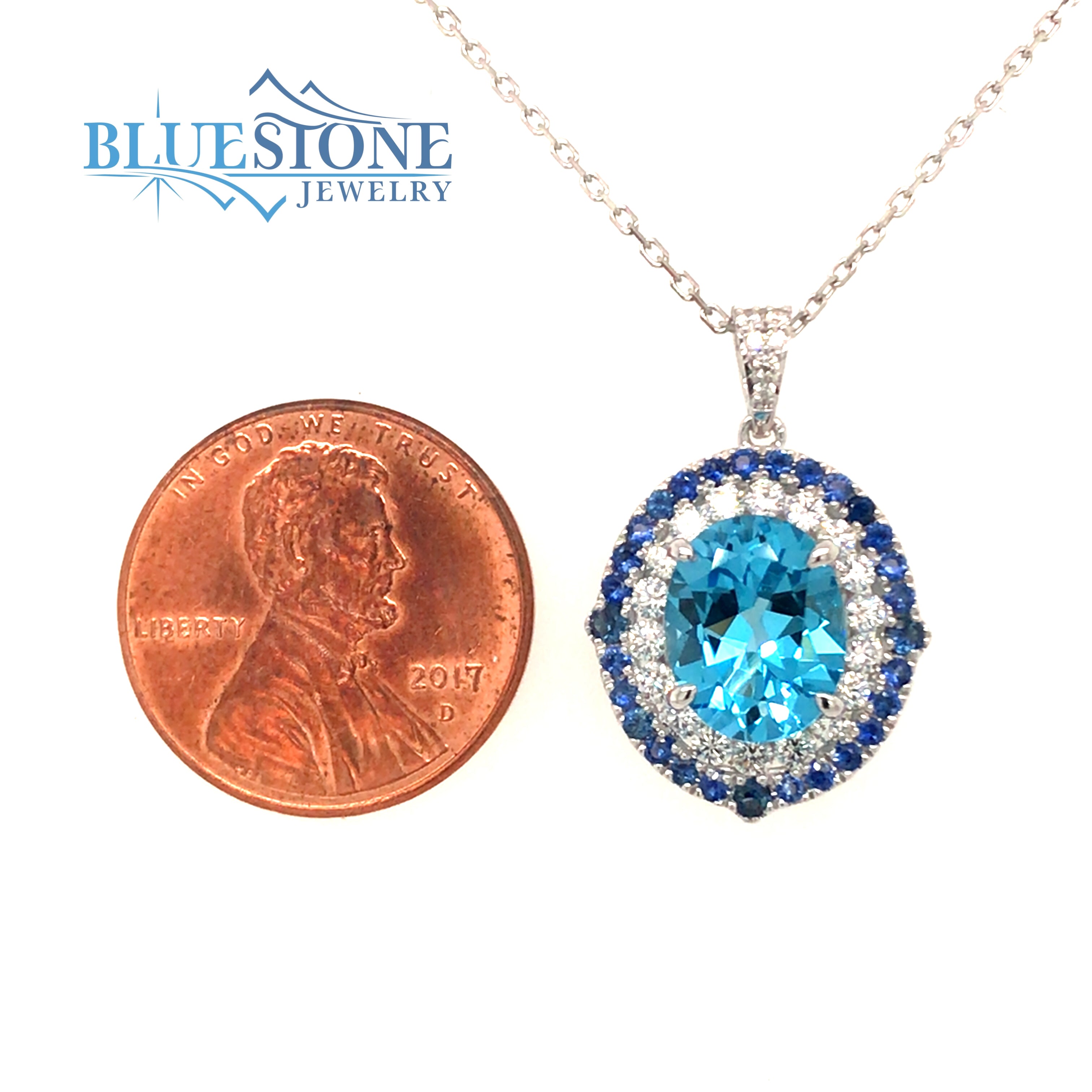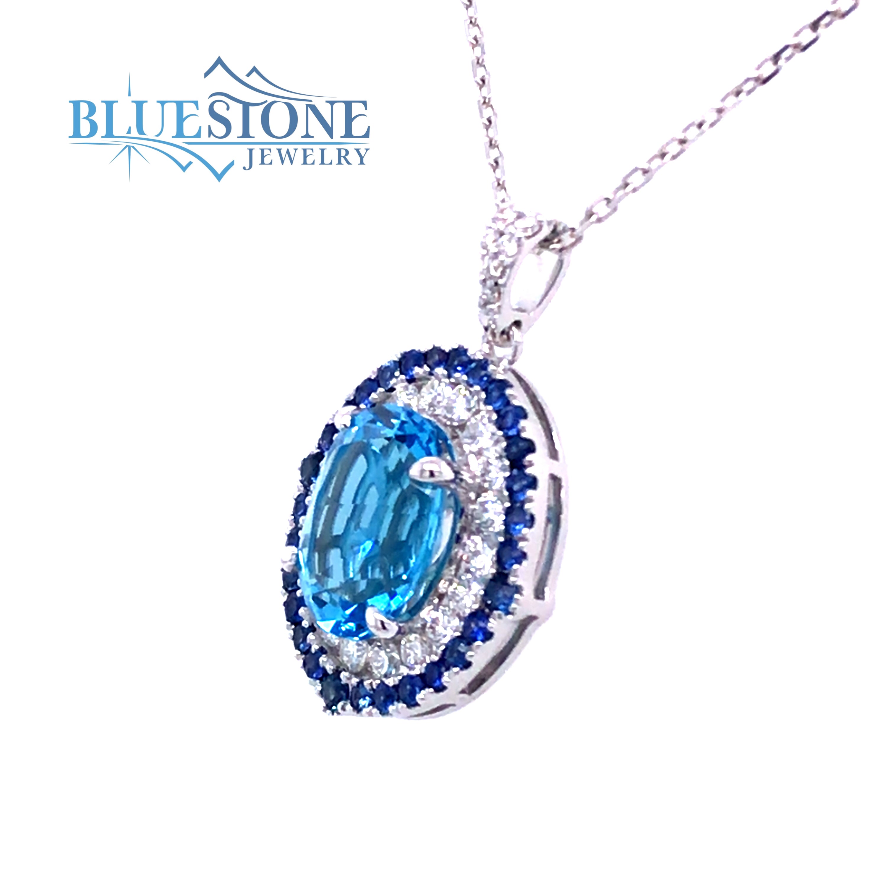 14 Karat White Gold Pendant with 2.53 Carat Oval Cut Blue Topaz, 29 Round Light Blue Sapphires at 0.35 Carats Total Weight and 24 Round Diamonds at 0.47 Total Diamond Carat Weight G SI1 Quality. Pendant Measures 6/8" x 7/8".Chain is sold separately. Comes on a metal alloy DISPLAY chain. Bluestone Jewelry Design.