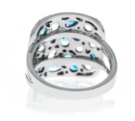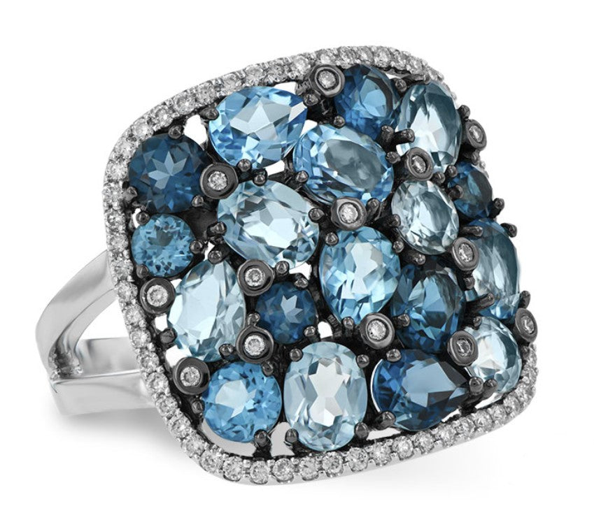 14 Karat White Gold Ring with 3.78 Carats of Sky Blue, London Blue & Swiss Blue Topazes with 0.28 Carats Total Weight of Round G SI1 Diamonds.Ring Size 6.5***Can be special ordered or re-sized per request. Please contact for details***