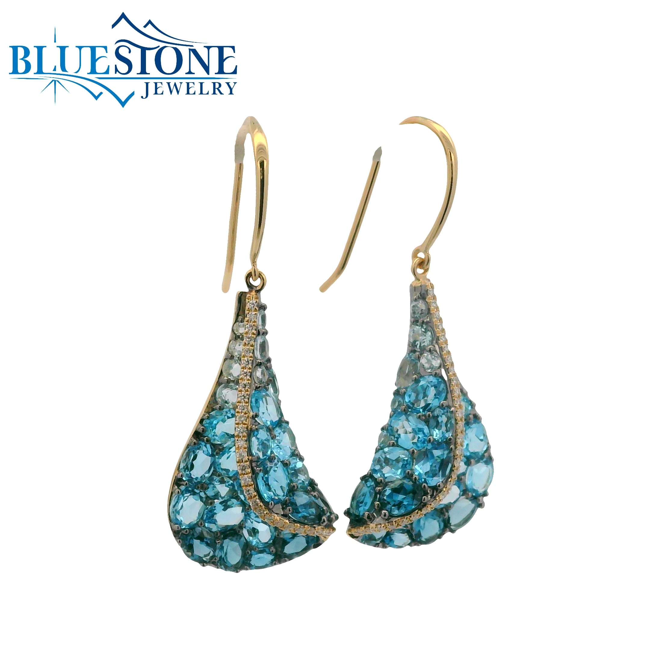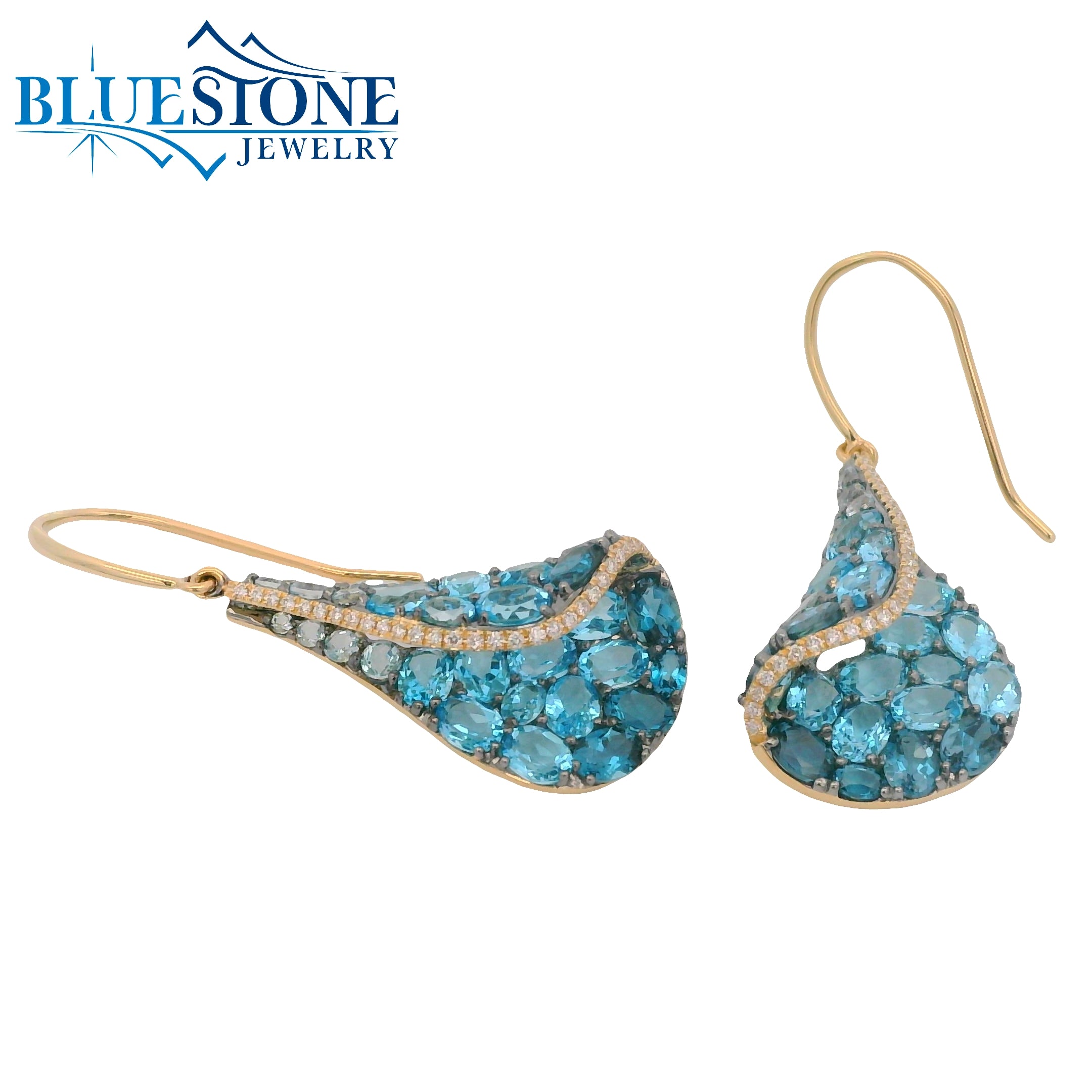 14 Karat Yellow Gold Earrings with 7.66 Carats Total Weight of London Blue, Sky Blue & Swiss Blue Topaz & 0.18 Carats Total Weight of Round G Si1 Diamonds.