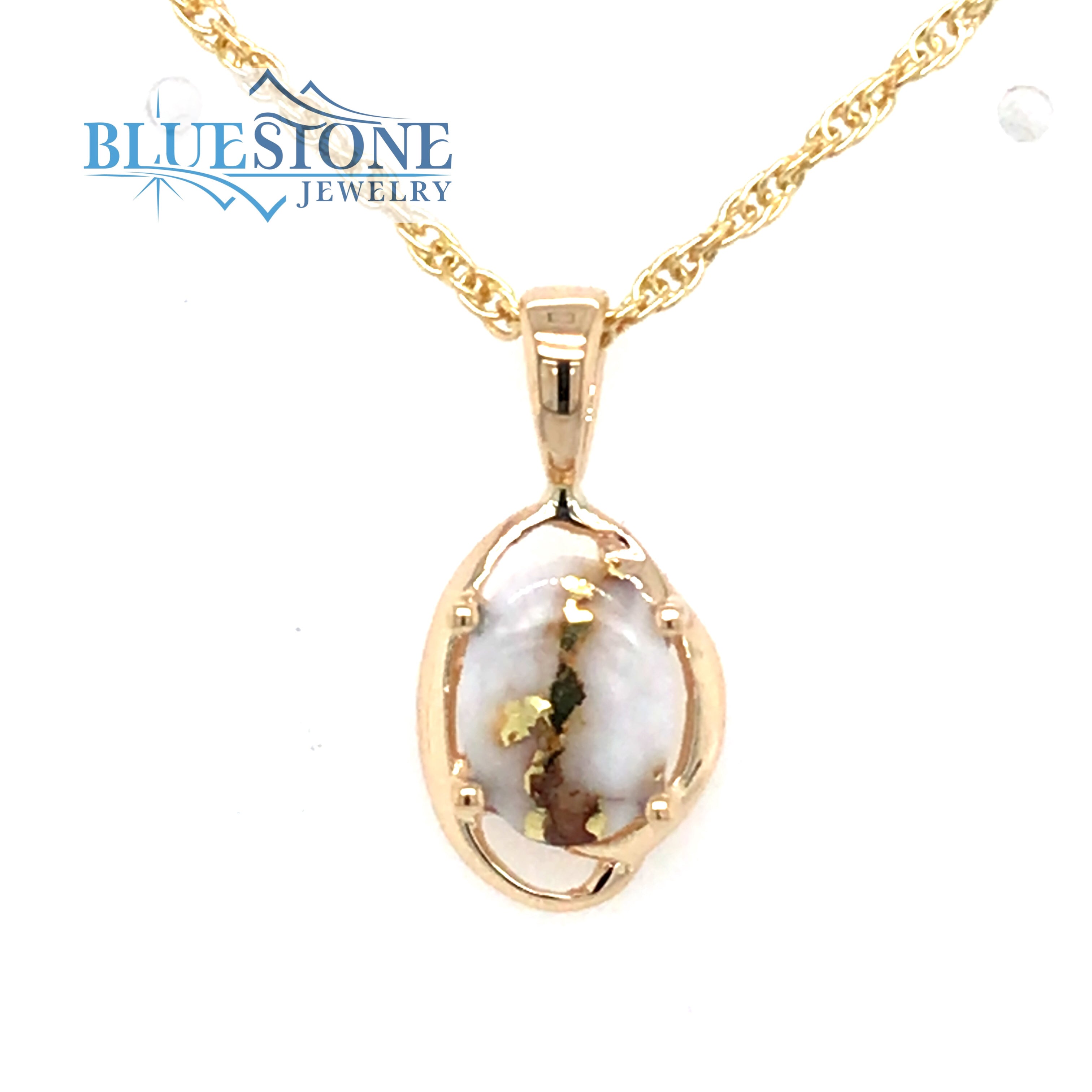 14 Karat Yellow Gold Pendant with One 6.5mm x 8mm Oval Gold Quartz gemstone from the local Sixteen to One Mine here in the Tahoe National Forest, CA. G3 Quality.Gold Quartz Gemstones Appearance May Vary.Chain is Sold Separately. Comes on an 18" metal alloy DISPLAY chain.