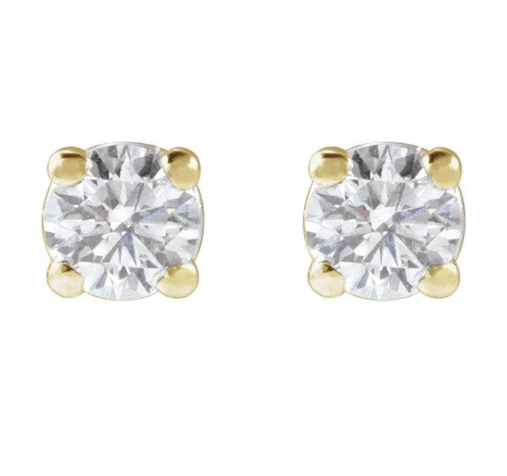 14 Karat Yellow Gold 3mm Round VS, F+ Lab-Grown Diamond Stud Earrings Set in 4 Prongs at 0.2 Total Carat Weight.