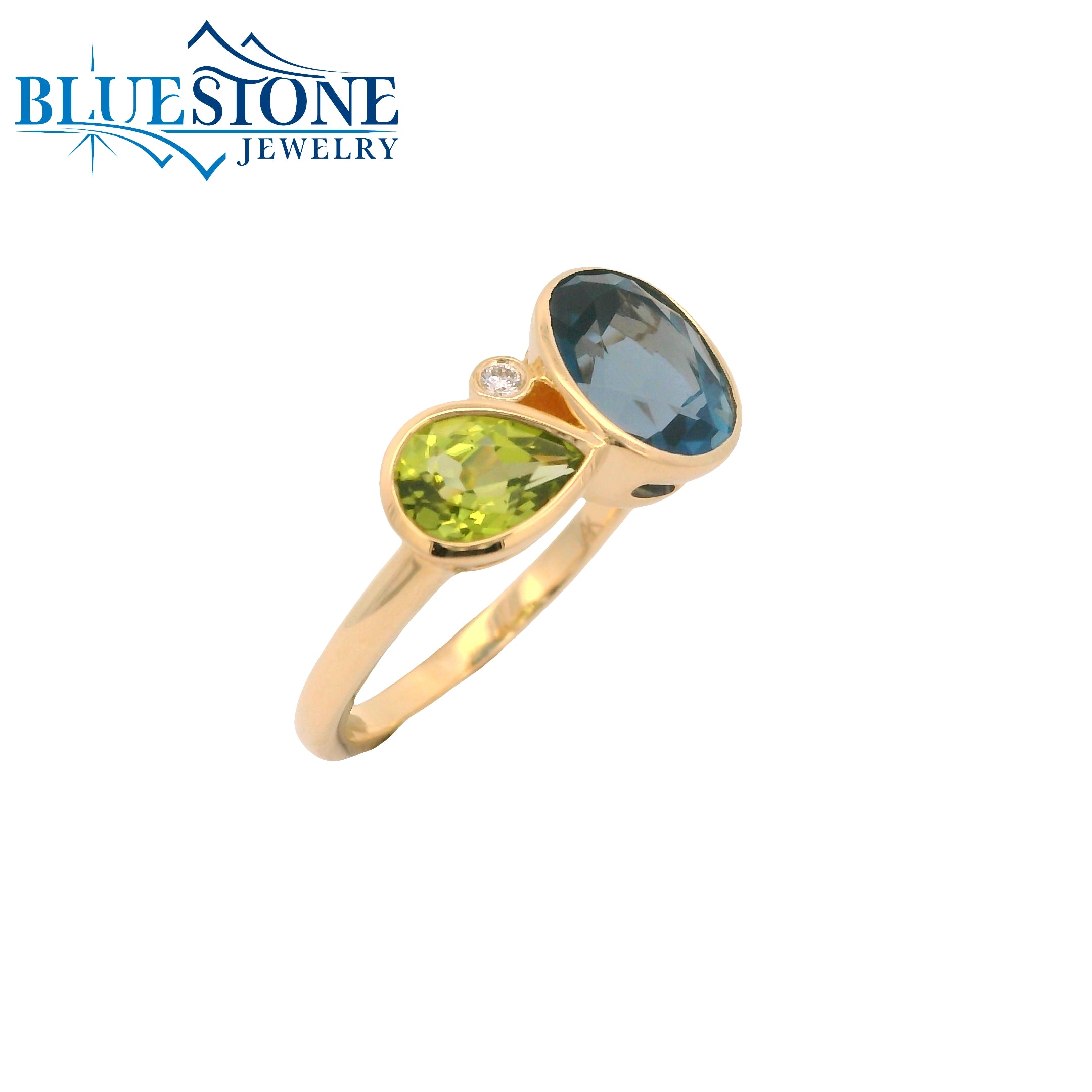 14 Karat Yellow Gold Ring with One Bezel Set Oval Cut London Blue Topaz, One Bezel Set Pear Cut Peridot and One Bezel Set Round Natural Diamond at SI/1 G Quality. London Blue Topaz Measures Approximately 9.8mm x 8mm. Peridot Measures Approximately 8mm x 6.1mm. Diamond Measures Approximately 3mm. Total Carat Weight for Topaz and Peridot is 2.43. Total Carat Weight for Diamond is 0.02. Ring Size 7.