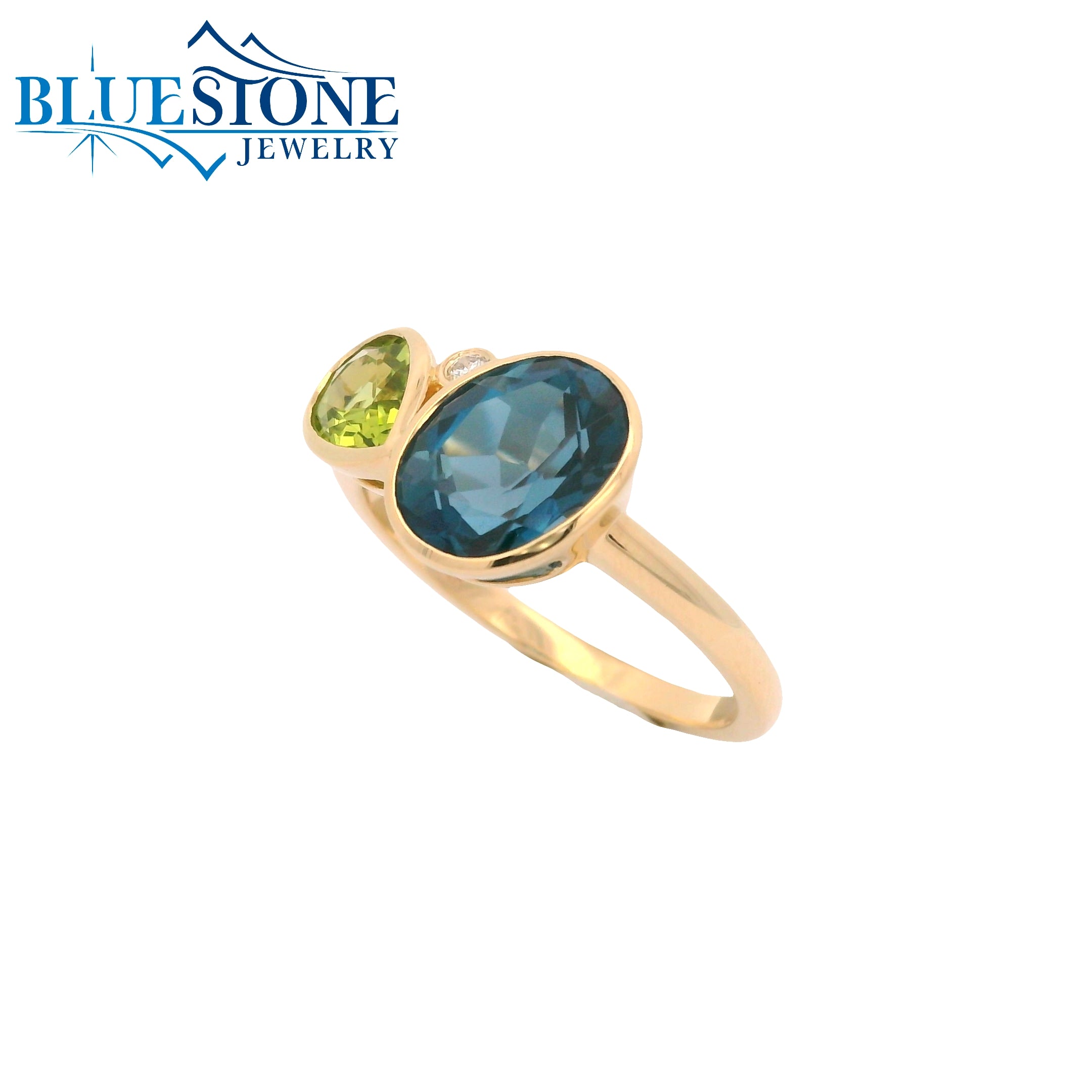 14KYG Bezel Ring w/ Blue Topaz, Peridot & One Diamond - Sz. 7