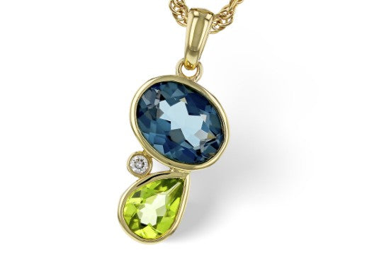 14 Karat Yellow Gold Pendant with One Bezel Set Oval Cut London Blue Topaz, One Bezel Set Pear Cut Peridot and One Bezel Set Round Natural Diamond at SI1 G Quality.London Blue Topaz Measures Approximately 9.8mm x 8mm. Peridot Measures Approximately 8mm x 6.1mmDiamond Measures Approximately 3mm.Pendant Measures 22mm Long from Bail.Total Carat Weight for Topaz and Peridot is 2.43 Carats.Total Carat Weight for Diamond is 0.02 Carats.Chain is sold separately. Comes on a metal alloy DISPLAY chain.