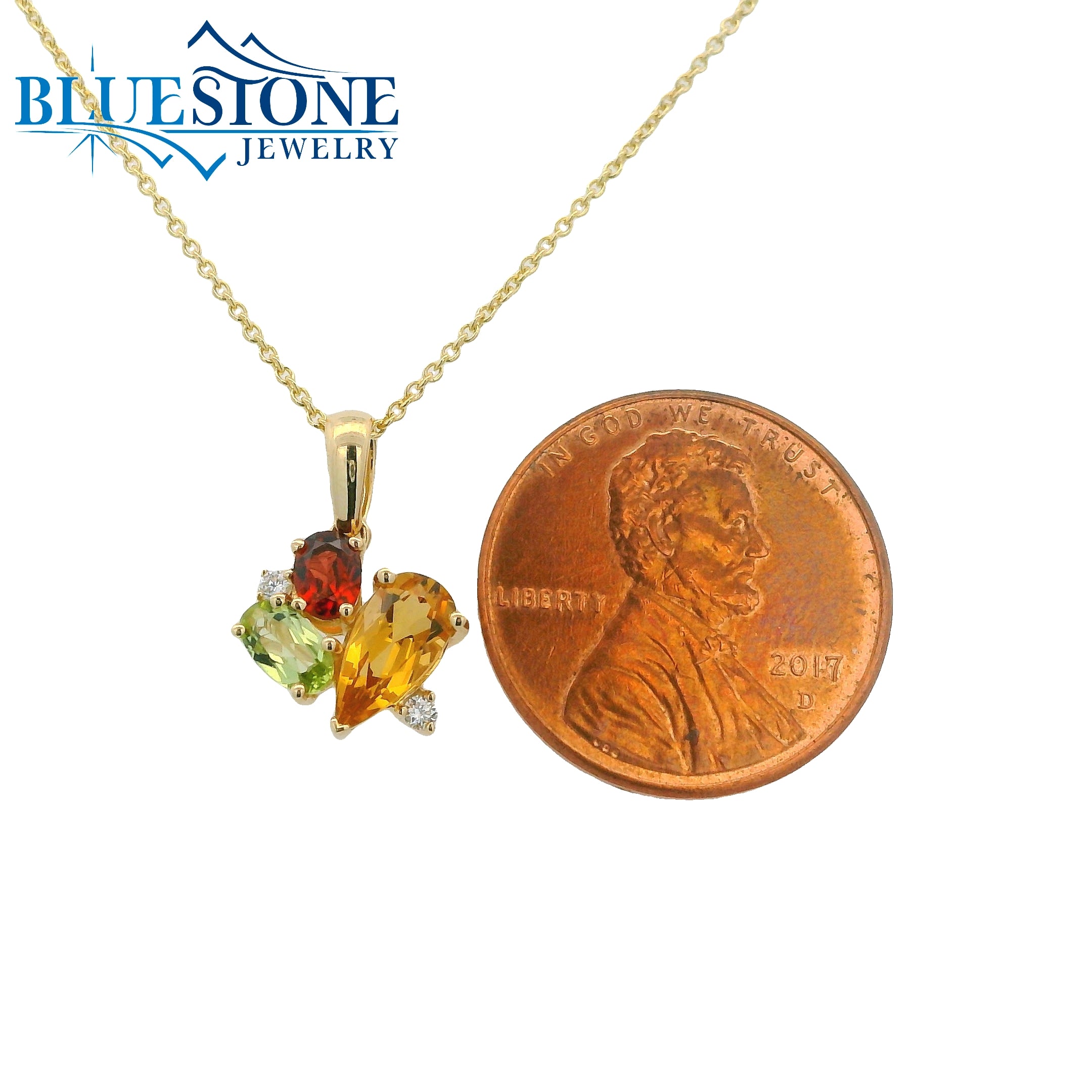 14 Karat Yellow Gold Pendant with Cluster of Gemstones Including Garnet, Peridot, Citrine and Two Round Diamonds at SI1/2 G Quality. Total Carat Weight 0.82.Pendant Measures Approximately 15mm Long by 11.6mm Wide.Chain is Sold Separately. Comes on a Metal Alloy DISPLAY Chain.
