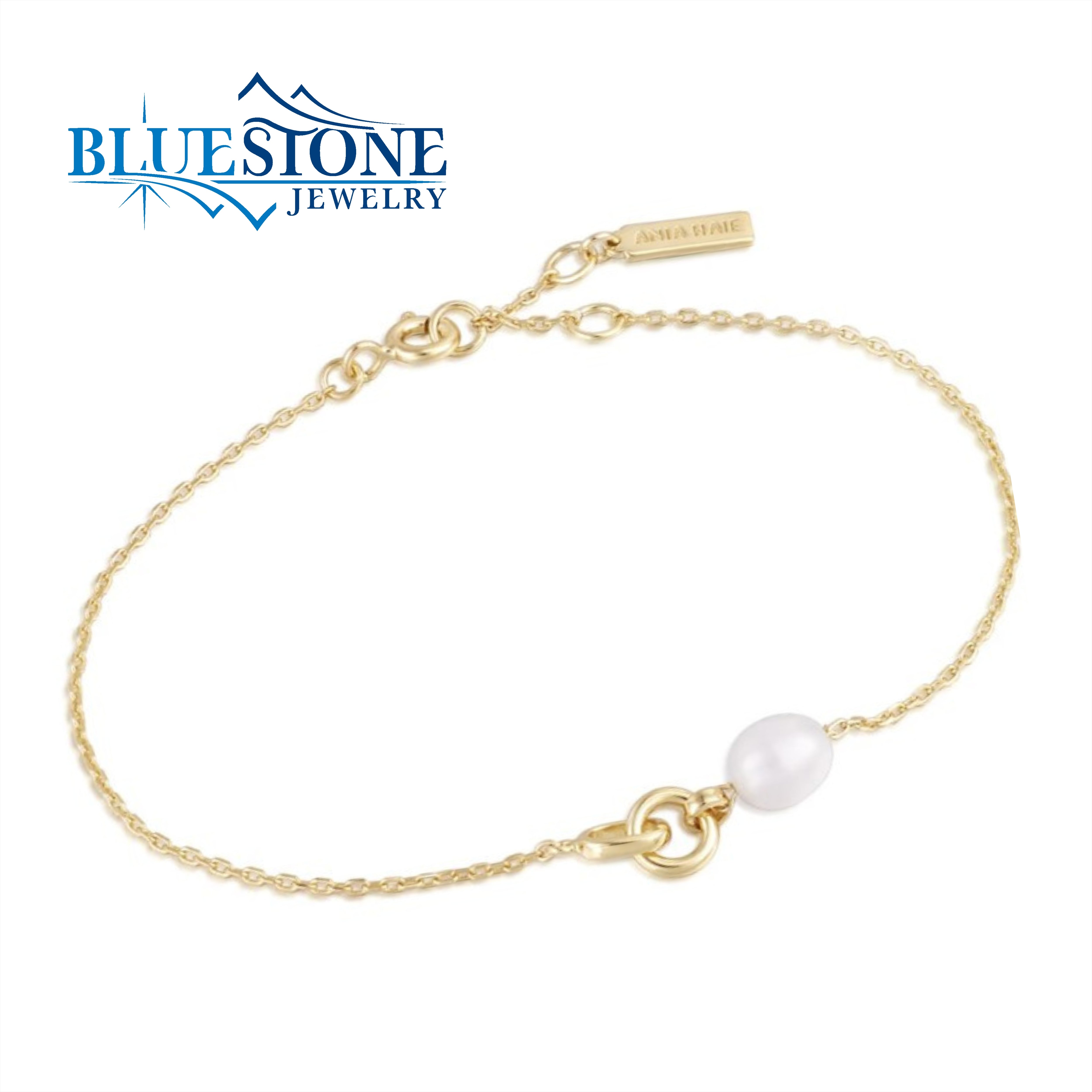 Sterling Silver 14 Karat Yellow Gold Plated Bracelet with One White Freshwater Pearl. 7 Inches Long.