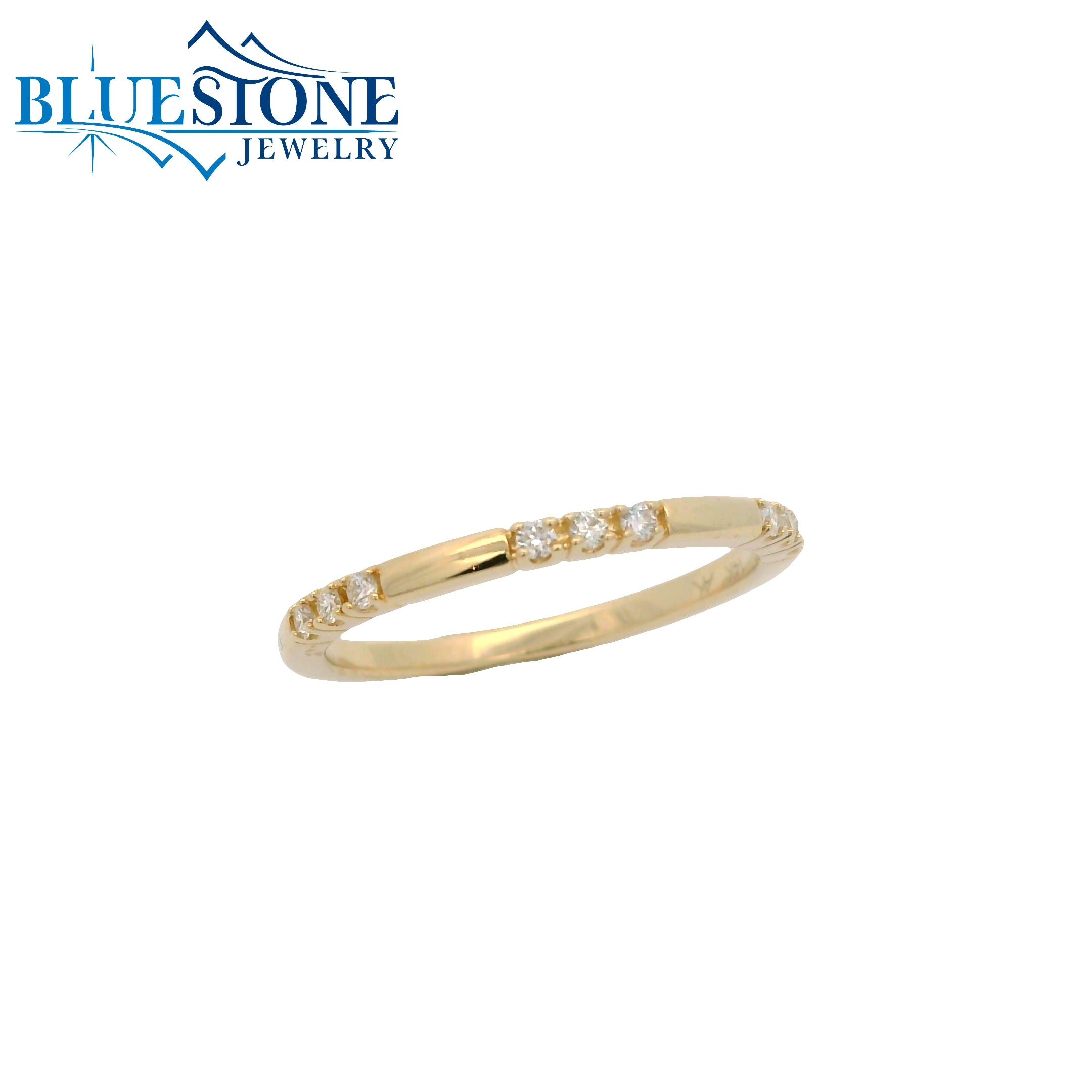 14 Karat Yellow Gold Ring with 9 Natural Round Diamonds at 0.10 Carat Total Weight at G SI1 Quality.Ring Size 6.75. Ring Measures 1.7mm Wide.Available in Other Metal Options.