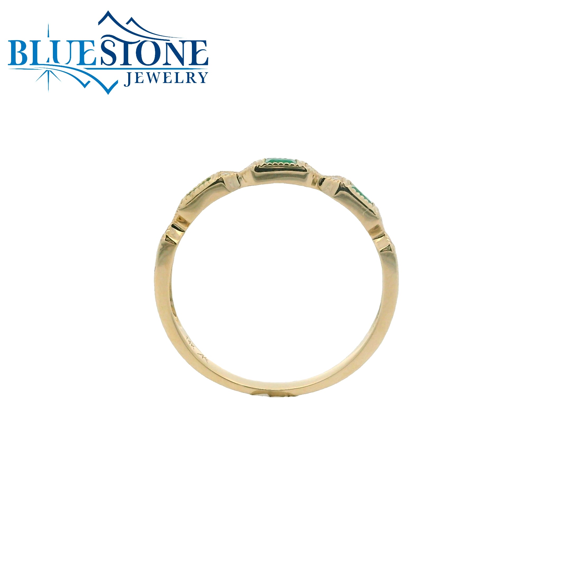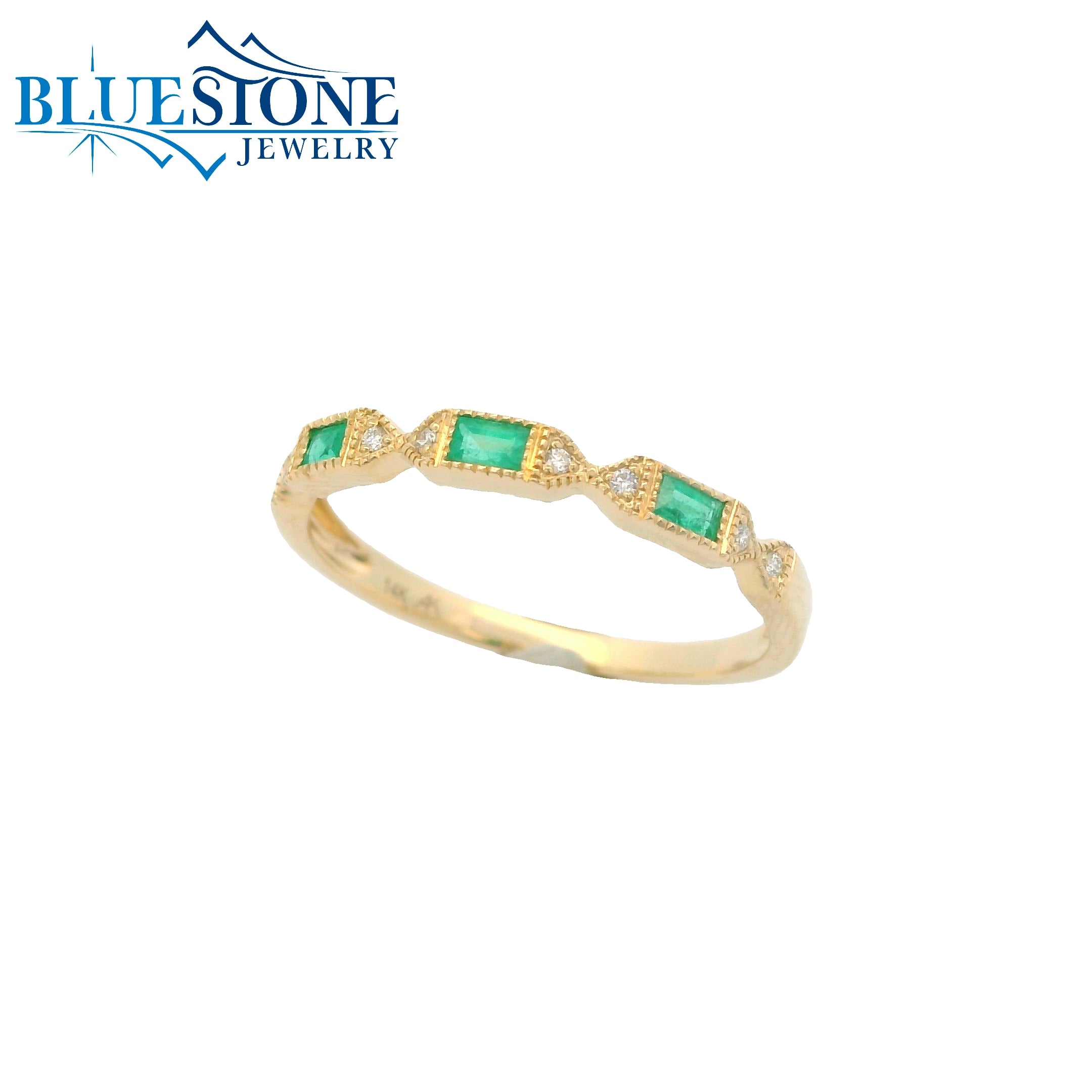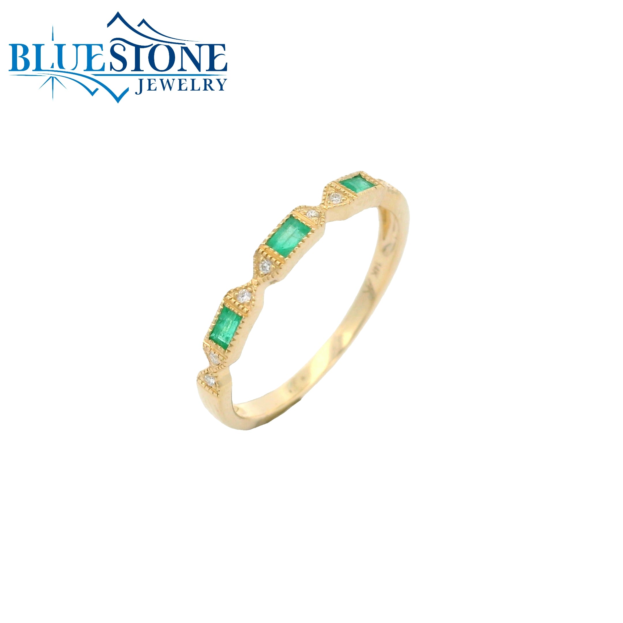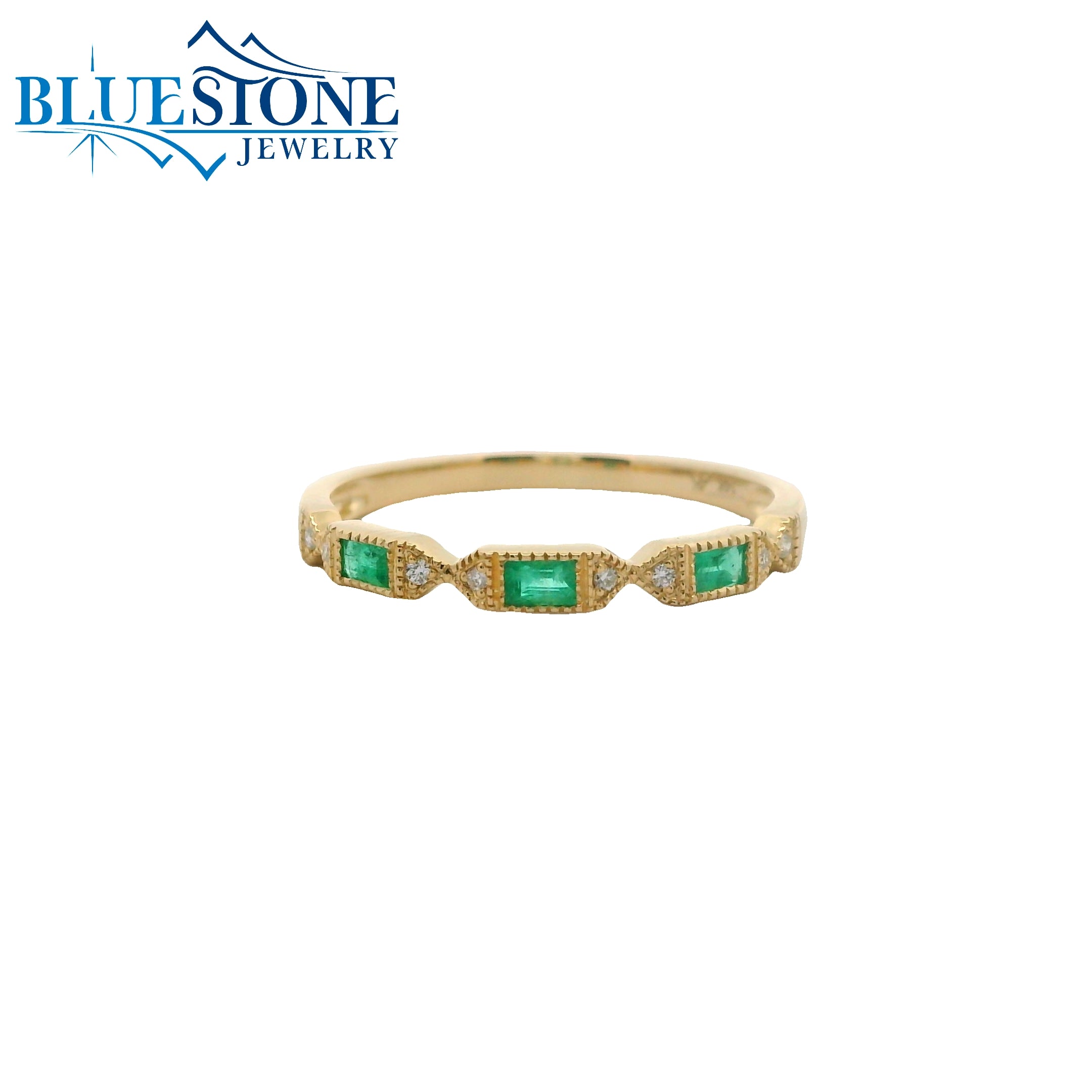 14 Karat Yellow Gold Ring with 3 Baguette Emerald Gemstones and 8 Round Diamonds at 0.12 Carats Total Weight. G SI1 Quality.Ring Size 7.