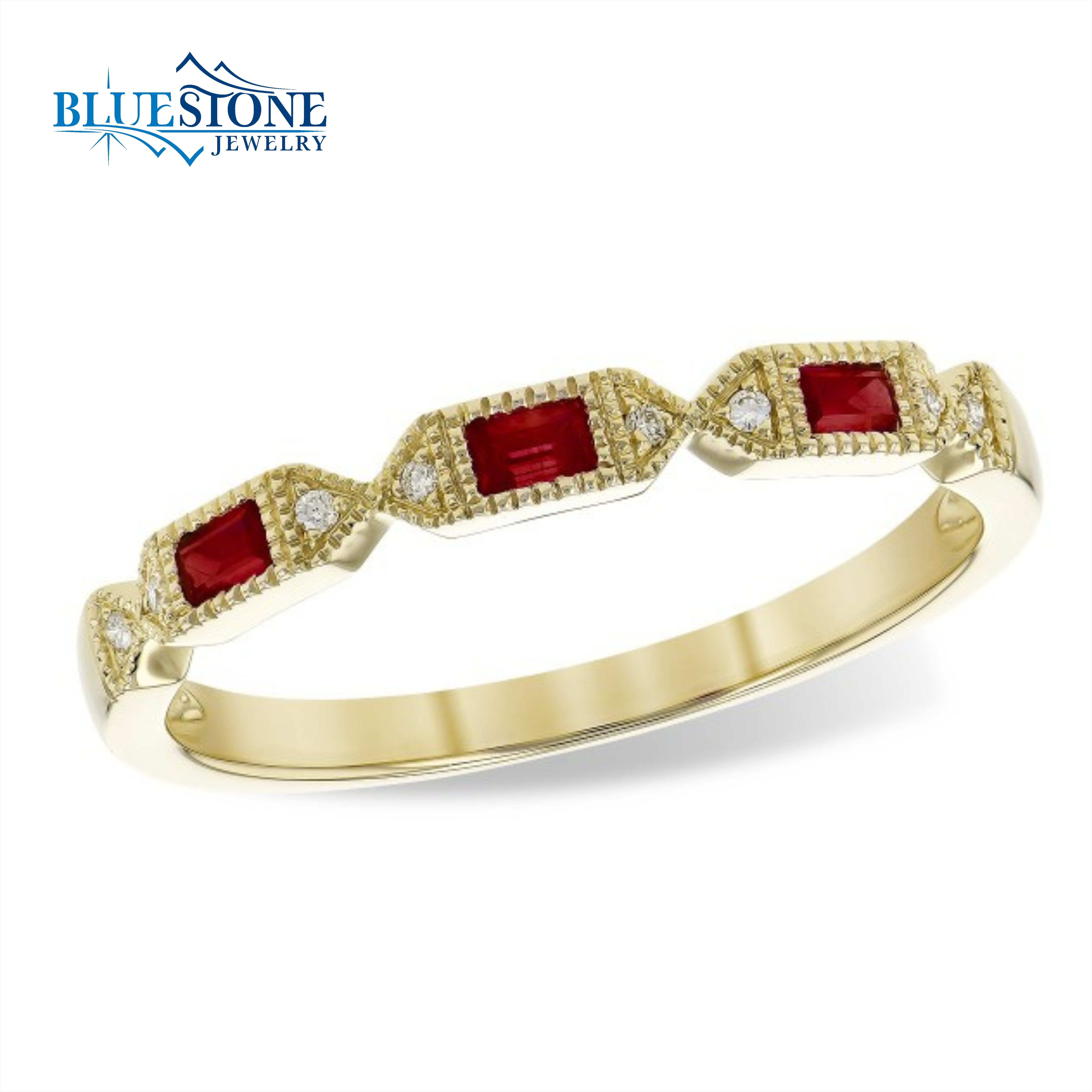 14 Karat Yellow Gold Ring with 3 Baguette Ruby Gemstones and 8 Round Diamonds at 0.14 Carats Total Weight. G SI1 Quality.Ring Size 7.