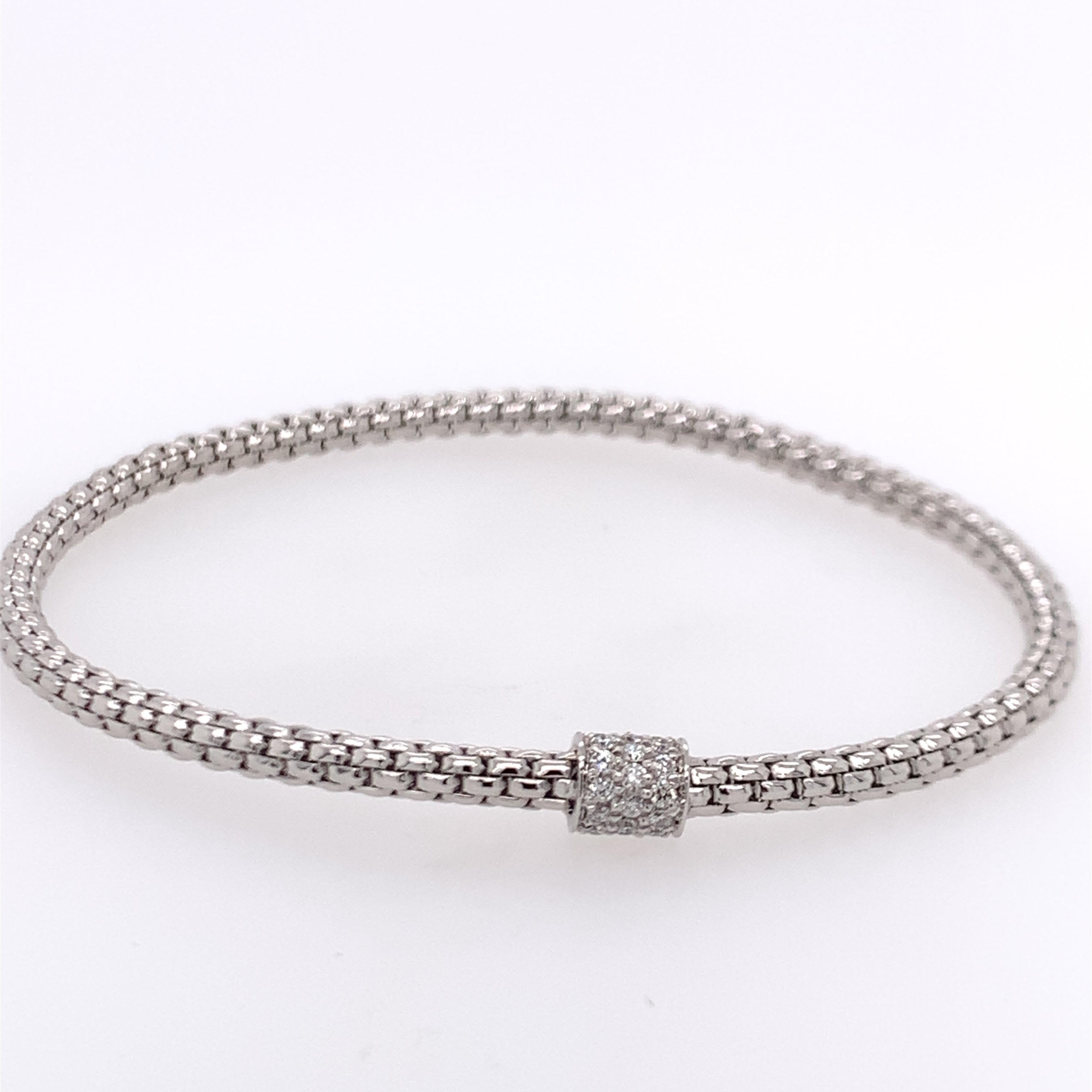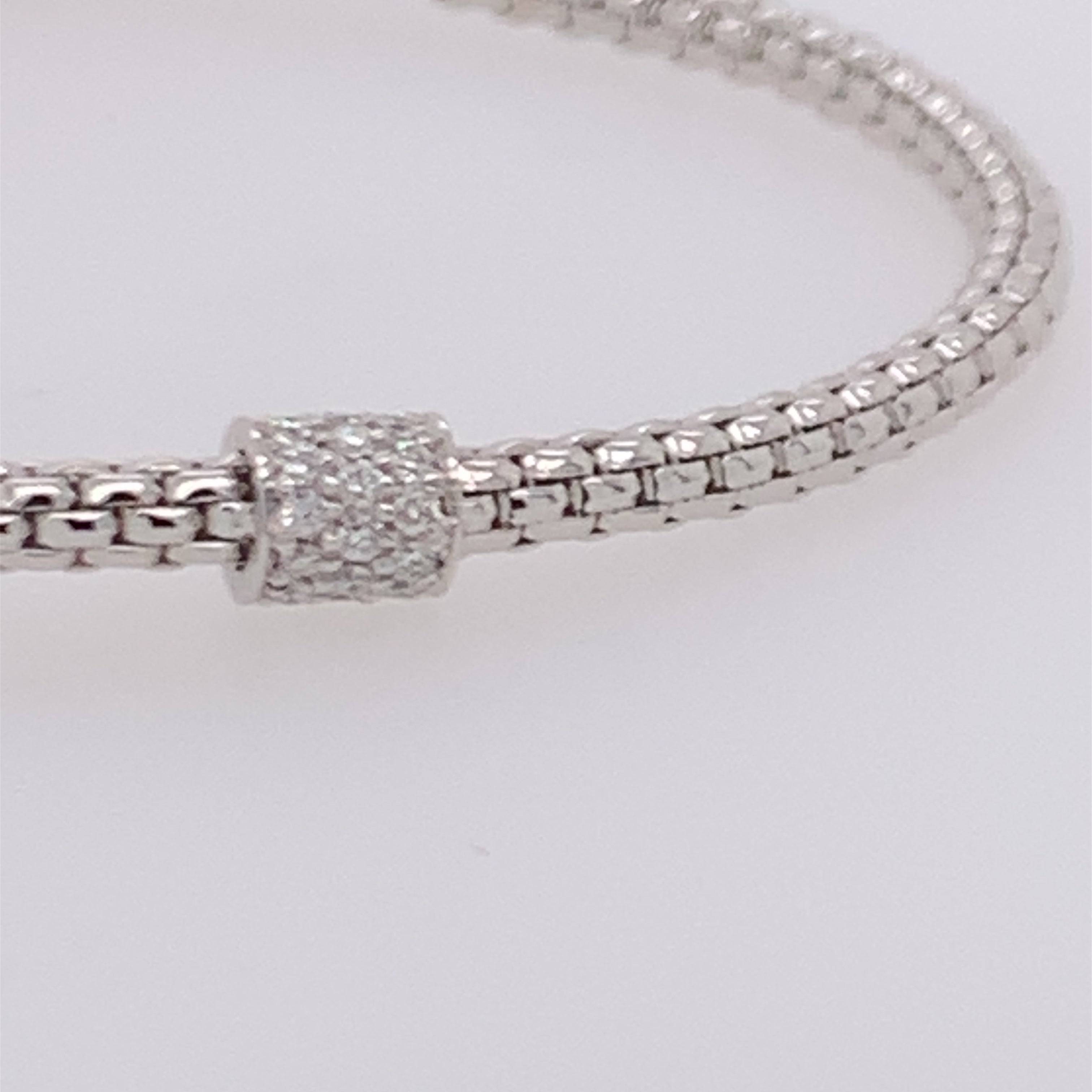 18 Karat White Gold Stretchable Bracelet with 23 Round Diamonds at 0.19 Carats Total Weight G VS.6.1 inches in length (15.5cm).4.8 Grams in overall finished weight.Other sizes are available. Please inquire.
