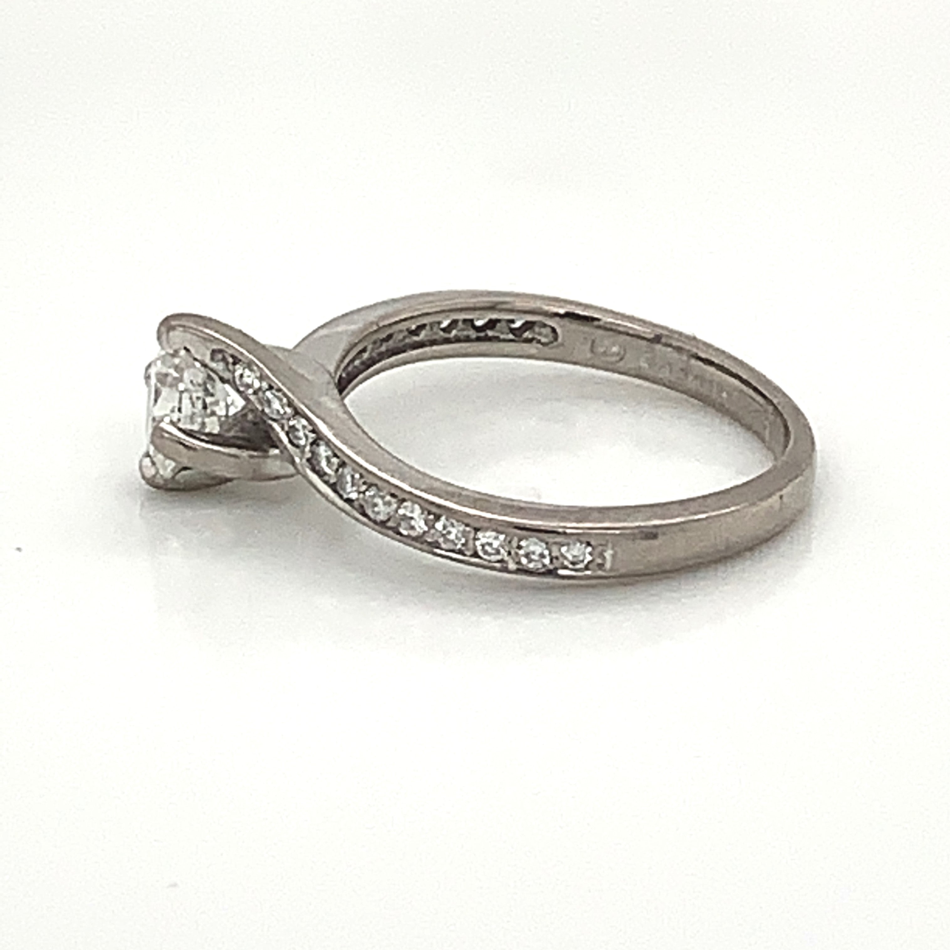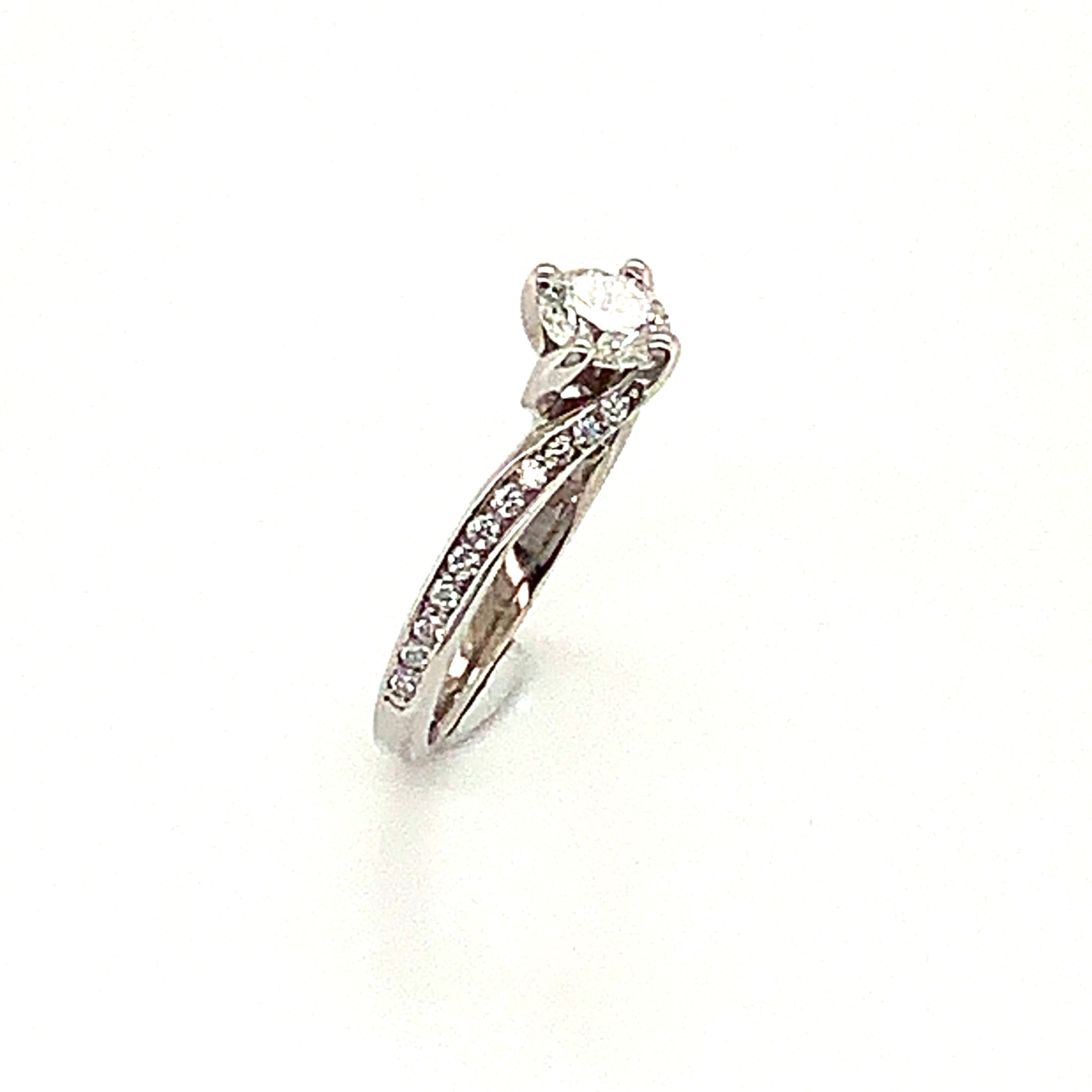 18 Karat White Gold Engagement Ring with a 0.50 Carat Round Brilliant Cut Diamond G/H SI1 Quality Diamond & 22 Round Diamonds at 0.16 Carats Total Weight G/H Si1 Quality Diamonds.Ring Size 5.25.