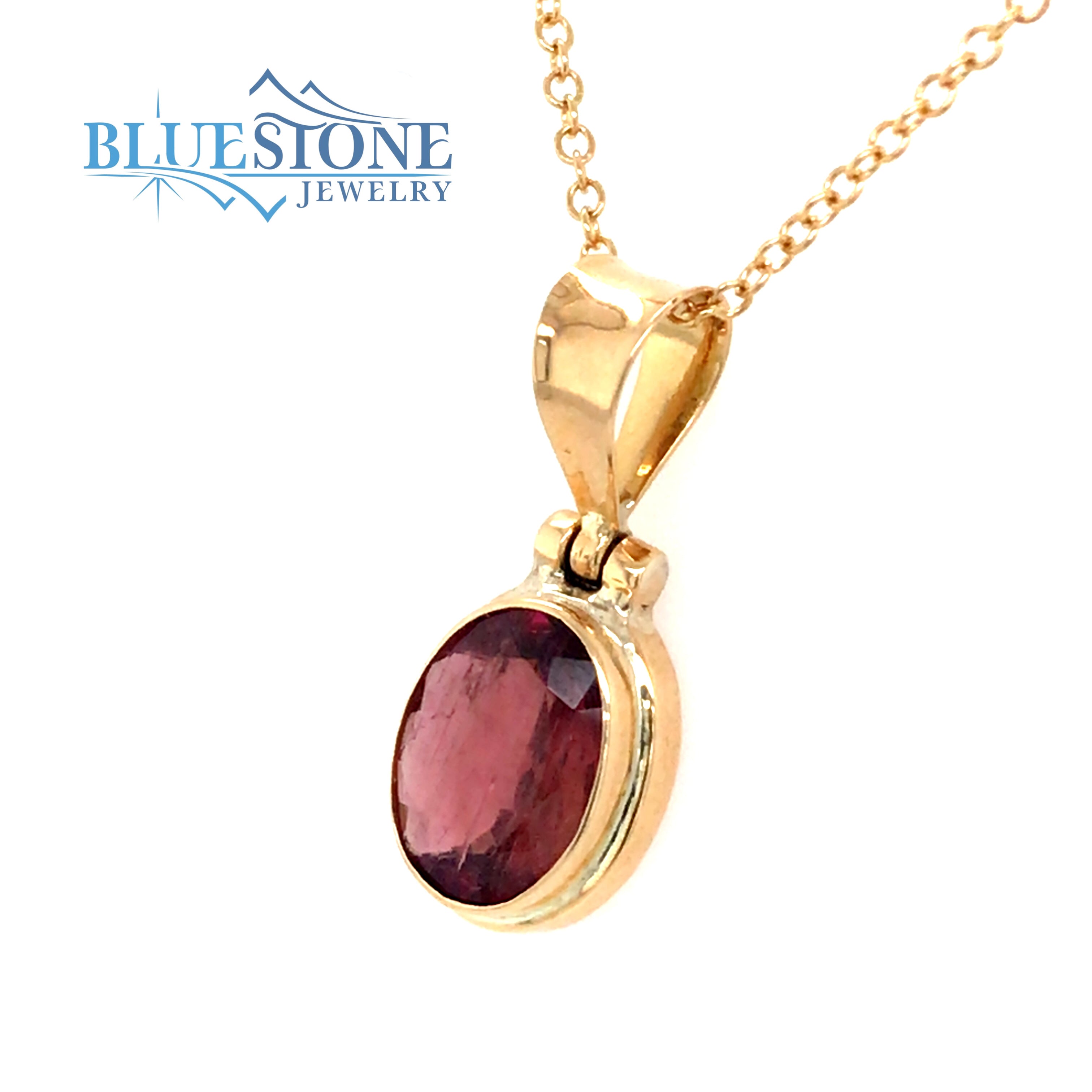 18 Karat Yellow Gold Necklace with One 7mm x 9mm Oval Pink Tourmaline Pendant. Comes on an 18 Inch 18 Karat Yellow Gold Rolo Chain.Local Lake Tahoe Artist.