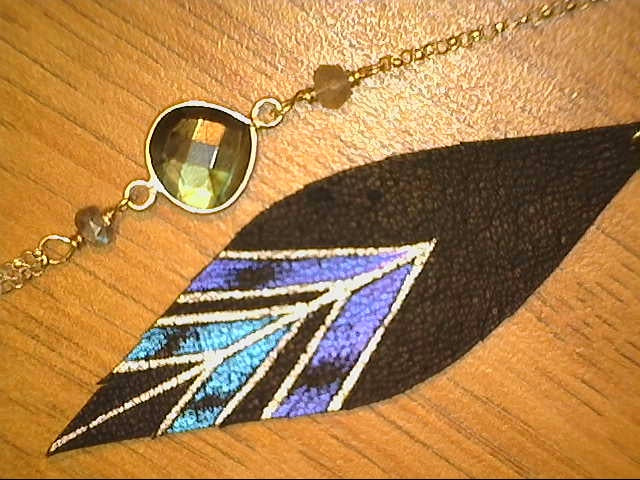 18" SS Chevron Leather Feather necklace with white Labradorite. Purple and blue design with silver