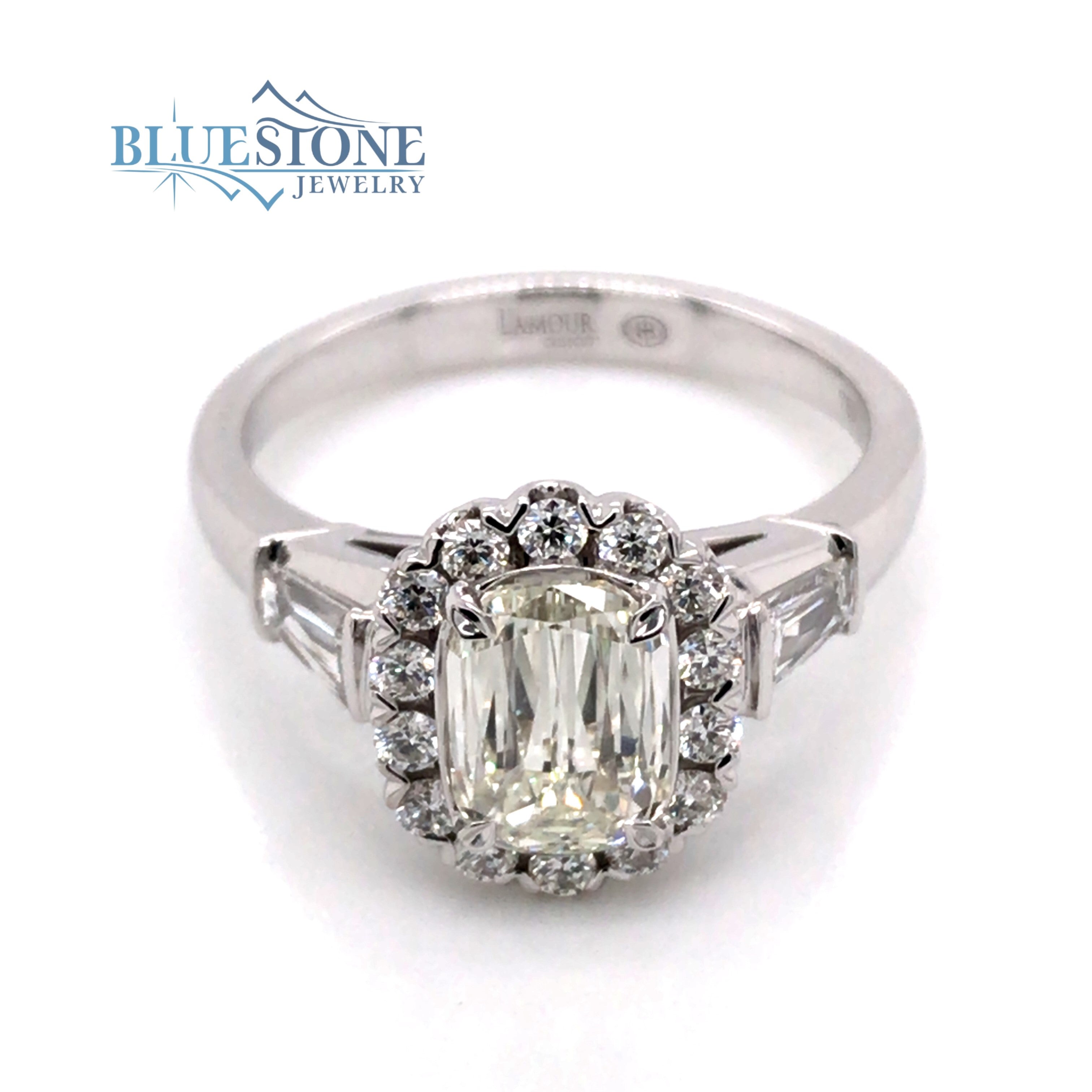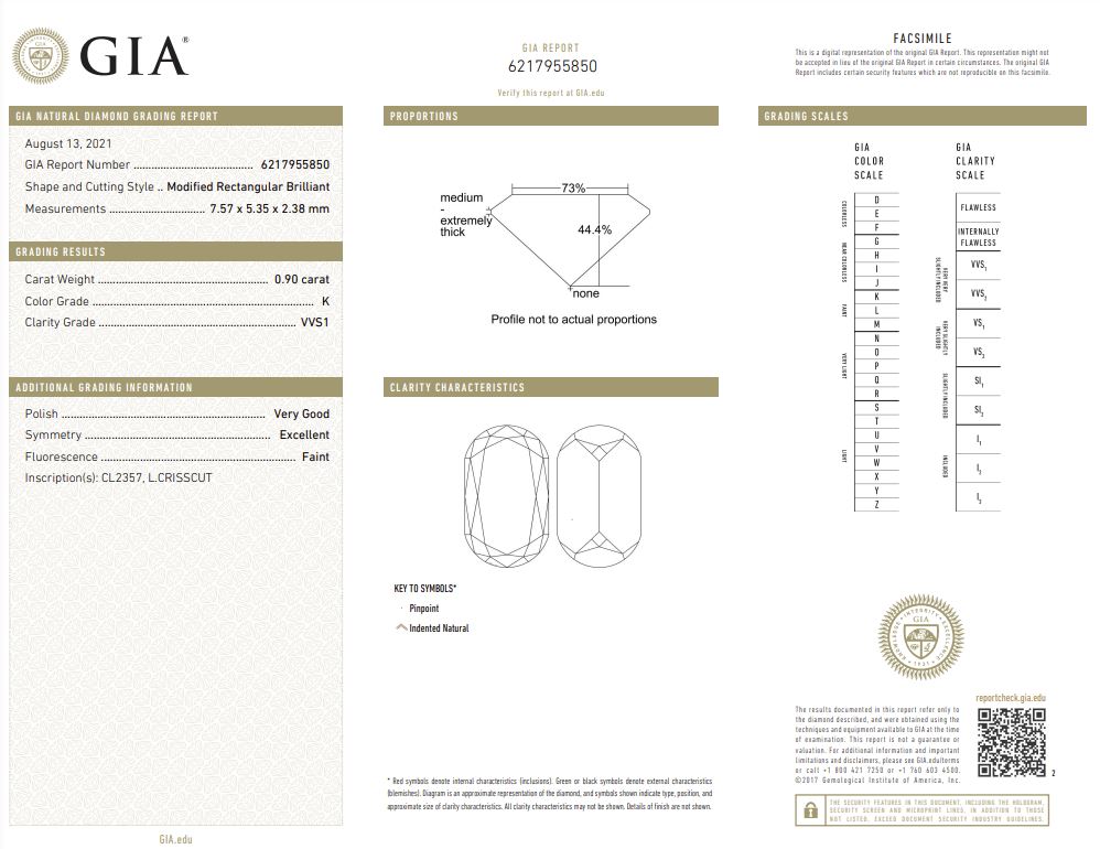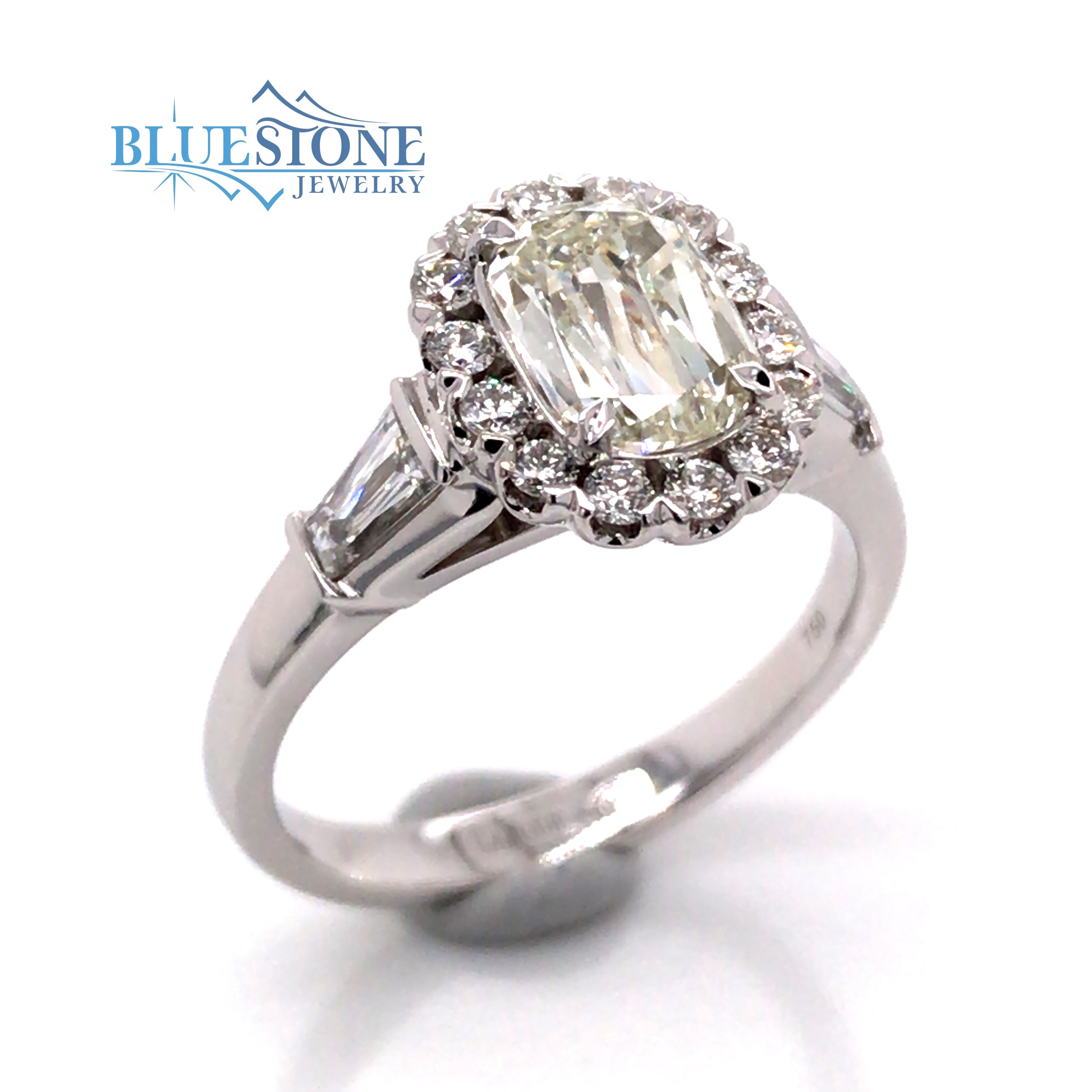 18 Karat White Gold Engagement Ring with a 0.90 Carat Specialty Oval/Emerald Cut Diamond at K VVS1 Quality Diamond Center Stone GIA Report#6217955850, (2)Two Tapered Baguette Diamonds at 0.40 Carats Total Weight I SI1 Quality & (14)Fourteen Round Diamonds at 0.26 Carats Total Weight of I SI1 Quality Diamonds.Ring Size 6.5 with an overall finished weight of 4.8 grams.Serial Number M48022Specialty Oval/Emerald Cut face up to 50% larger than traditional Oval or Emerald Cut Diamonds.*Can be special ordered or re-sized per request. Please contact for details*