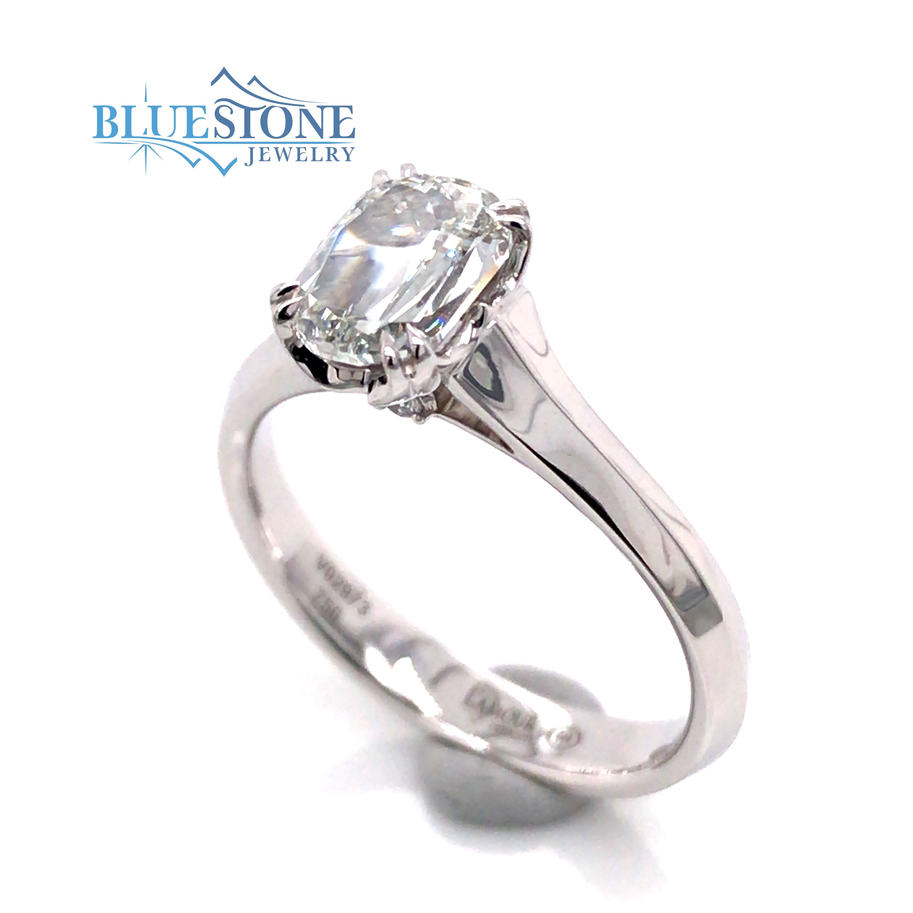 18 Karat White Gold Engagement Ring with 0.90 Carat Specialty Emerald/Oval Cut Diamond H VS2 GIA Report# 2213873018 and 2 Round Diamonds at 0.03 Carats Total Weight G SI1Ring Size 6.25 at an overall finished weight of 4.1 grams.Serial Number V02973This Center Stone Specialty Oval/Emerald Cut face up to 50% larger than traditional Oval or Emerald Cut Diamonds.*Can be special ordered or re-sized per request. Please contact for details*