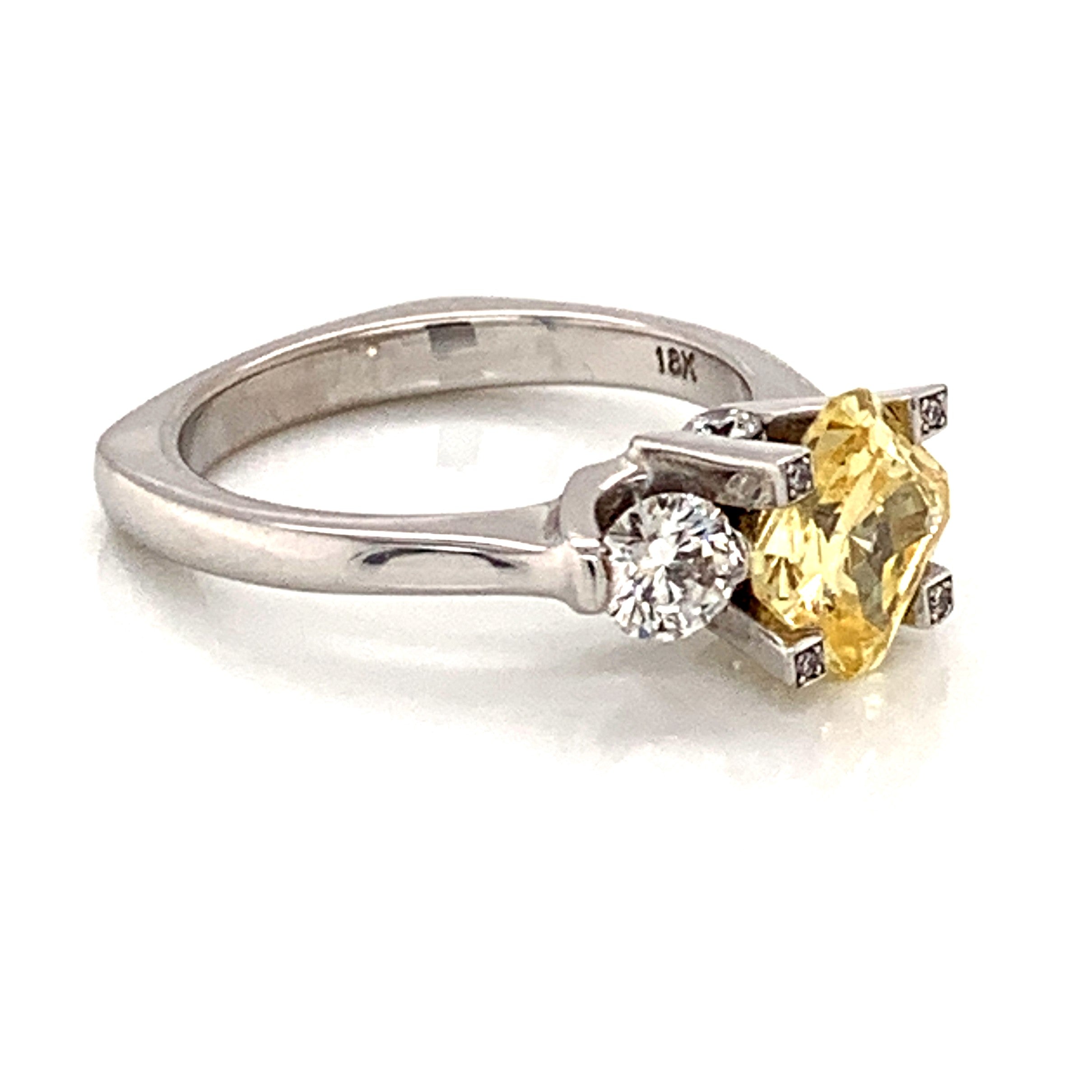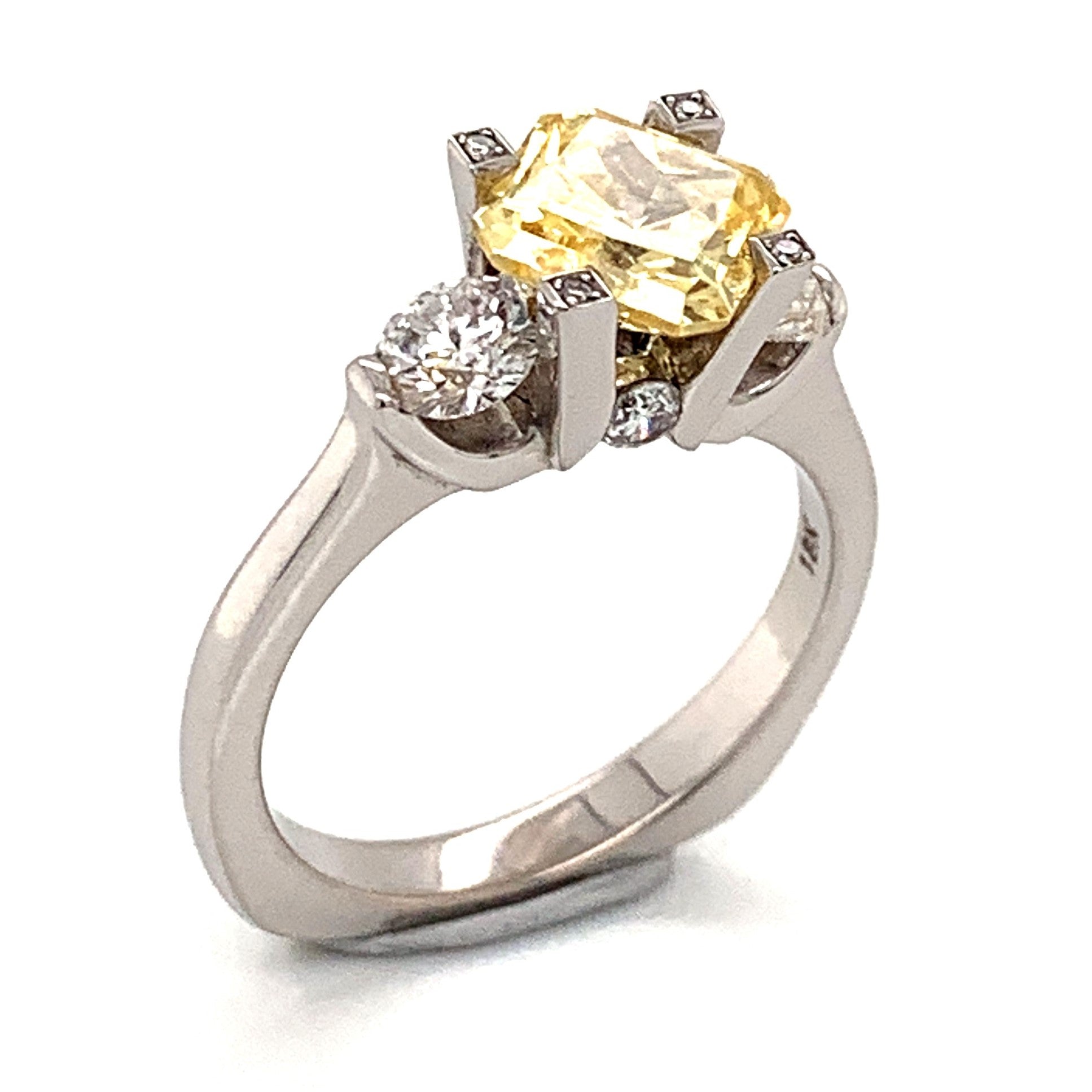 18 Karat White Gold Palladium Engagement Ring with a 7 millimeter Fancy Yellow Radiant Cut Cubic Zirconia & 8 Round Diamonds at 0.78 Carats Total Weight of F/G VS Diamonds.Ring Size 7 at an overall finished weight of 6.9 grams. ***30% OFF***