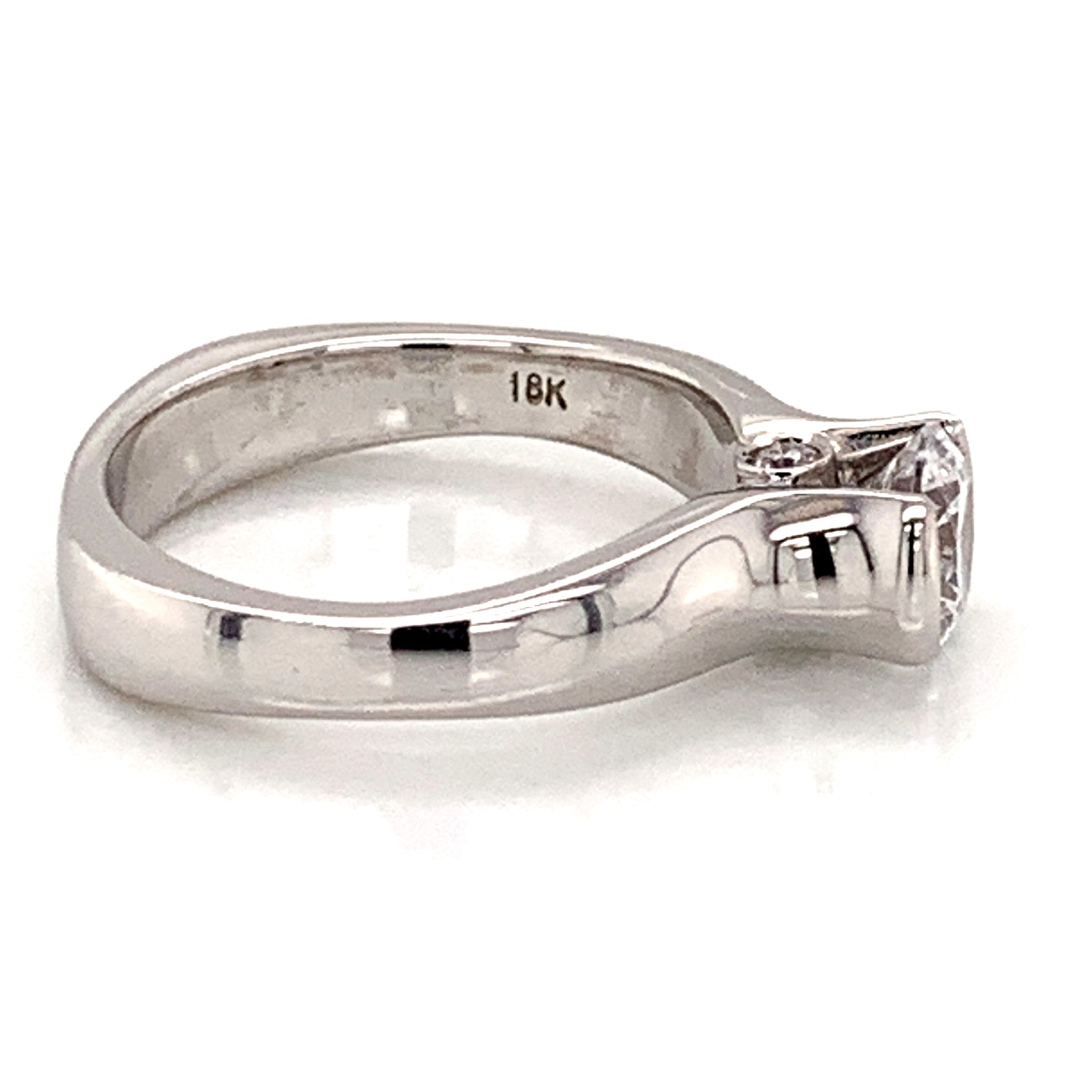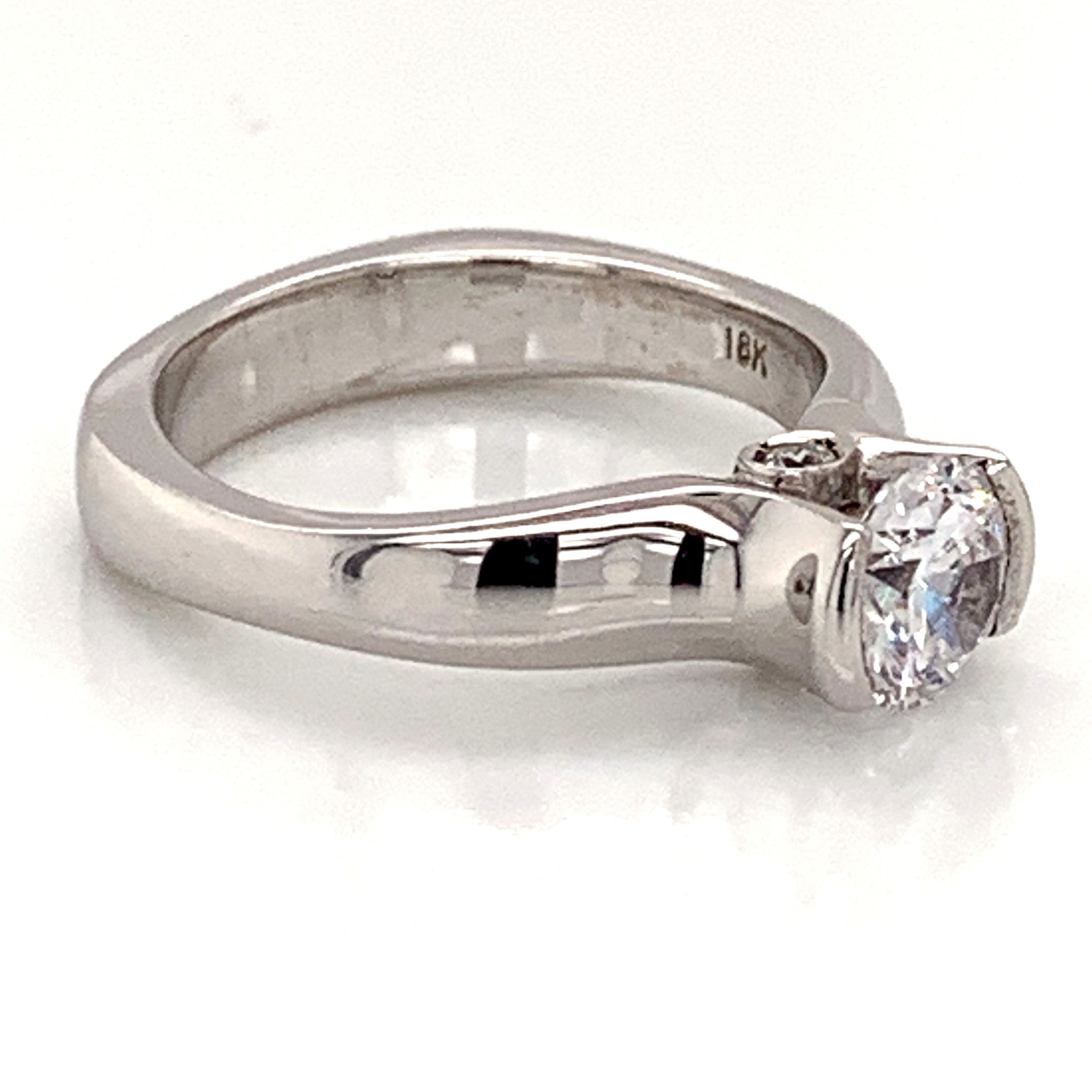 18 Karat White Gold Modern/Clean Engagement Ring with a 6.5mm Round Cubic Zirconia(6.5mm is equivalent to the size of a 0.94ct to 1.06 Carat Round Diamond) & 2 Round Surprise Diamonds 0.06 Carats Total Weight F/G VS quality Diamonds.Ring Size 6.75 at an overall finished weight of 7.9 grams.