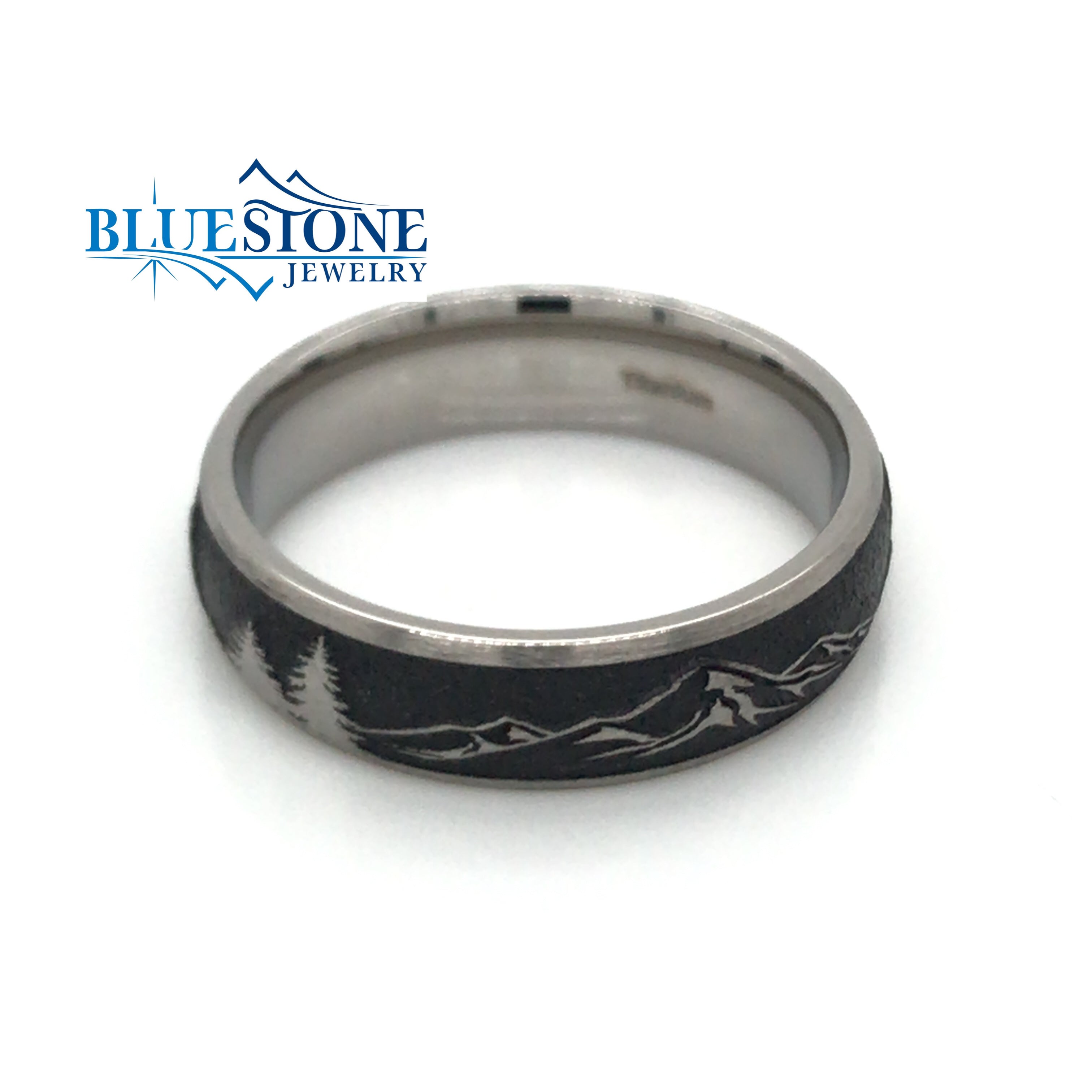 6mm Titanium Truckee Tahoe Mountains & Trees Ring with Black Cerakote(size10.25)