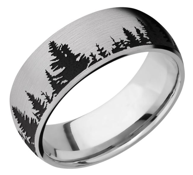 Titanium 8mm Domed Wedding Band or Fashion Ring Truckee Tahoe Trees. Ring features a Satin Finish and Black Cerakote detailing.Ring Size 10.5***Can be special ordered in other ring sizes. Please inquire for more information***