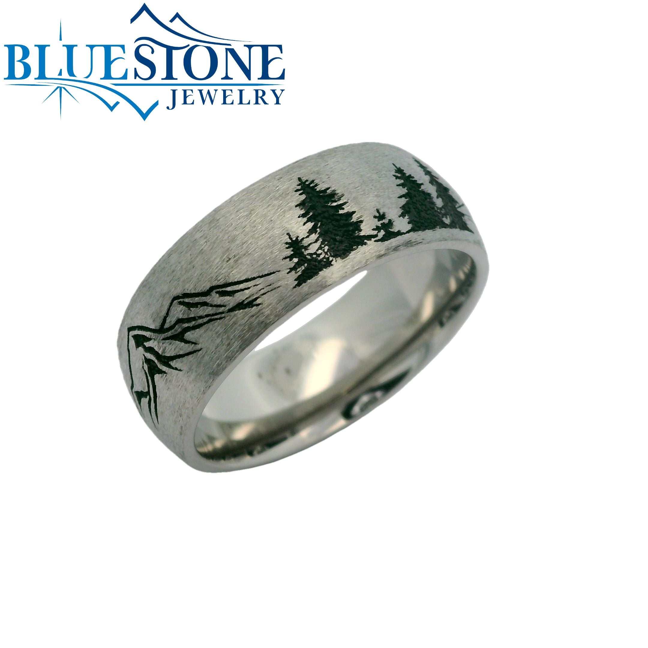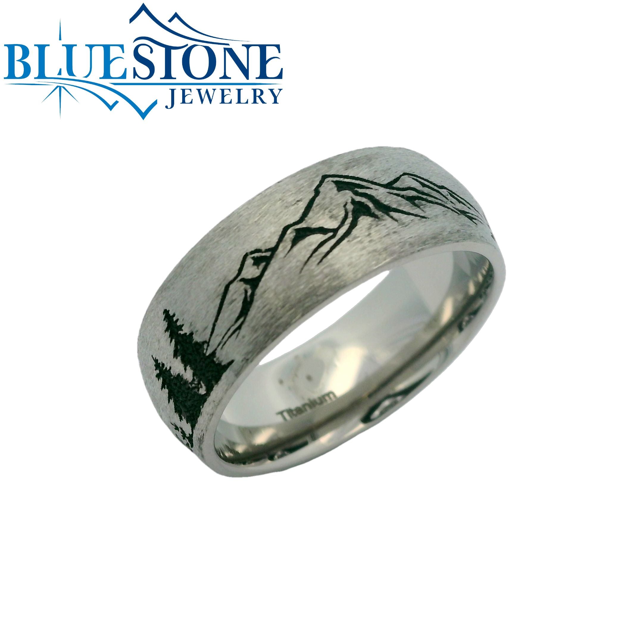 8mmTitanium Domed Band with Reverse Pattern of Truckee Tahoe Mountains and Trees. Stone finish with Black Cerakote.Ring Size 10***Can be made to order in different wood inlay options, width options, ring sizes, metal options. Prices will vary***