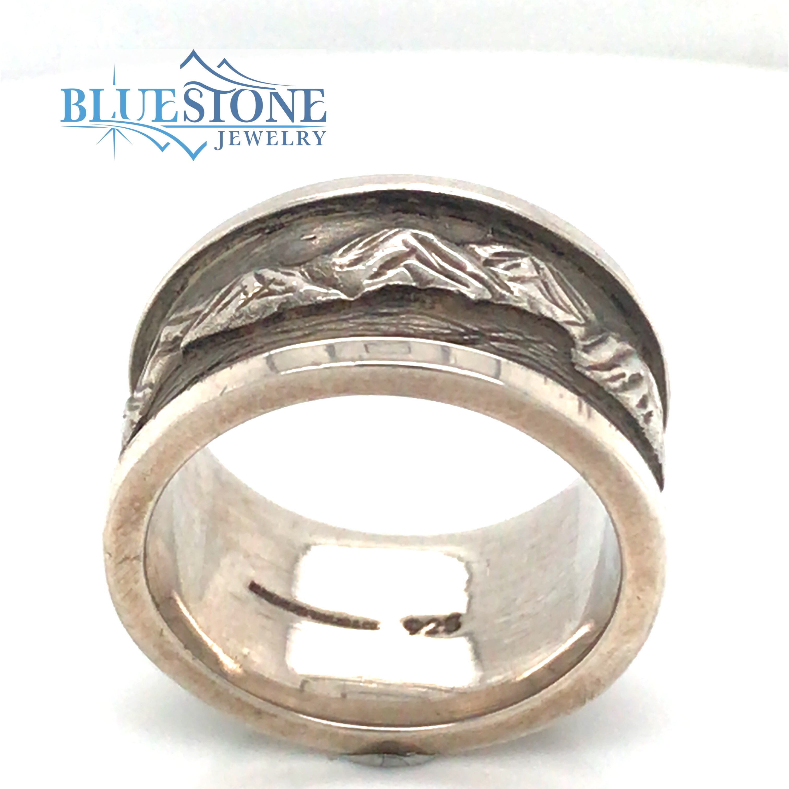 Argentium Silver Hand-Carved Lake Tahoe Mountain Ring.12.3mm wideRing size 9.5Bluestone Jewelry Exclusive Design