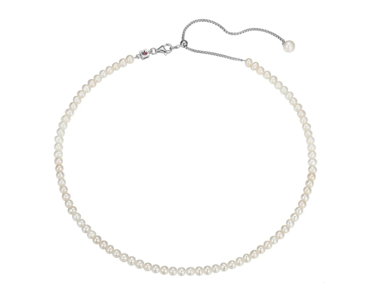Sterling Silver Rhodium Plated Adjustable Necklace with 85 Genuine Fresh Water Pearls and One Hidden Round Created Ruby which represents inner beauty, inner peace & inner strength. Can be worn between 14" to 18" long.
