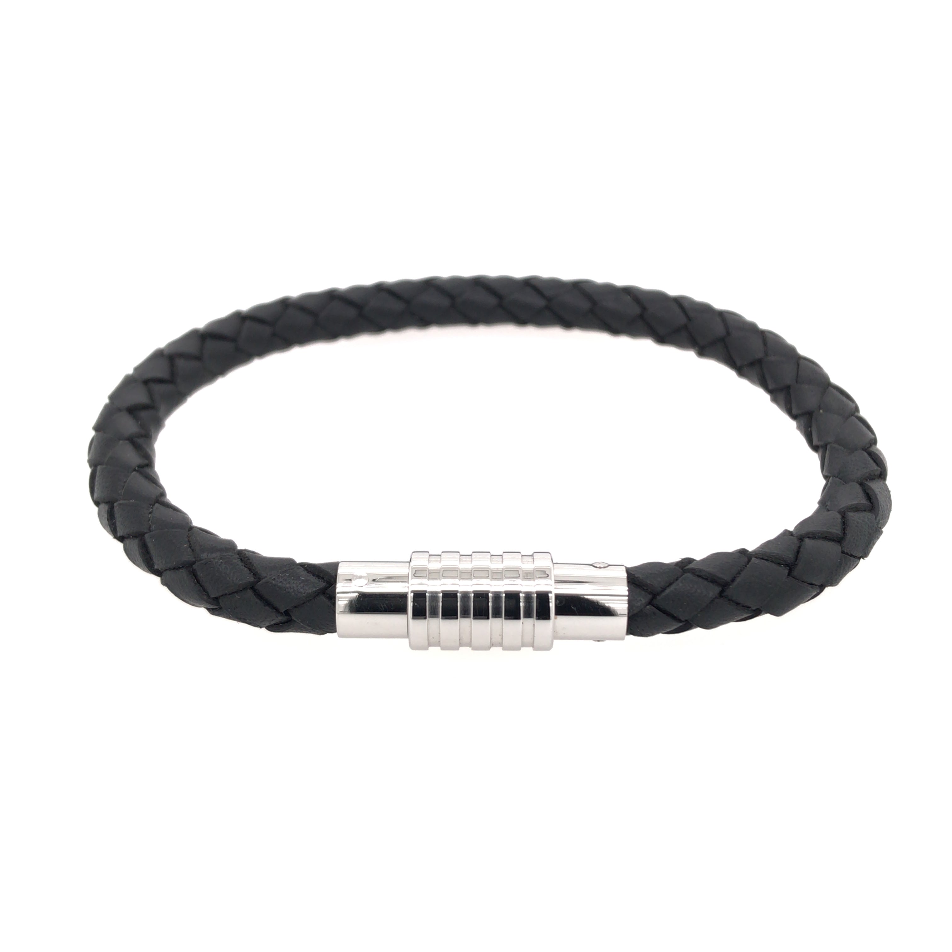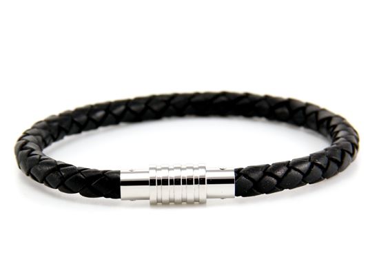 Black Leather Bracelet with Steel Clasp. Medium size measuring 8.25 inches (21cm).Inner clasp is magnetic for a strong hold while you spin the clasp closed for a tight and secure hold.