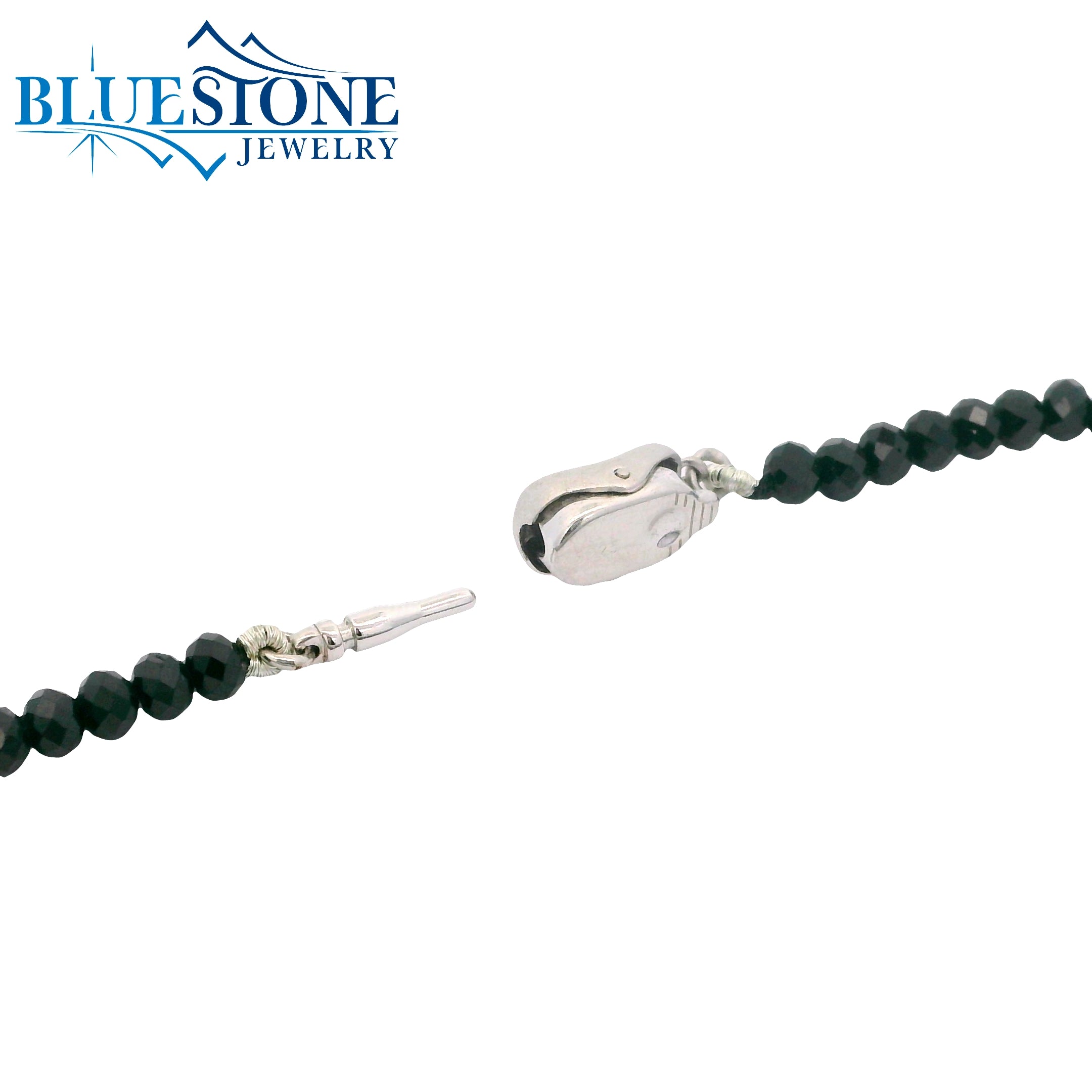 Black Spinel Beaded Necklace with a Sterling Silver and Diamond Center Bead and Sterling Silver Clasp. Spinel Beads Measure 3.9mm Wide. Necklace Length is 17.5" Long. Local Lake Tahoe Designer