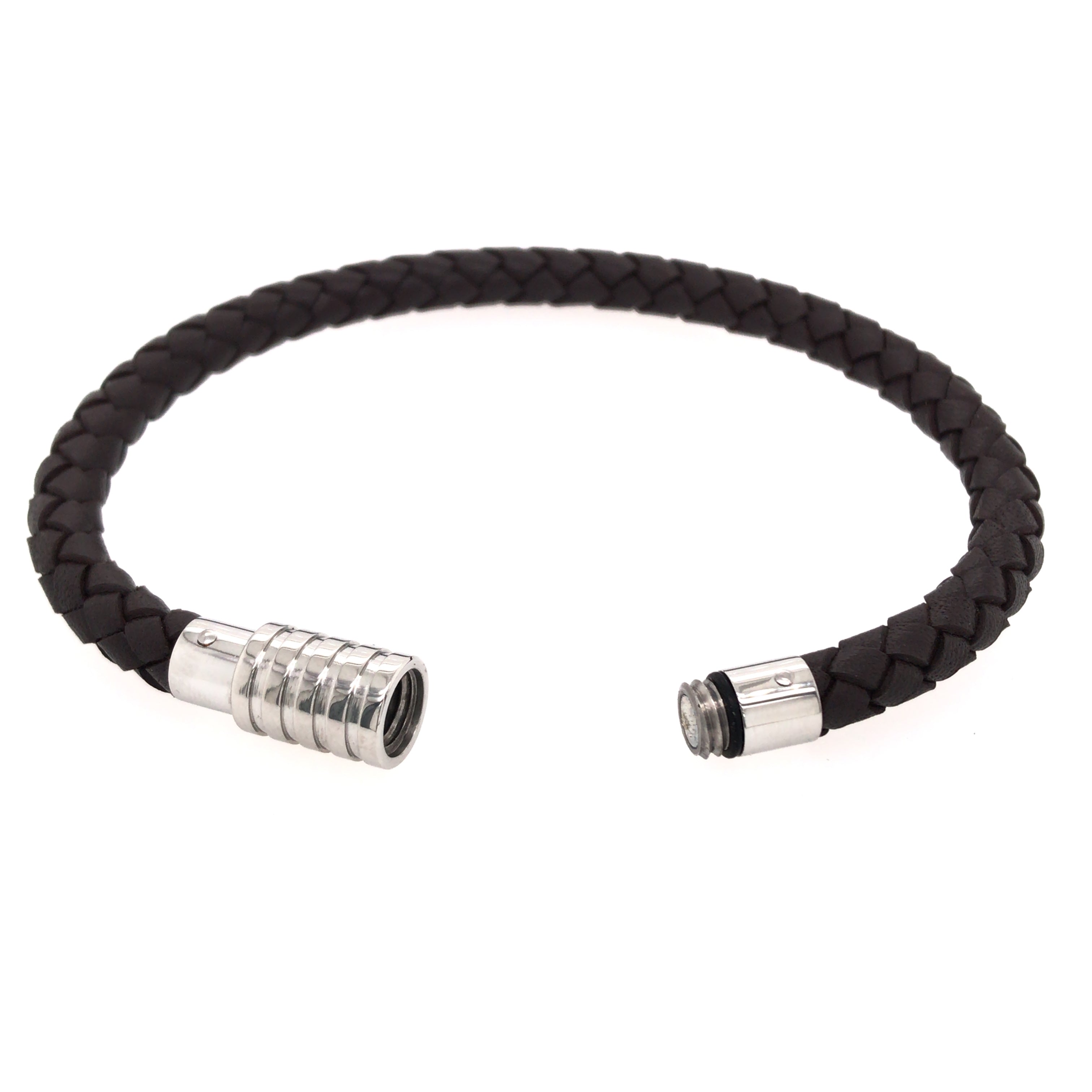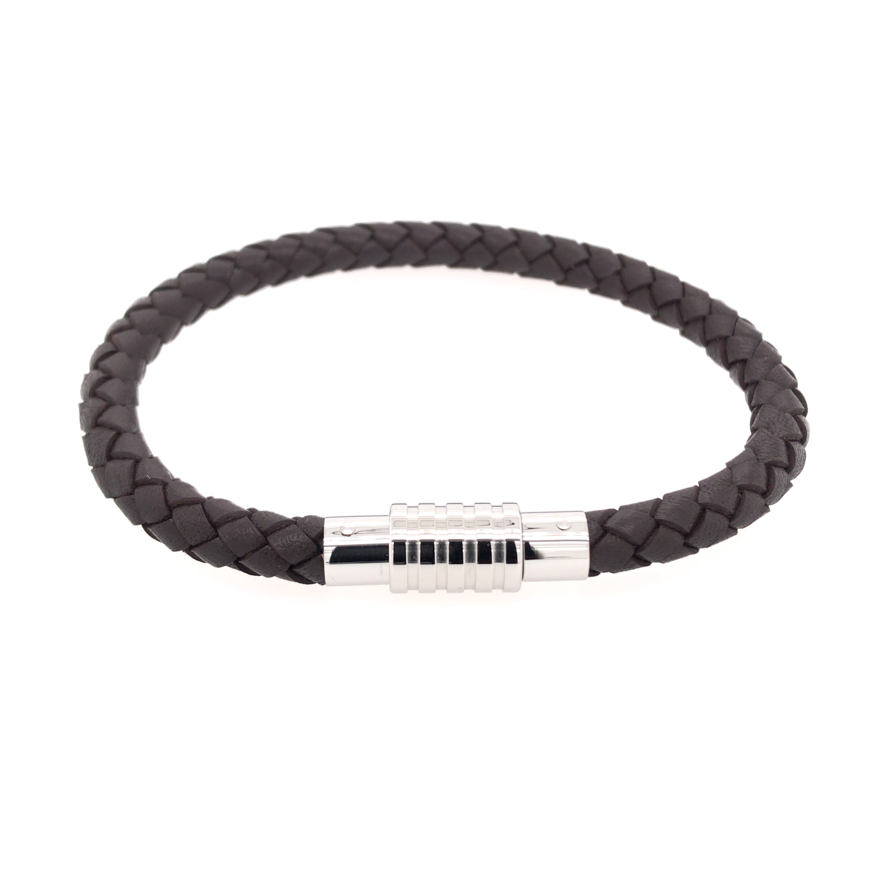 Brown Leather Bracelet with Steel Clasp. Medium size measuring 8.25 inches (21cm).Inner clasp is magnetic for a strong hold while you spin the clasp closed for a tight and secure hold.