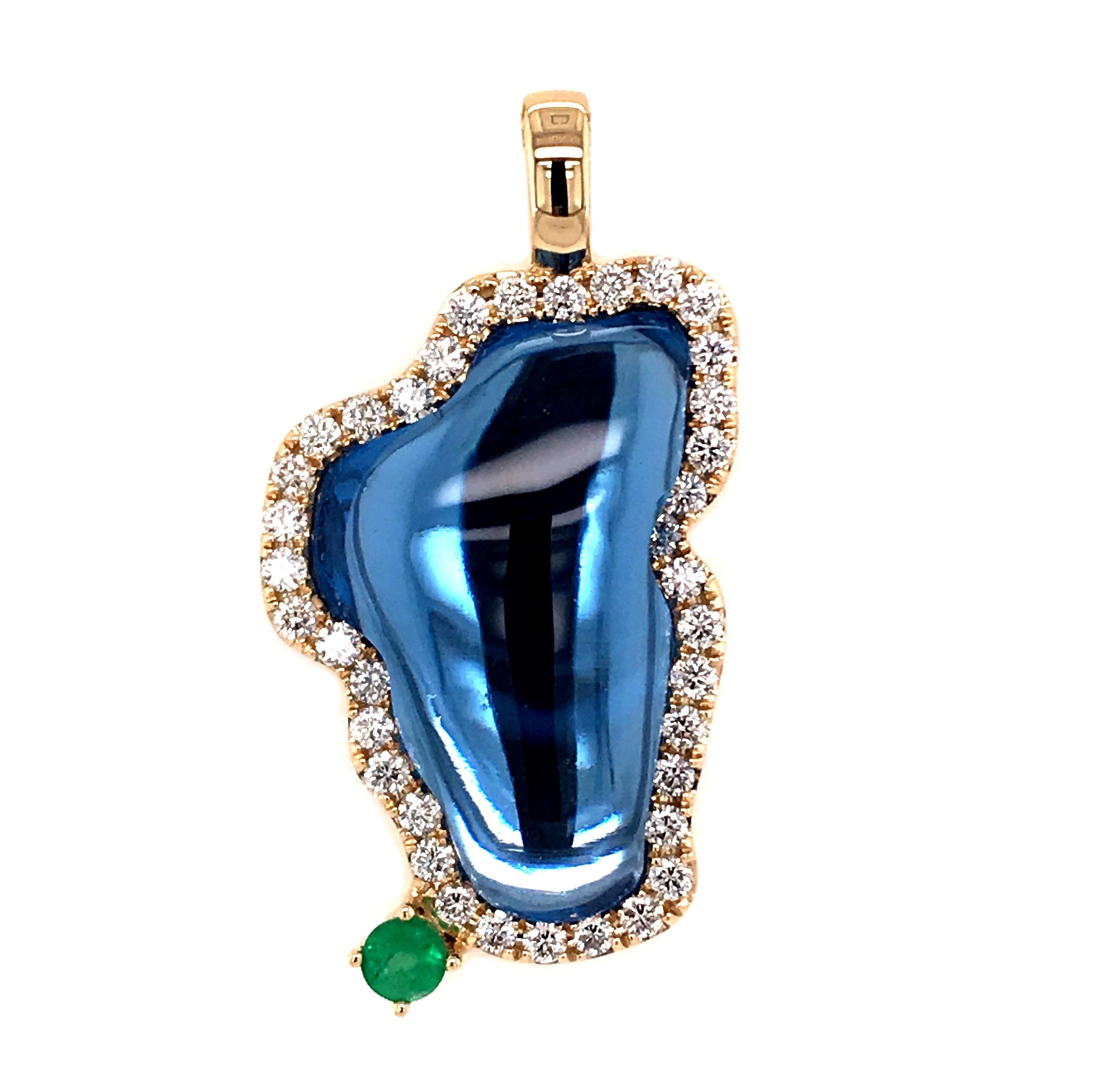 Extra Large 14 Karat Yellow Gold Lake Tahoe Outline Pendant with a 9.47 Carat Hydro Blue Topaz, 37 Round Diamonds at 0.68 Carats Total Weight of G Si1 Quality Diamonds and One Round 0.13 Carat Natural Emerald at the Location of Emerald Bay, CA. Backed with 14 Karat Yellow Gold to Enhance the Brilliant Color of the Hydro Blue Topaz. Measures 0.75 Inch by 1.25 Inches.Exclusive Bluestone Jewelry Collection.Chain is sold separately. Comes on an 18 inch metal alloy DISPLAY chain.